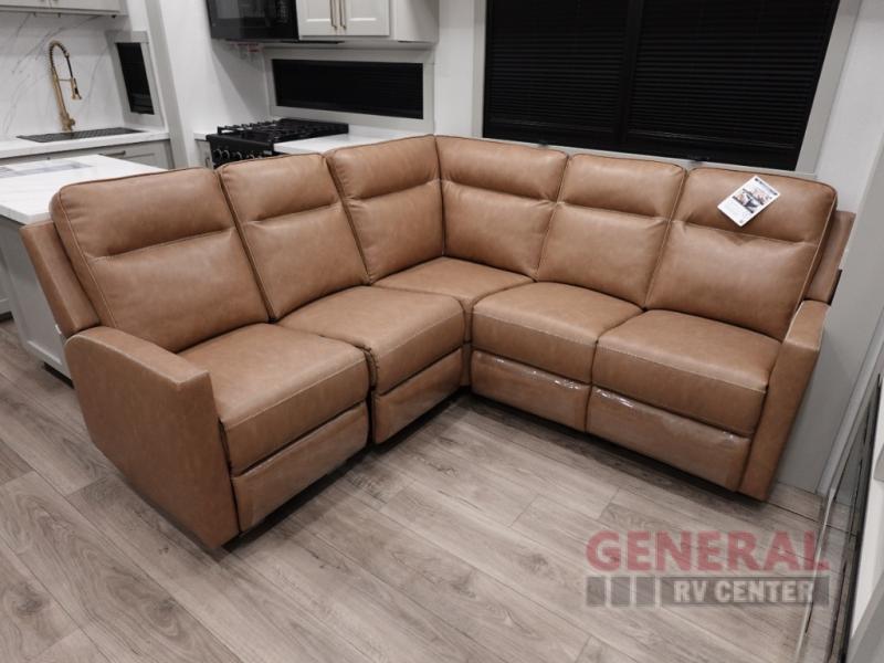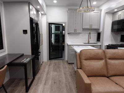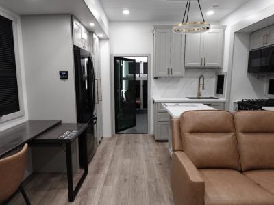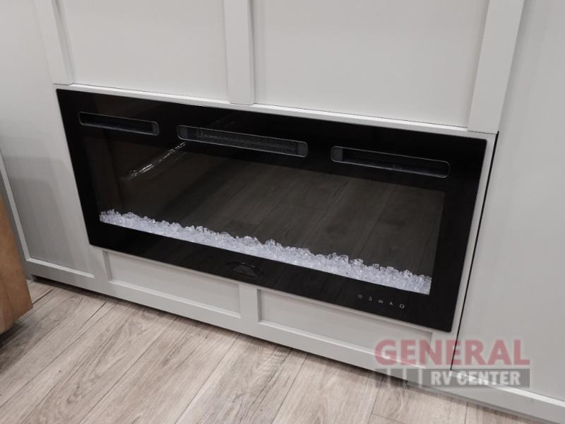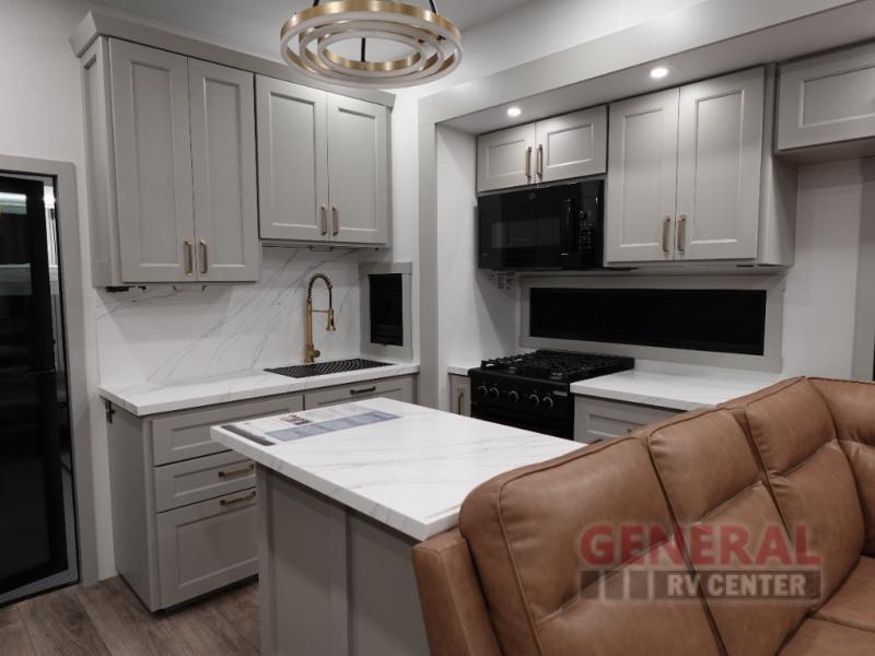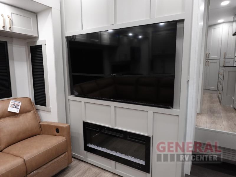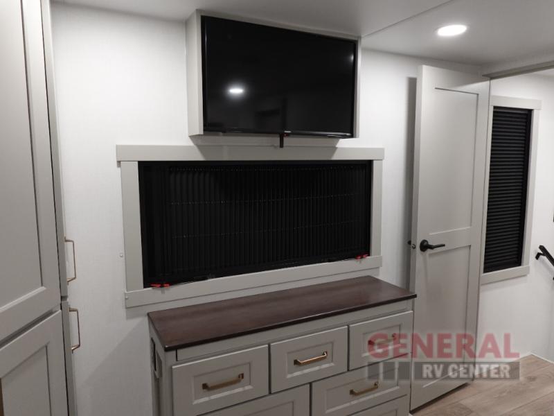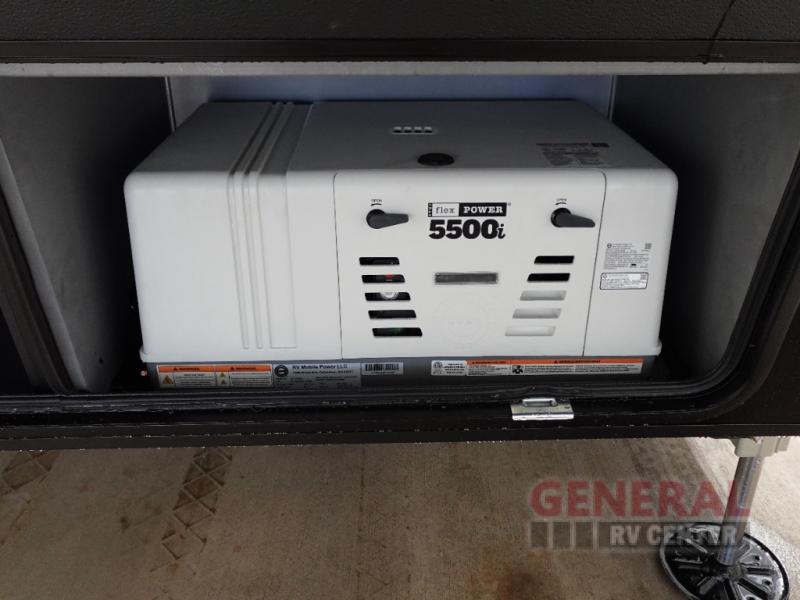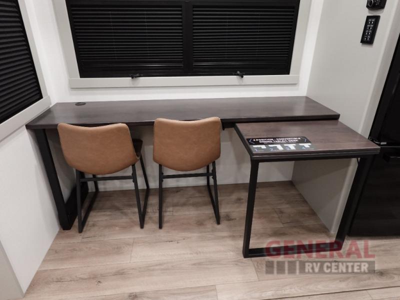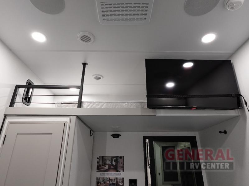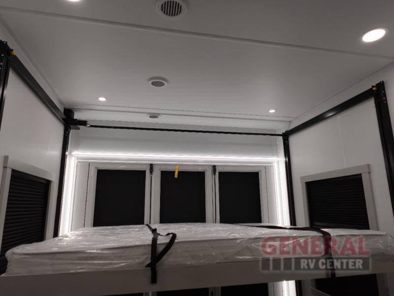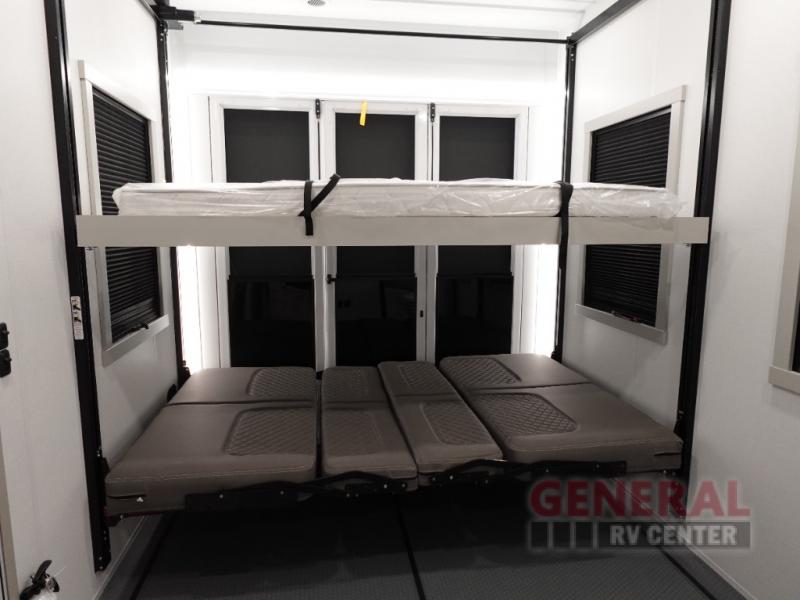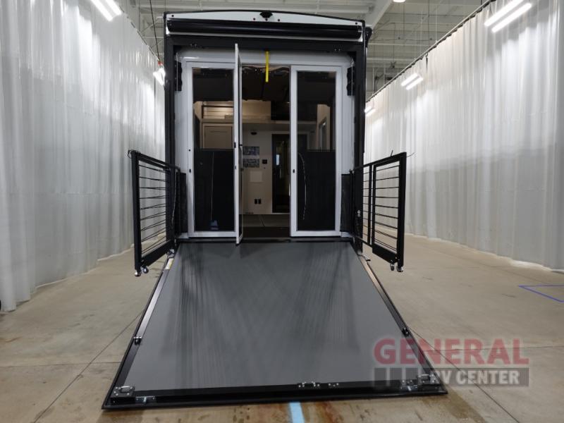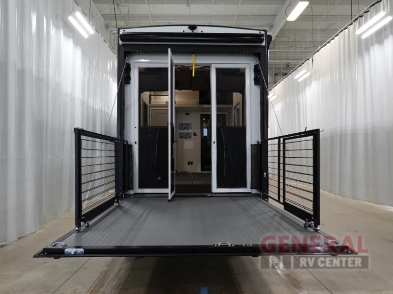 This toy hauler may just be the one you've been looking for! The garage/flex space with fold-away half bath walls will allow you to utilize the garage how you need it, plus there is an adjustable tie-down system, independent dual sofas, plus a loft for storage and a twin bed to sleep more campers! The garage patio with a 1,500 lb. capacity is another feature you are sure to love, especially with its own awning to keep you protected from the elements. Head to the kitchen to prepare meals with a 24" GE oven with a four burner range, a GE microwave with an air fryer, plus a spacious GE Energy Star 19 cu. ft. refrigerator. The island with two stools will let others visit with you while you cook, and there are even hidden dog bowls. You'll find the convertible dining table/L-desk will be accommodating since it can be use to dine at, and to get some work done. You may just find yourselves spending most of your time on the L-sofa in front of the TV and fireplace. A full bath is up front by the bedroom, and here you'll find neon shower lighting, a residential shower system, and pull-out linen storage to keep towels ready to use. After a day outdoors you'll love nothing more than coming back to your own bedroom with a king bed slide out, TV, a walk-in closet, and many more storage spaces. And we haven't even touched on the exterior features, like the 3-way pass-through storage, three power awnings, an air compressor to fill up tires, and the list goes on and on!