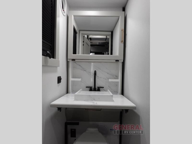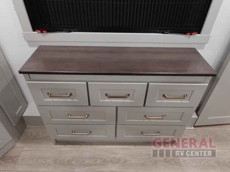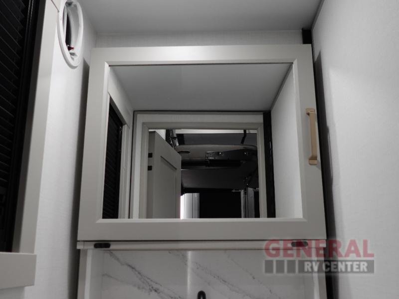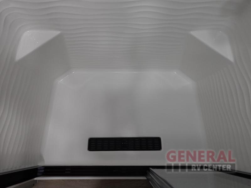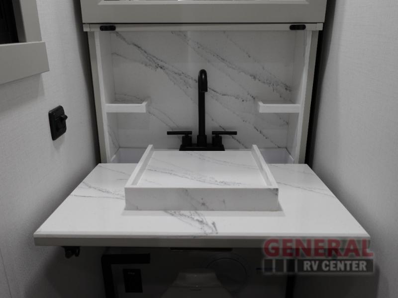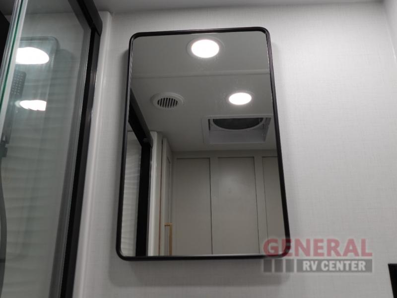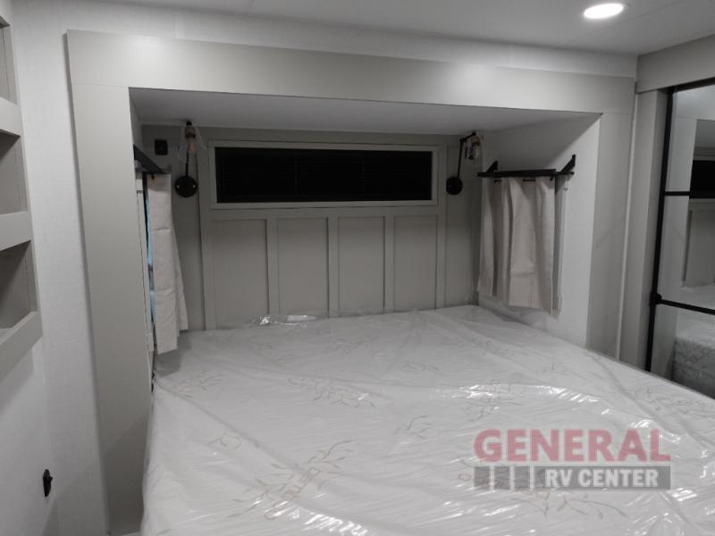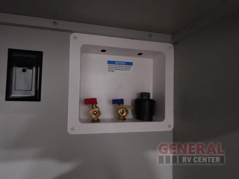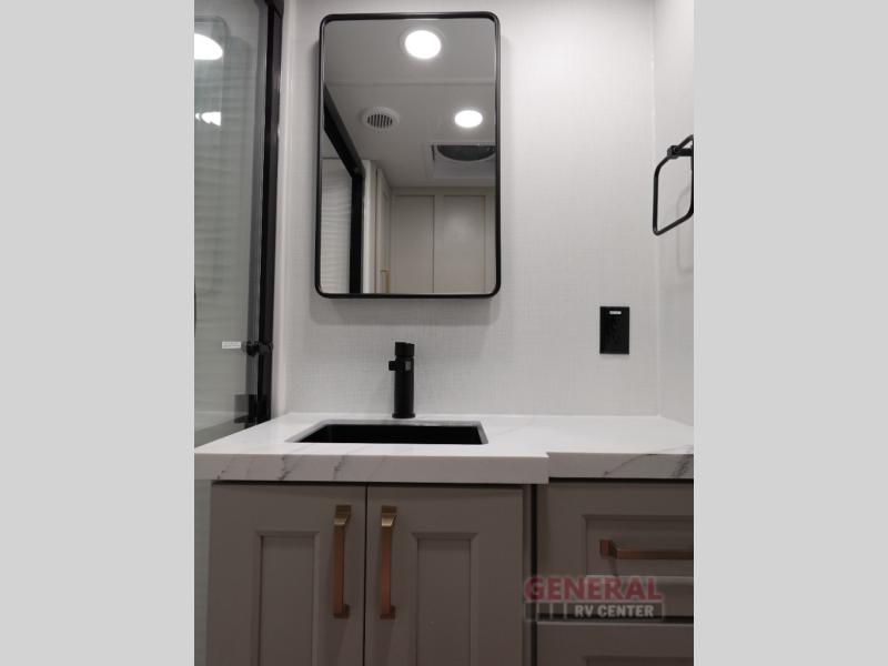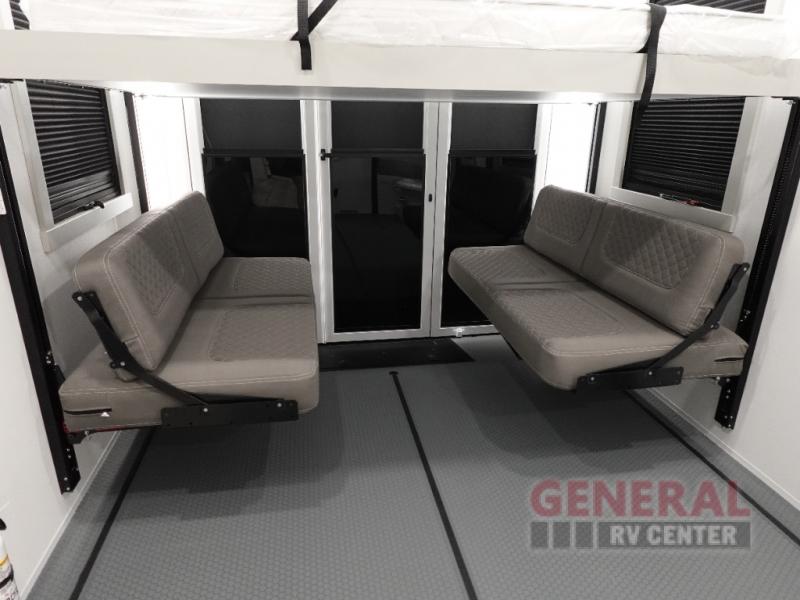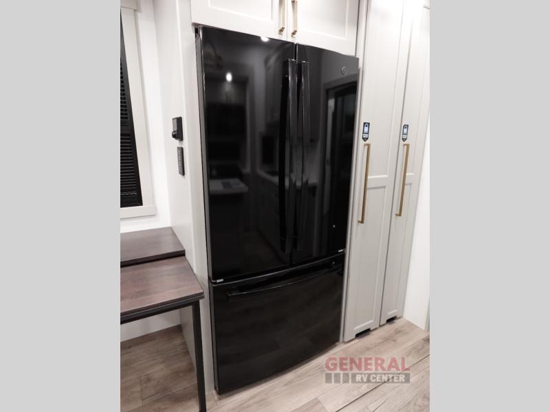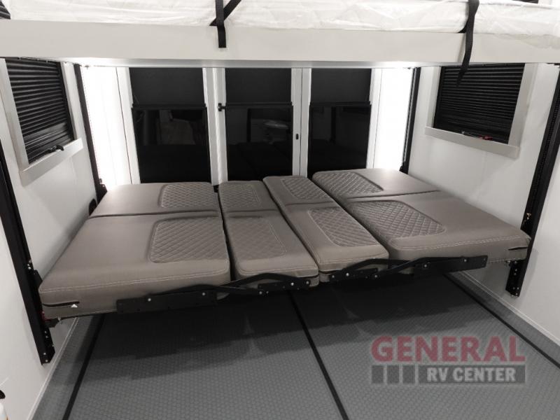 This toy hauler may just be the one you've been looking for! The garage/flex space with fold-away half bath walls will allow you to utilize the garage how you need it, plus there is an adjustable tie-down system, independent dual sofas, plus a loft for storage and a twin bed to sleep more campers! The garage patio with a 1,500 lb. capacity is another feature you are sure to love, especially with its own awning to keep you protected from the elements. Head to the kitchen to prepare meals with a 24" GE oven with a four burner range, a GE microwave with an air fryer, plus a spacious GE Energy Star 19 cu. ft. refrigerator. The island with two stools will let others visit with you while you cook, and there are even hidden dog bowls. You'll find the convertible dining table/L-desk will be accommodating since it can be use to dine at, and to get some work done. You may just find yourselves spending most of your time on the L-sofa in front of the TV and fireplace. A full bath is up front by the bedroom, and here you'll find neon shower lighting, a residential shower system, and pull-out linen storage to keep towels ready to use. After a day outdoors you'll love nothing more than coming back to your own bedroom with a king bed slide out, TV, a walk-in closet, and many more storage spaces. And we haven't even touched on the exterior features, like the 3-way pass-through storage, three power awnings, an air compressor to fill up tires, and the list goes on and on!
