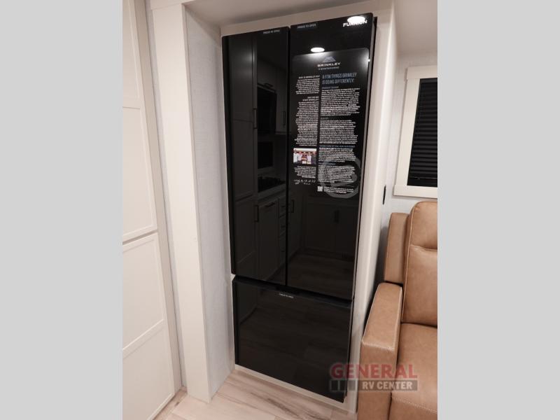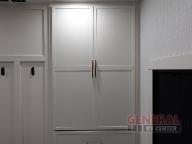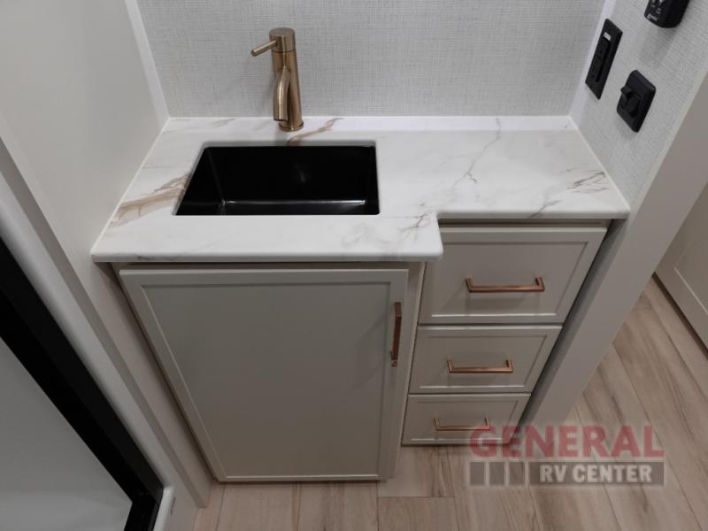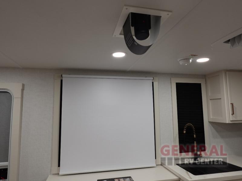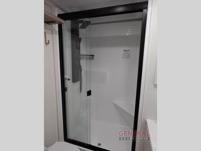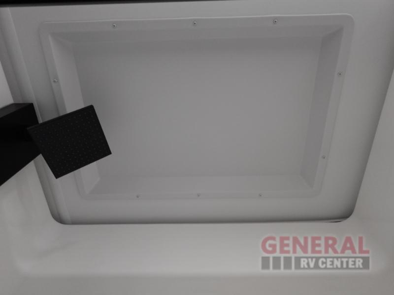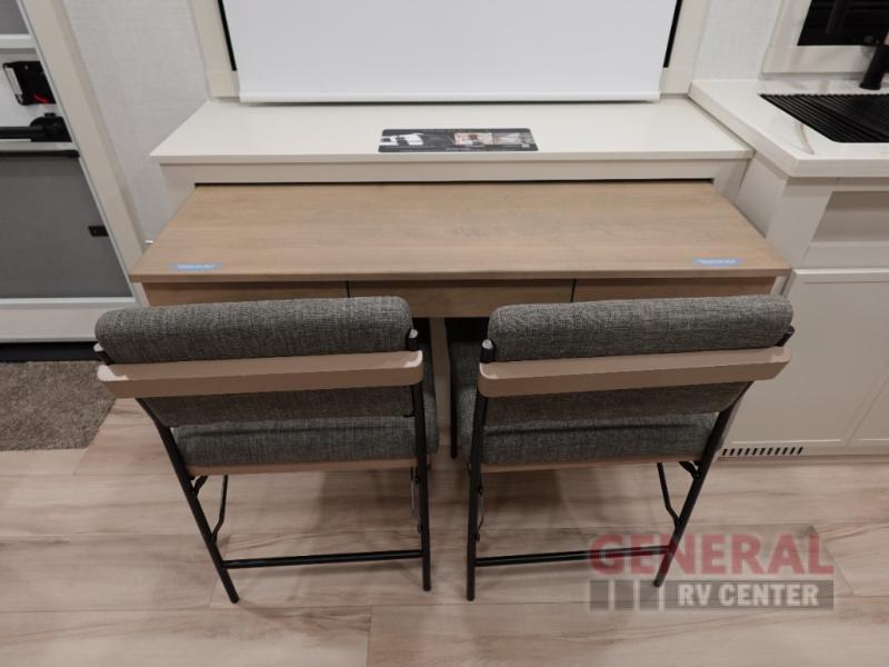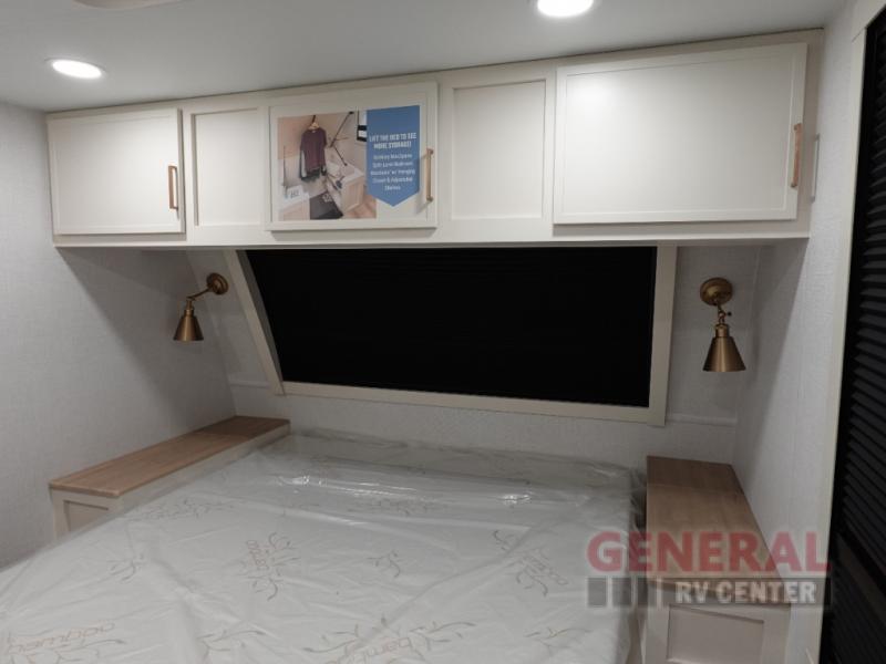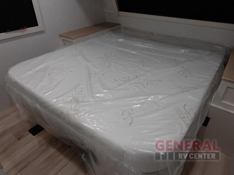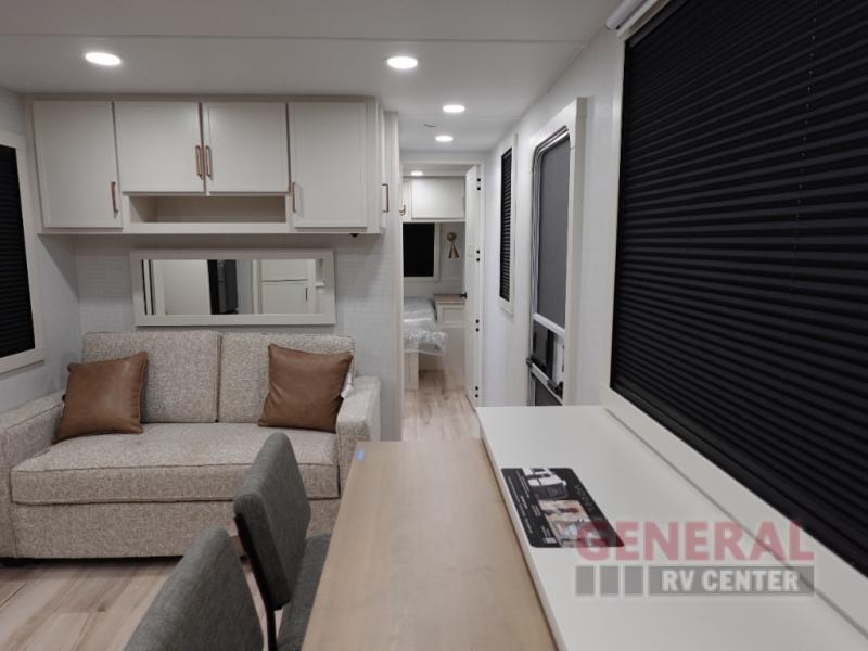 This travel trailer can comfortably sleep four with the king bed in the private bedroom and the tri-fold sofa in the main living area! The full bath features a spacious 42" x 30" shower with a built-in seat and Maxxair fan to name a few comforts. The front private bedroom features a 66" x 80" king bed with a MaxSpace Split-Level Wardrobe underneath to store shoes, clothes, and more! A slide out in the combined living area and rear kitchen makes your space more open, and you'll enjoy relaxing on the theater seating here in the evenings. The full kitchen includes a three burner stovetop, residential 30" convection microwave, 12 cu. ft. 12V refrigerator, plus a trash bin and Stow N' Go paper towel holder for added convenience. You can choose to eat outdoors under the 19' electric awning with LED lights or stay inside to dine at the pull-out dining table with a drawer for added storage!