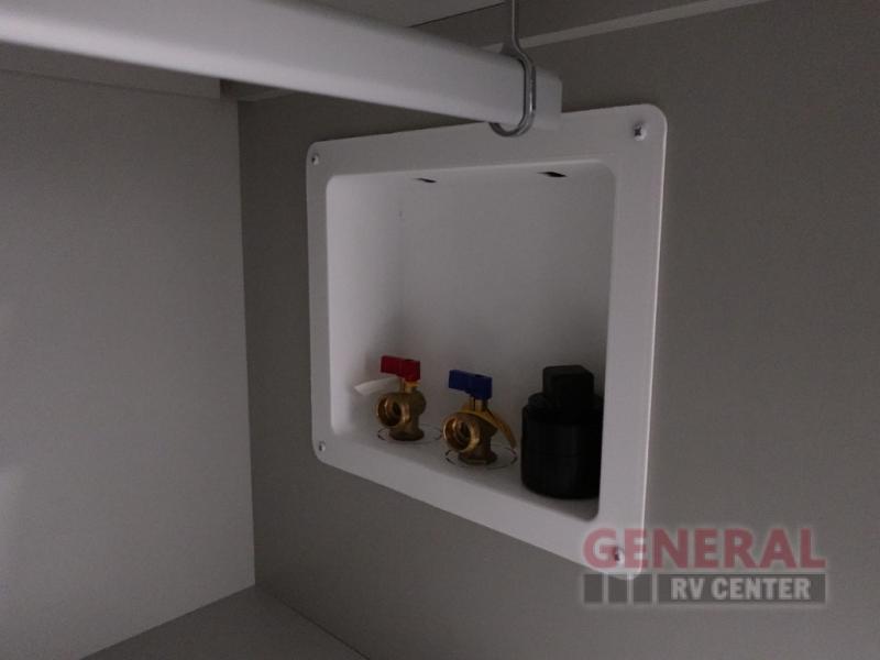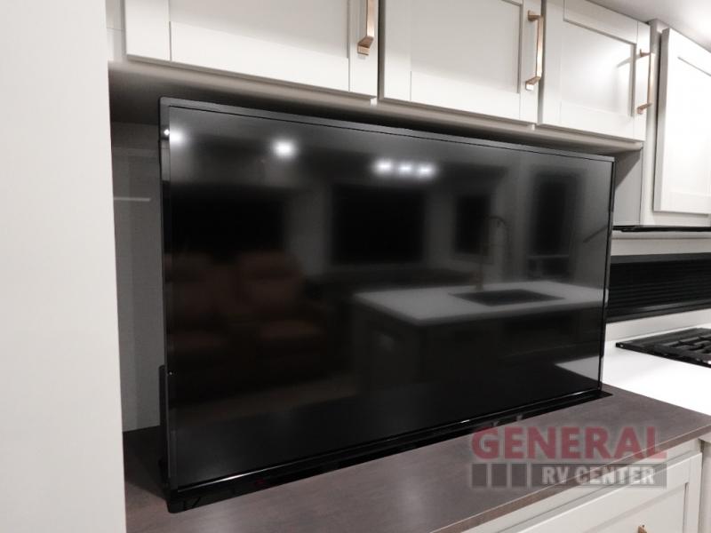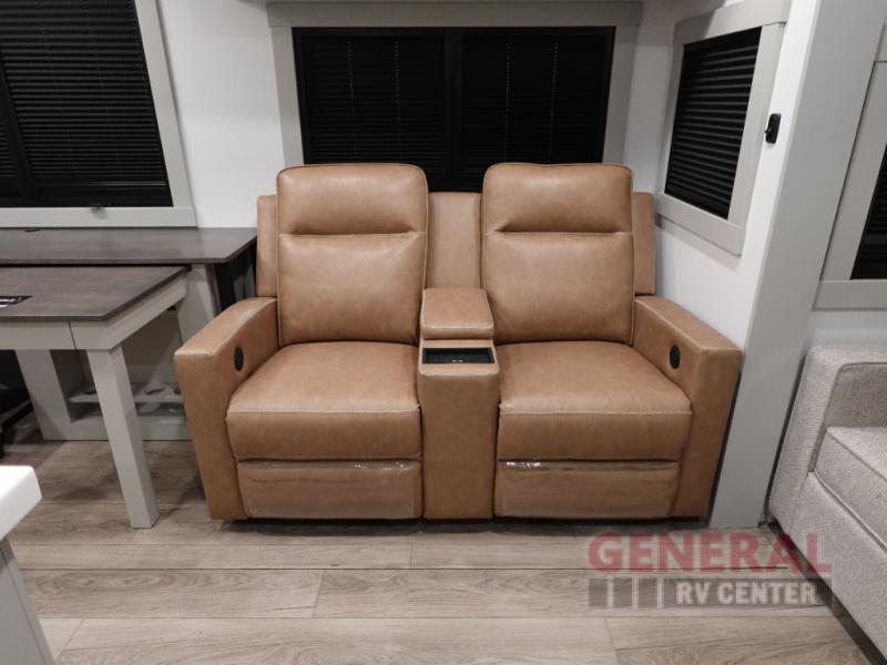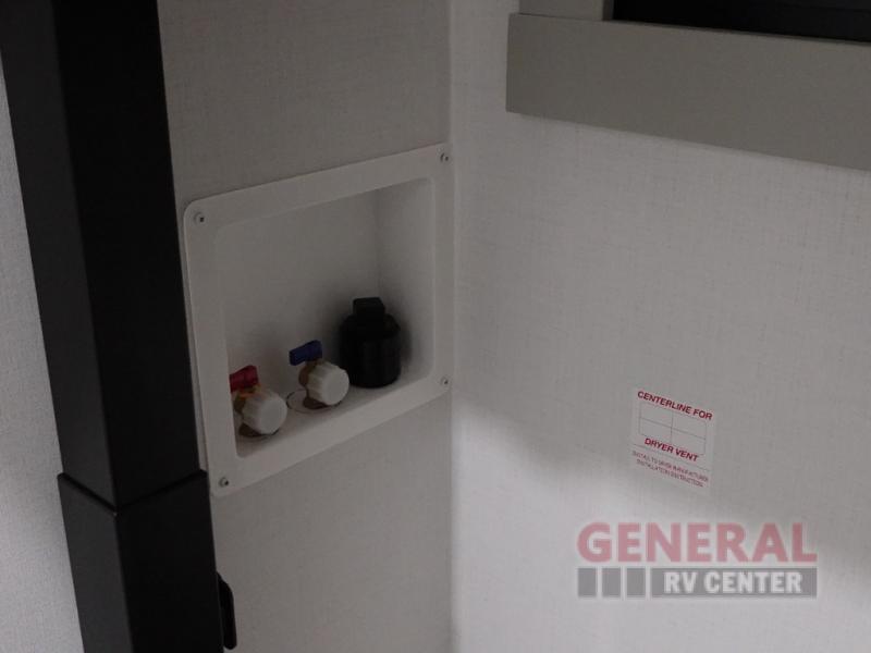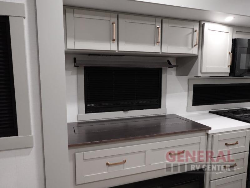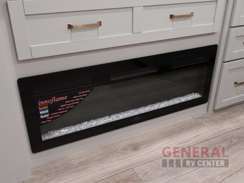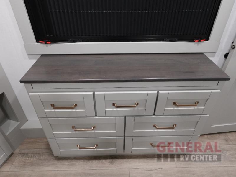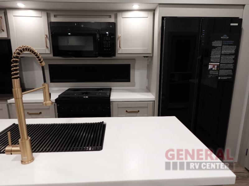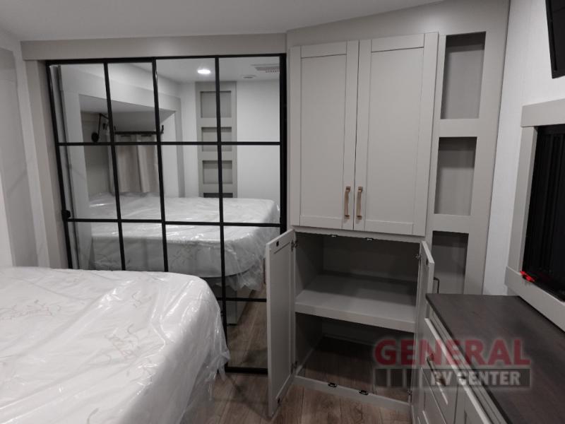 If you're looking for a feature-packed fifth wheel, this is the one! The rear multipurpose flex space can be used as an office/butler's pantry/laundry room/mudroom! There is an adjustable-height desk, storage space, plus washer and dryer prep. One of the dual entry doors is even found here for added convenience. The combined middle kitchen and living room includes dual opposing slides, a tri-fold sofa, theater seating, and a sliding desk/dining table. There is also a televator and fireplace, kitchen island with pet bowls, and an 84" pantry with adjustable shelving to name a few more features. A full bath towards the front includes a 30" x 42" shower, and the front private bedroom will feel just like home with its king bed slide out. There is also a sliding dresser top with hidden storage, bedside shelves, a front wardrobe, and washer and dryer prep here also!