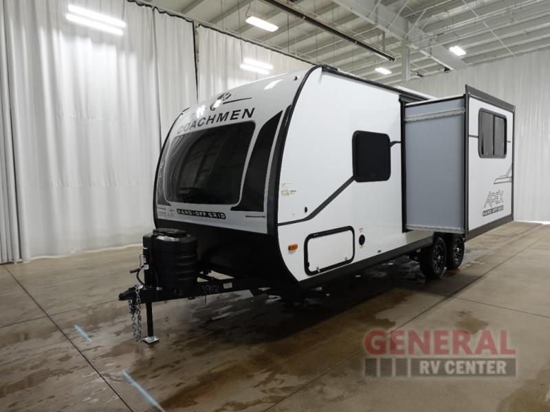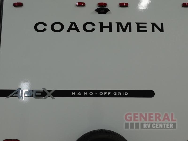 You will find comfort, convenience, and a sturdy construction with each of these Coachmen RV Apex Nano travel trailers! They are held together with an aluma-cage construction, an I-beam chassis, plus vacuum-bonded laminated dual Azdel fiberglass walls for double the protection against the elements. The 400-watt solar panel with a 30 amp control charger is included, along with two 20 lb. LP tanks, a high velocity power roof vent, plus 12V outlets to keep you powered up. More exterior features include a hot/cold shower, four stabilizer jacks, a power awning with LED lighting, and radius thumb latch baggage doors to easily pack and unload your gear. You will love the interior of your Apex Nano with Congoleum residential flooring, one-piece seamless edge countertops, matte black hardware in the galley, and a hand-crafted wood medicine cabinet in the bath.