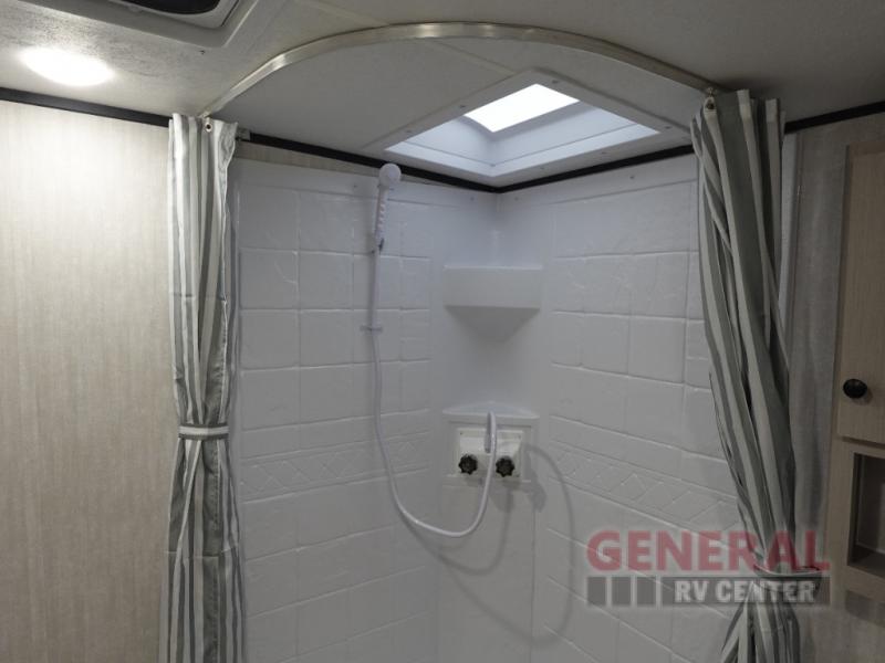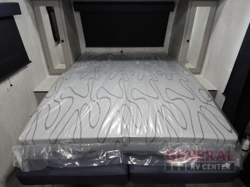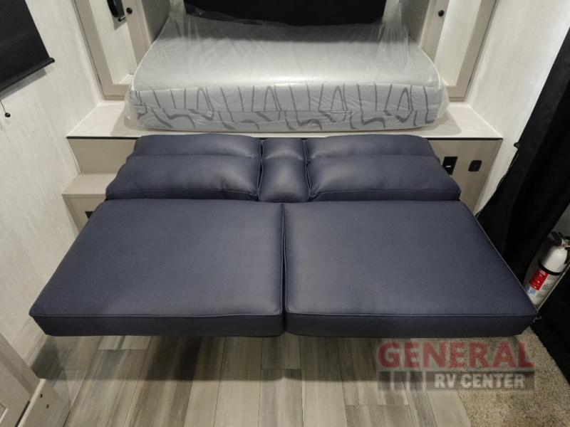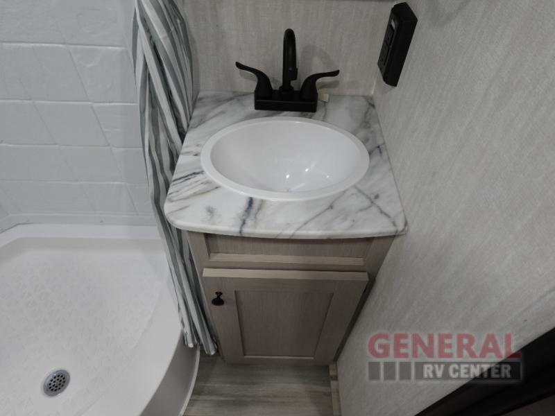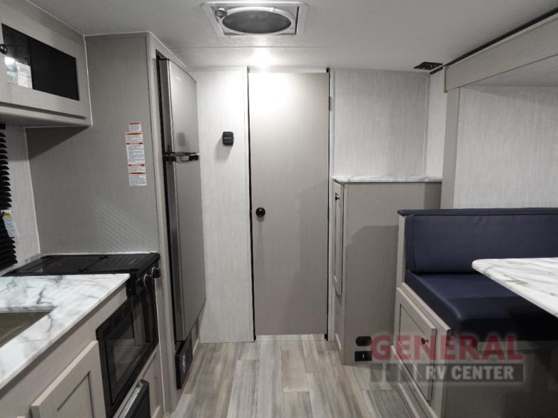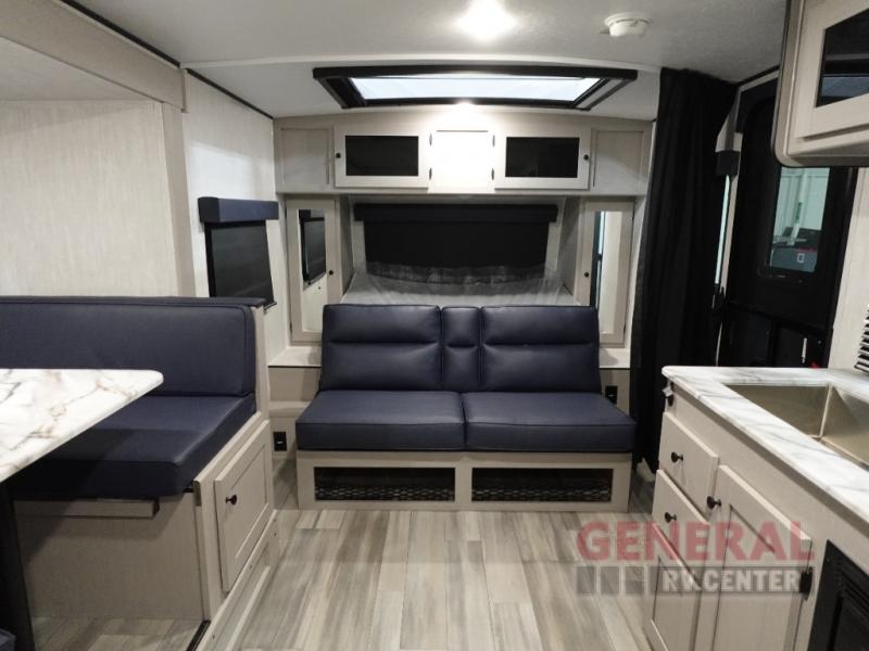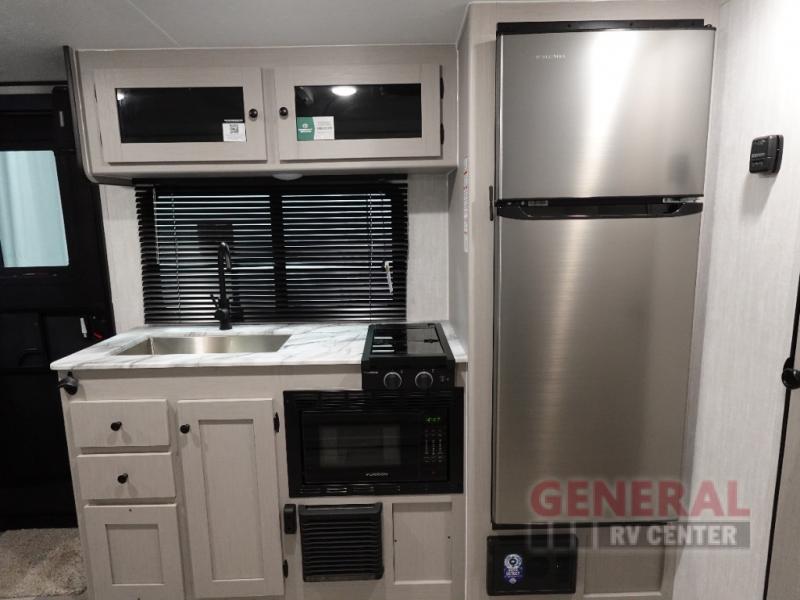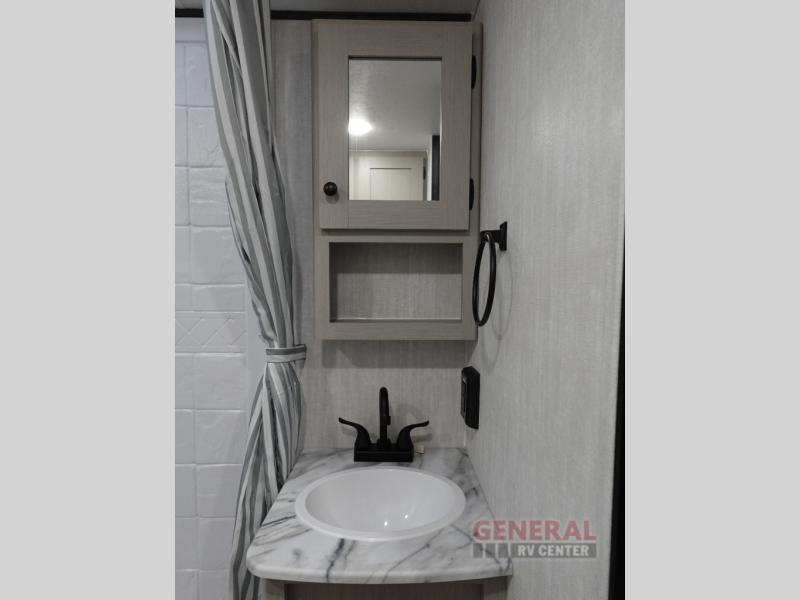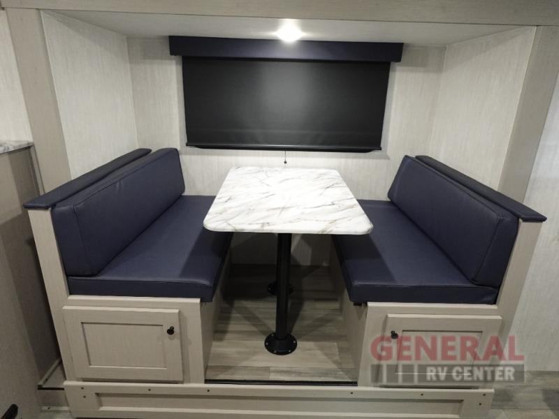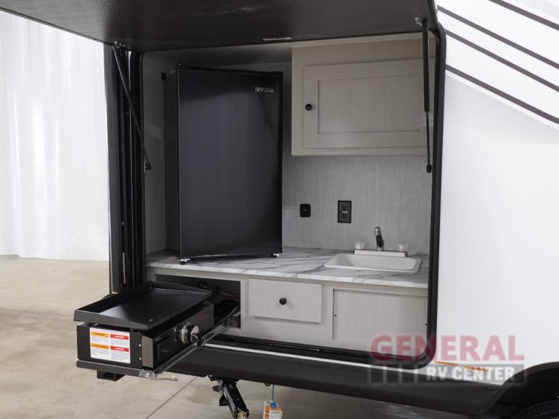 When you camp at RV parks, state parks or local campgrounds, you will love the easy setup after towing the trailer to your destination! The booth dinette slide and the power awning with LED lighting can quickly be set up so you can relax and unwind with your favorite person or people. You will have the choice of cooking inside with full amenities or outdoors on the outside kitchen, inside you will have a pantry to store all your dry goods and an air fryer microwave to heat up items. The rear bathroom includes a wardrobe and allows you privacy when inside, and the front walk-around queen-size bed or the Murphy bed option, allows you to sleep comfortably after hiking, walking or fishing. There are wardrobes at either side to allow for storing your clothes and essentials. And you will find more storage throughout for your clothing, plates, games and such, plus outside in the pass-through compartment.