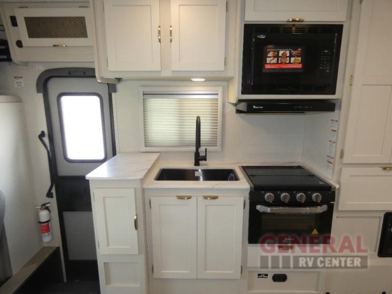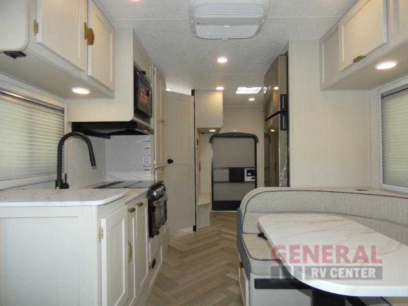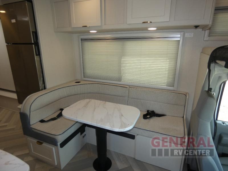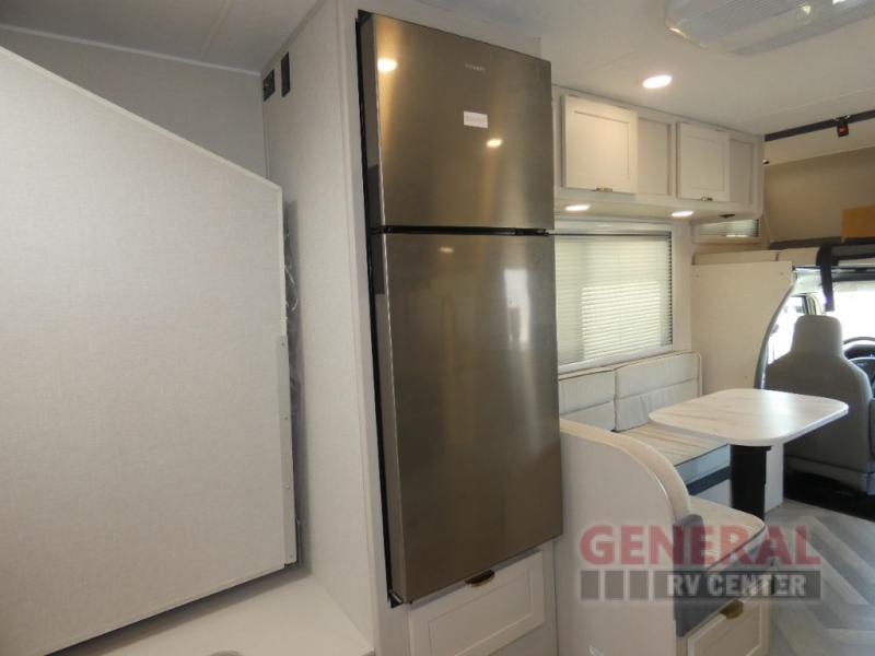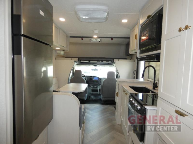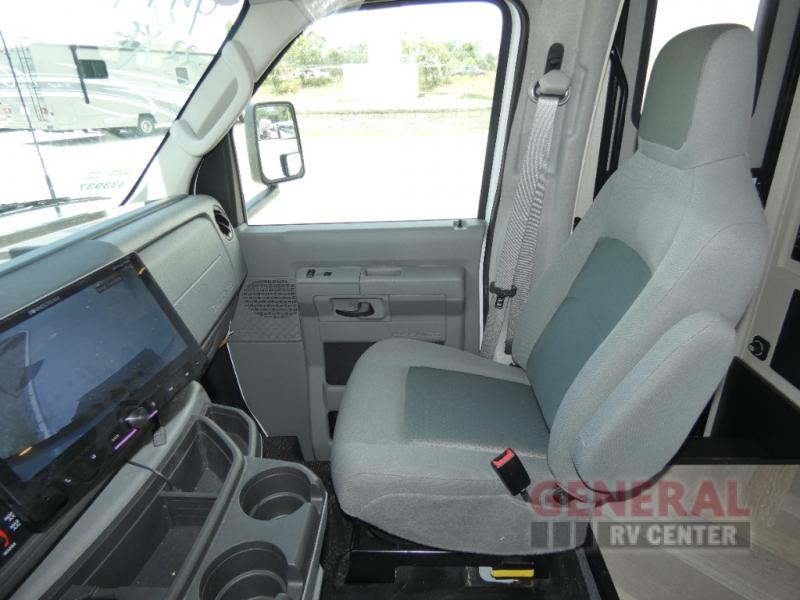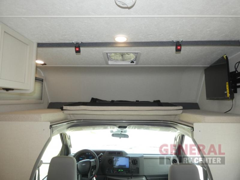 Starting traveling in comfort with this motorhome! It features a rear corner queen bed to lay your head on at night and is conveniently next to the rear corner bathroom which will come in handy at night. There is also a 39" x 95" bunk over cab for sleeping or storage. You could even transform the 44" x 76" J-lounge into an extra sleeping space when you aren't using it to enjoy a meal or play a card game. Speaking of meals, you can easily cook your meals with the three burner cooktop and store any leftovers in the refrigerator. Wind down your nights by watching a movie with the swing-arm TV or set up a chair underneath the 15' power awning!