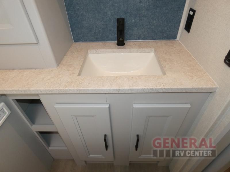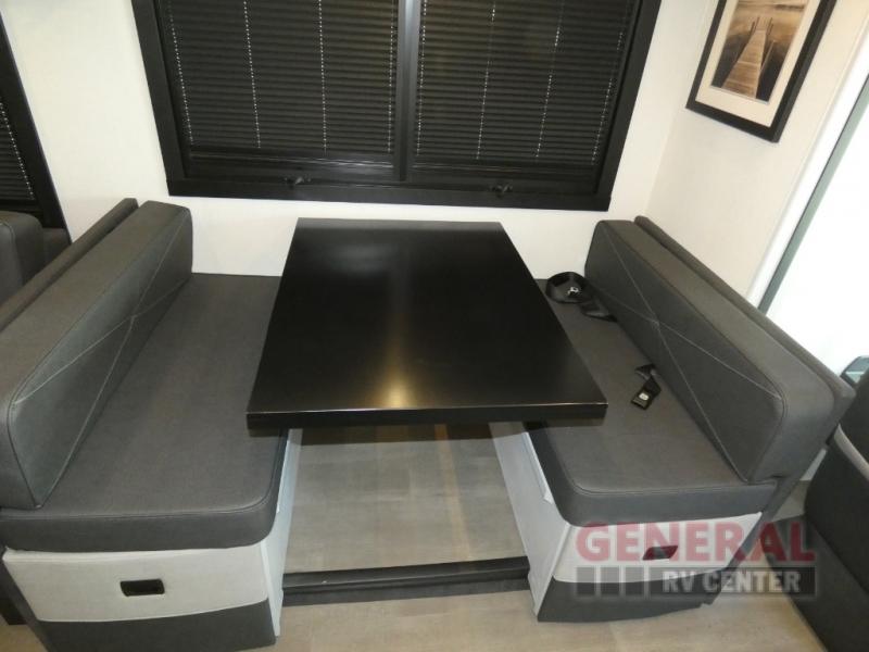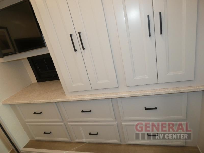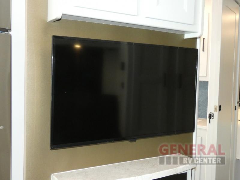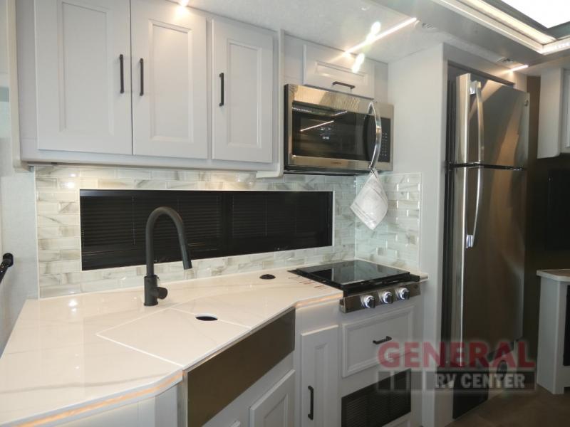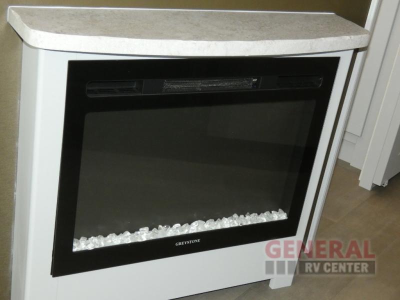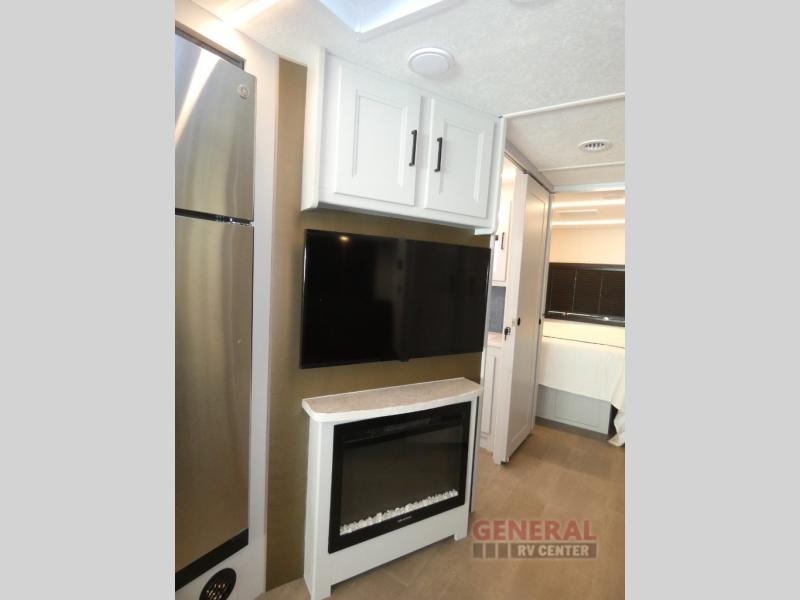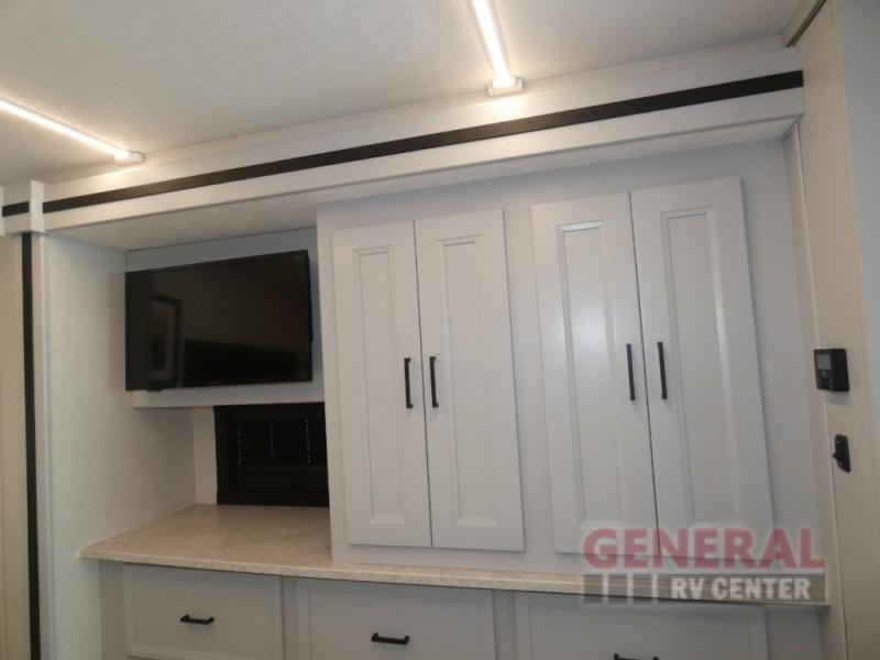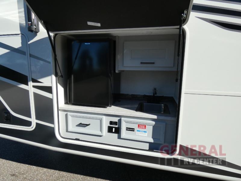 This motorhome perfectly blends comfort, style, and freedom for unforgettable adventures. The rear bedroom offers a 70 x 74 king bed, LED TV, generous wardrobe storage, overhead cabinets, and a sleek design. Additionally, this motorhome features a full bathroom, stackable washer/dryer prep, and linen/pantry storage, ideal for extended trips and comfortable for the whole family. The kitchen boasts a residential-sized refrigerator, microwave, overhead cabinets, a three-burner cooktop, and a spacious 76” dinette perfect for enjoying meals with family and friends. Plus, outdoor kitchen for al fresco dining. Cook, dine, and entertain with ease, wherever the road takes you. Finally, enjoy quality time with family and friends in the incredible living room equipped with a 40” LED TV, a warm fireplace, and a 78” sofa ideal for relaxation.