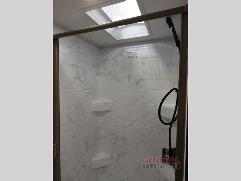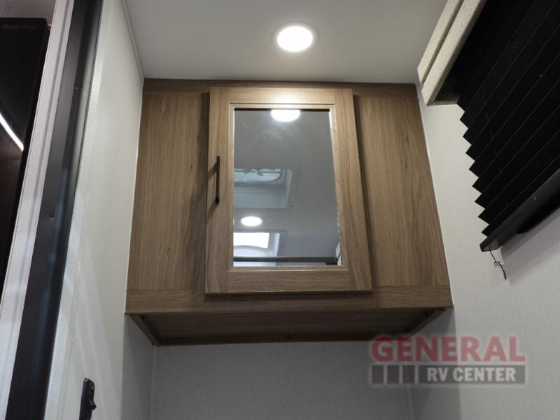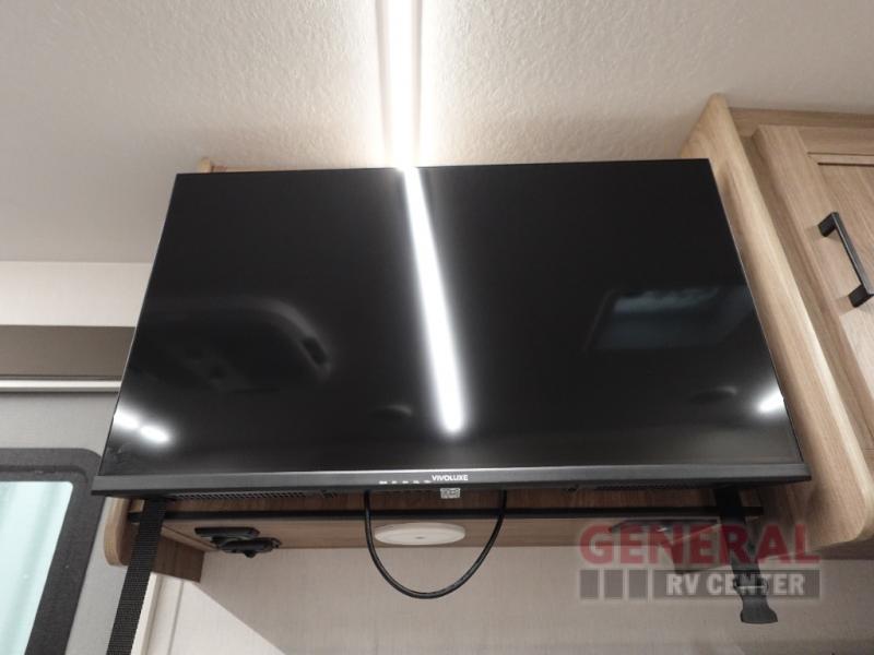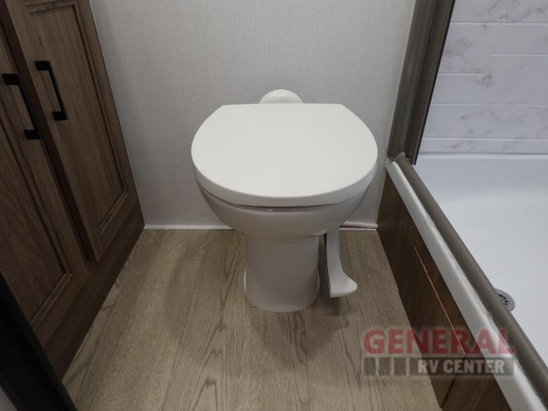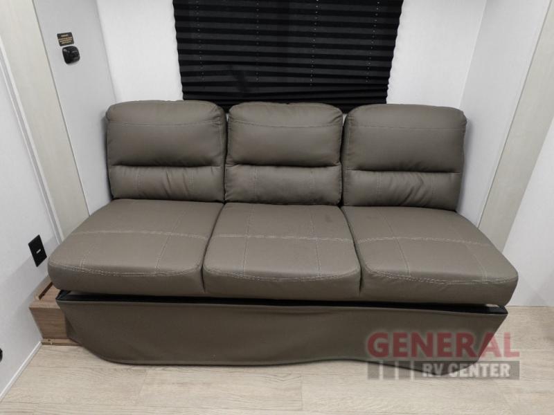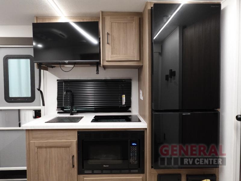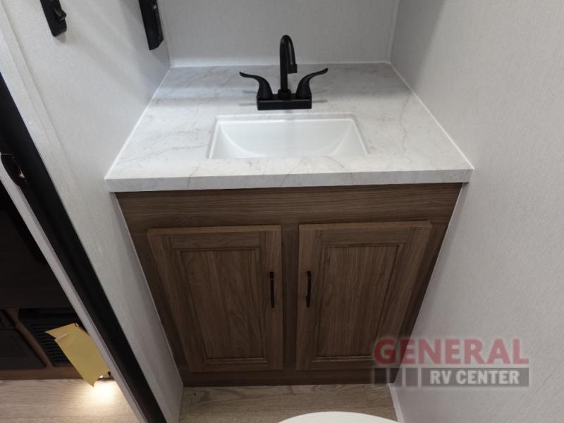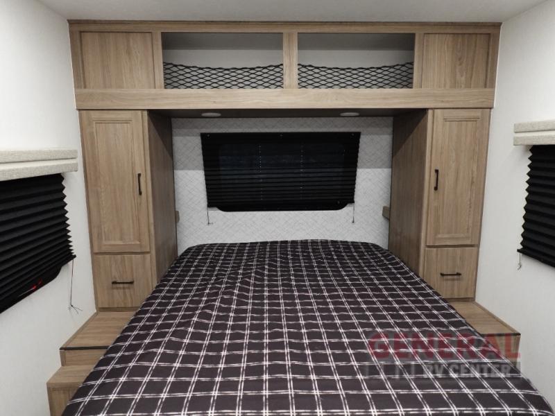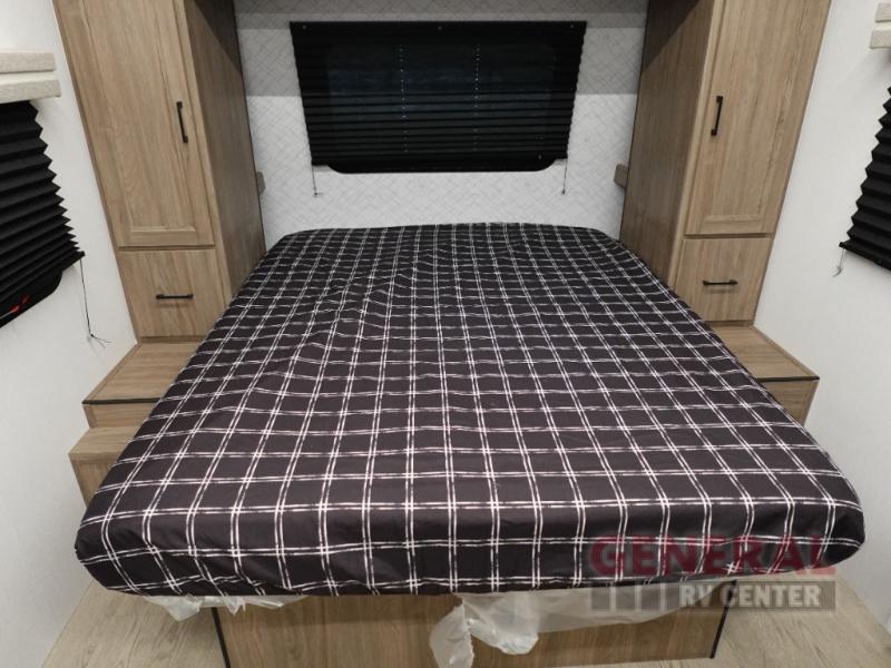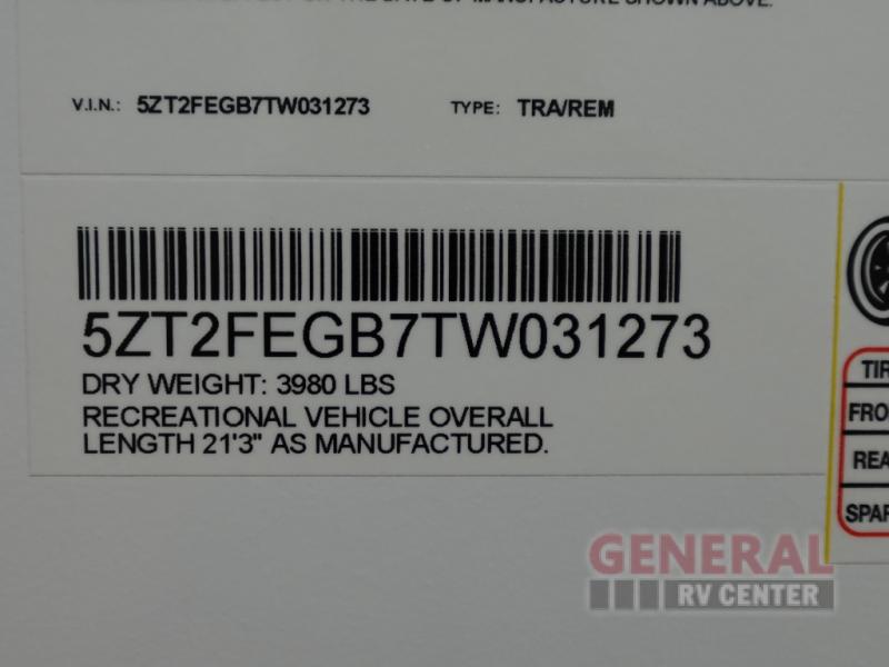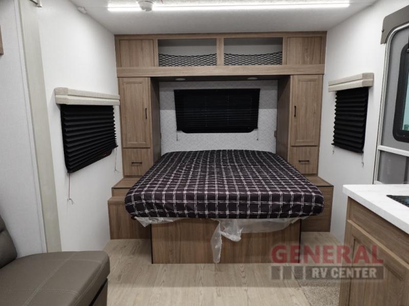 You'll love spending time at the campground in this single slide out travel trailer! The 54" x 80" front bed includes vaulted underbed storage to keep your luggage or extra blankets out of the way, plus there are dual bedside wardrobes for your clothes. A sofa with a free-standing table will provide a place to relax and dine, and the full kitchen includes a dual-burner cooktop and microwave to cook meals each day. This unit also features a full rear bath, complete with a 30" x 36" shower, a toilet, and a sink with a medicine cabinet for your necessities.