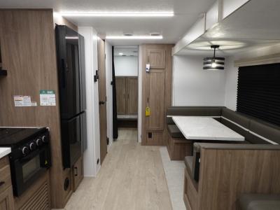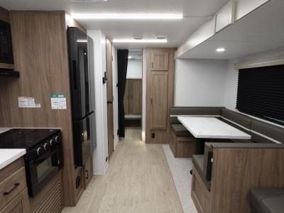 Whole-family fun is waiting for you in this spacious travel trailer. The kids or your guests will love the private bunkhouse with four bunks, plus a wardrobe with a countertop to keep their things. You will enjoy the front private bedroom with a walk-around queen bed and dual wardrobes, and if you have any other guests, they can sleep on the sofa or U-shaped dinette within the large slide out. The kitchen includes everything needed to prepare meals each day, including a microwave, a dual-burner cooktop, and a double door refrigerator. This model also includes a pass-through storage, plus additional exterior storage to bring along hiking gear, fishing poles, and camp chairs!