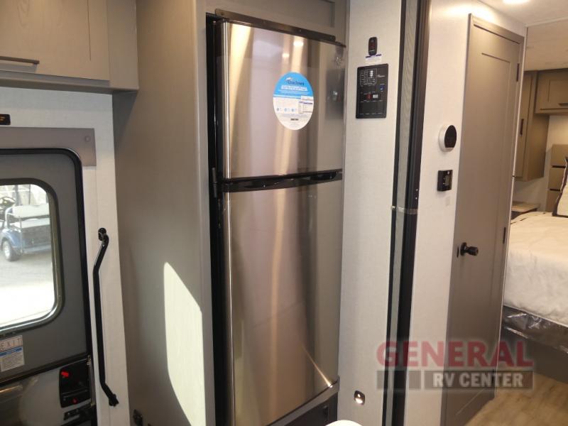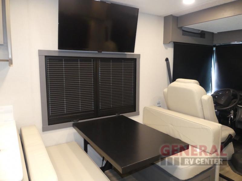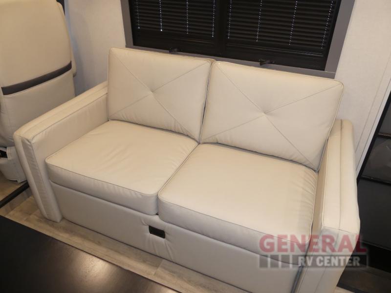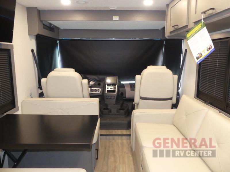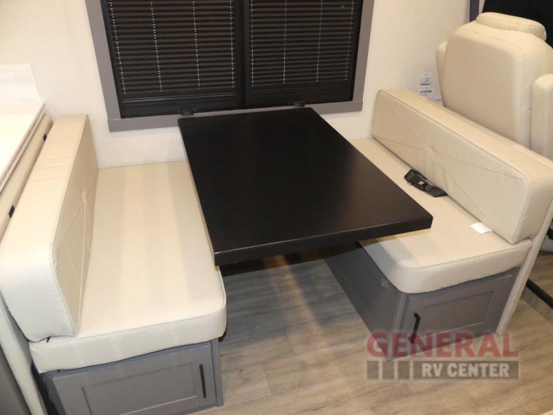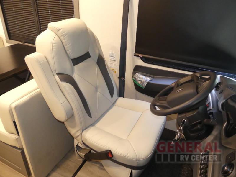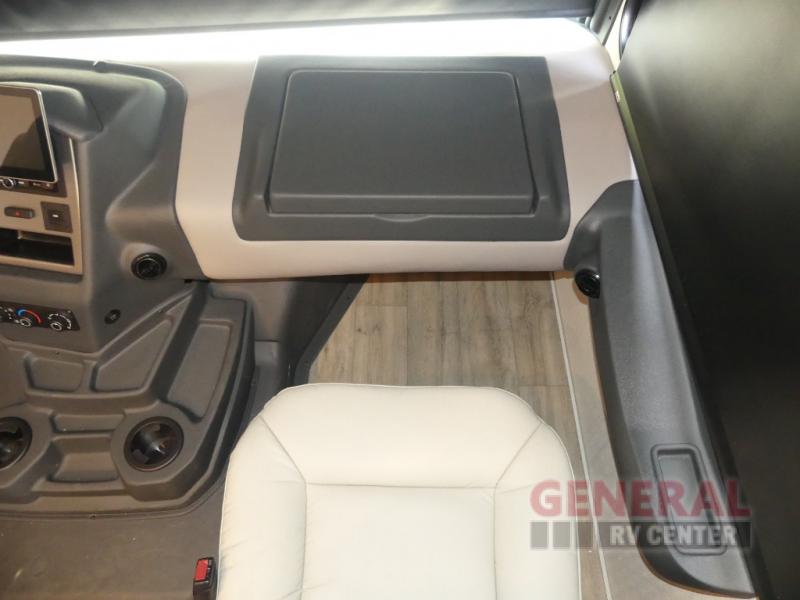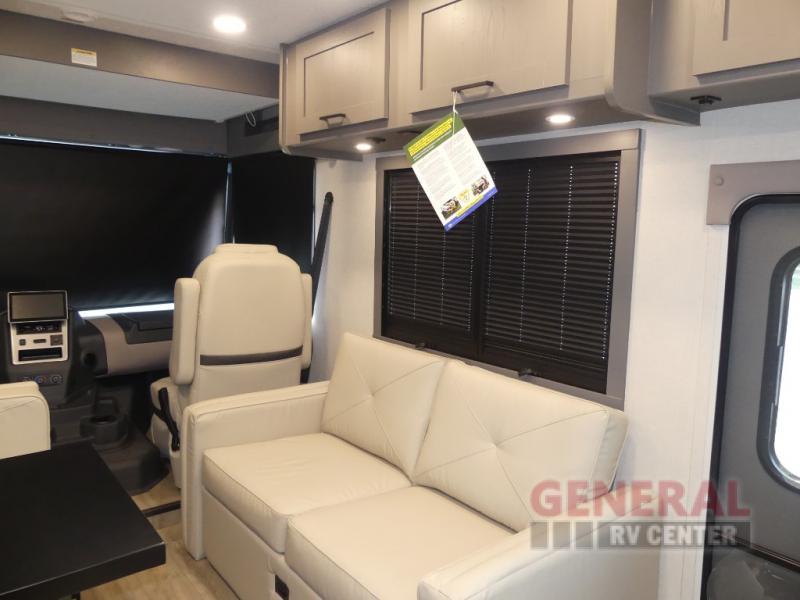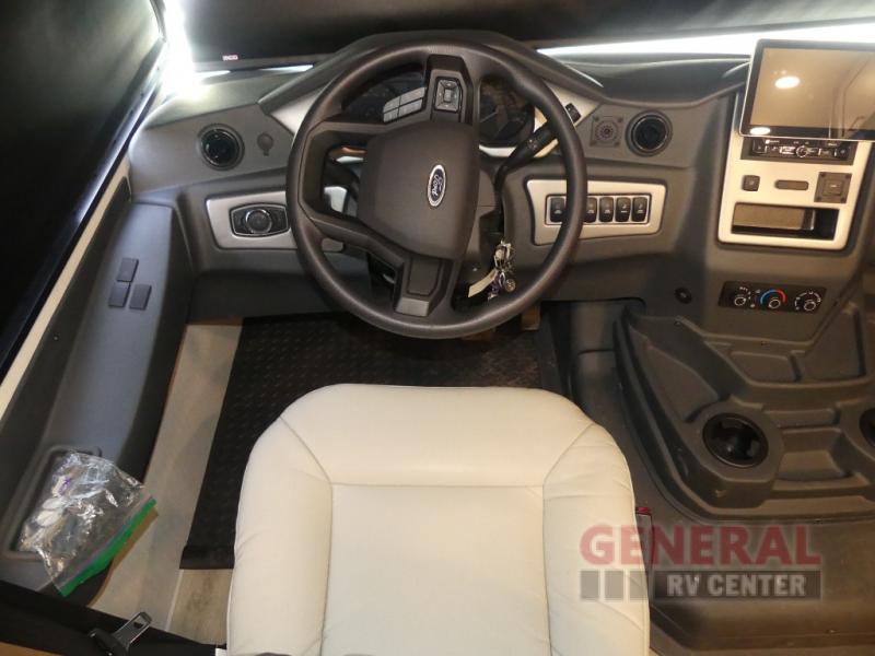 Live your best life on the road with this motorhome! The rear private bedroom has a 60" x 74" queen bed to lay your head on at night with wardrobes on either side of it for your clothes. A separated bathroom makes it easy for one person to freshen up in the 24" x 32" shower while another uses the private toilet and sink. Enjoy home cooked meals while out on the road with the stainless steel three burner cooktop, the 12V stainless steel double door 10 cu. ft. refrigerator, and even the stainless steel microwave oven. Eat your meals, play card games, and even transform the 42" x 70" booth dinette into an extra sleeping space. The 63" sofa has storage below for an extra blanket or board games. If you need to get some work done while you're away then you will appreciate the computer work station with 12V, 110V, and USB outlets in front of the passenger chair!