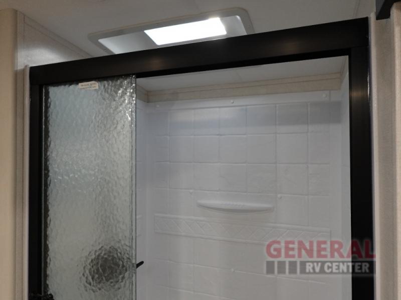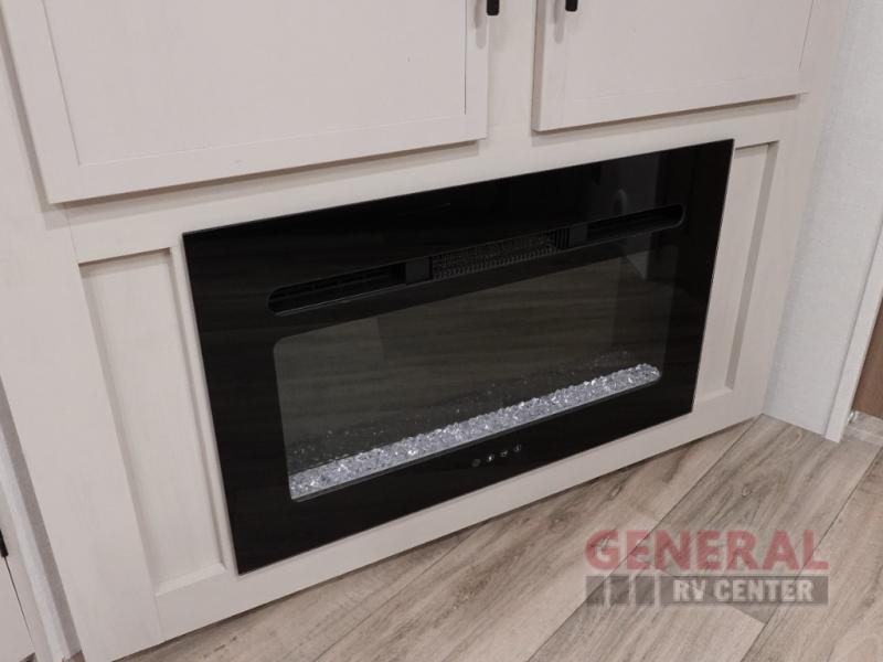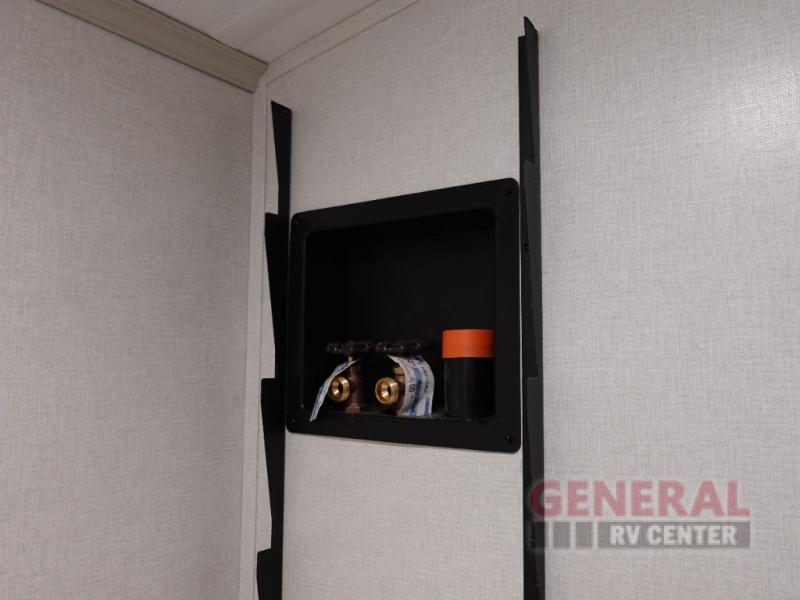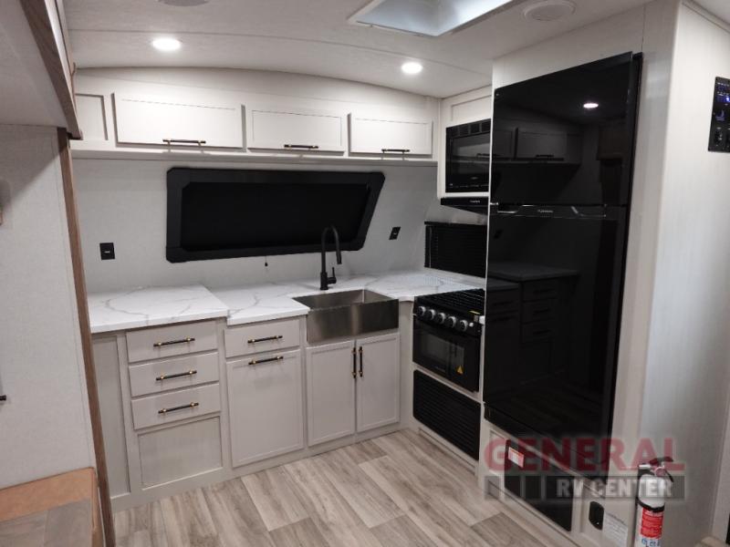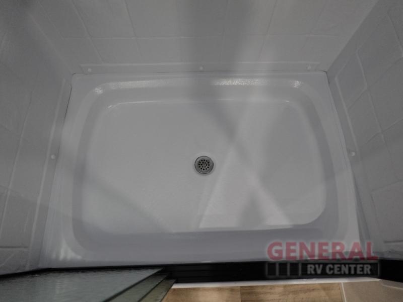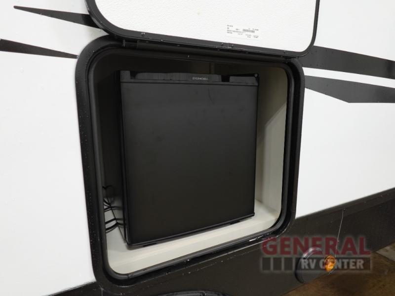 You will have everything you need for a comfortable camping trip with this travel trailer! It features a rear private bedroom with a king bed slide for more interior space and an entrance into the walk-through bathroom which will come in handy at night. The bathroom also has a dual sink vanity for two to get ready at once in the mornings. The front kitchen has plenty of countertop space to prepare your best meals and even a pull out trash can, and you can comfortably enjoy them at the U-shaped dinette, plus it can transform into an extra sleeping space for a guest or two to tag along. What better way to relax at night than on the tri-fold sofa across from the hinged entertainment center!