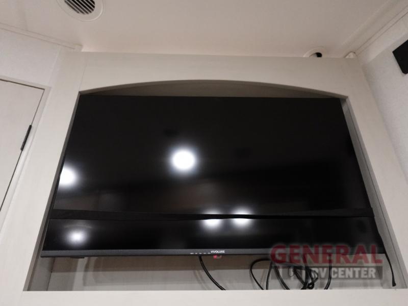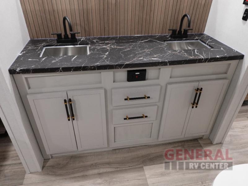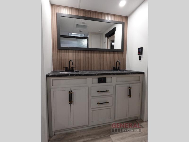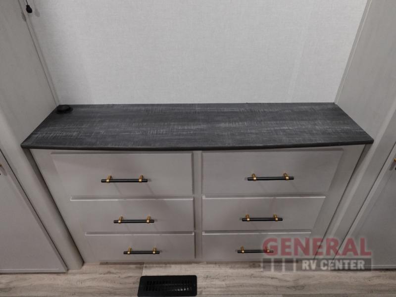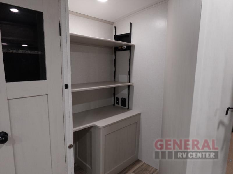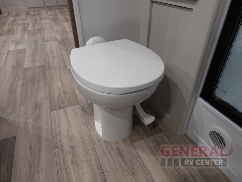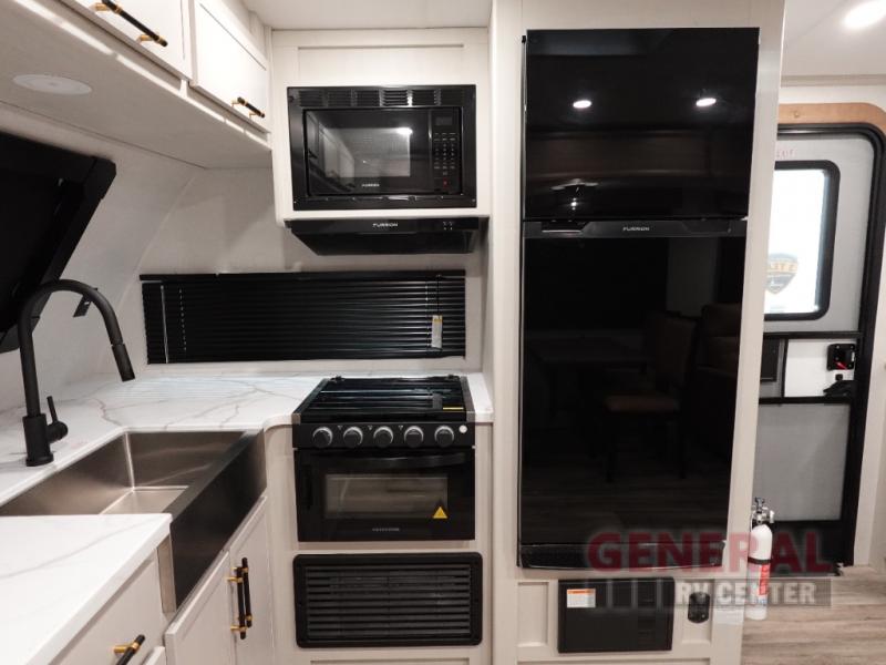 You will have everything you need for a comfortable camping trip with this travel trailer! It features a rear private bedroom with a king bed slide for more interior space and an entrance into the walk-through bathroom which will come in handy at night. The bathroom also has a dual sink vanity for two to get ready at once in the mornings. The front kitchen has plenty of countertop space to prepare your best meals and even a pull out trash can, and you can comfortably enjoy them at the U-shaped dinette, plus it can transform into an extra sleeping space for a guest or two to tag along. What better way to relax at night than on the tri-fold sofa across from the hinged entertainment center!