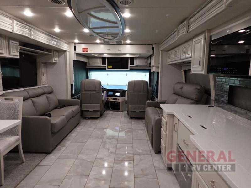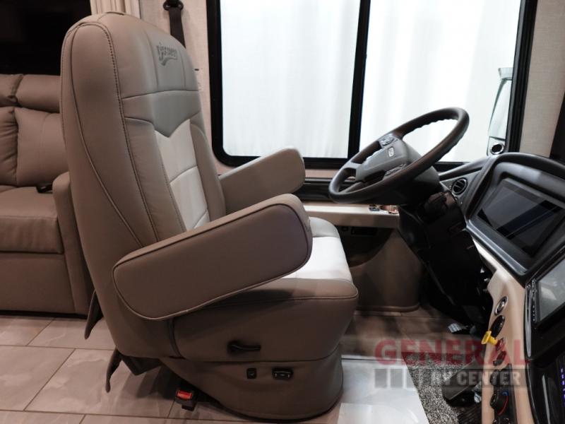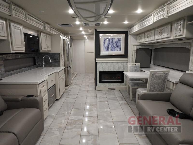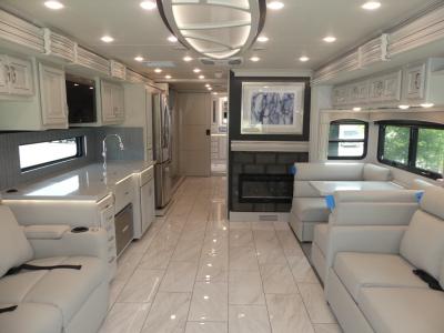 With any Fleetwood Discovery Class A diesel motorhome, the Freedom Bridge custom chassis, the V-Ride suspension, and the Cummins B6.7 engine offer a smooth and enjoyable ride to all your destinations. The construction also includes a one-piece fiberglass exterior roof with a sleek appearance, low maintenance, and long-lasting durability. The interior cabin includes full hand-laid porcelain flooring throughout and a heated floor in the living area, making traveling convenient. And you will love the residential-style furniture by Apex Custom Furniture interior decor. Additionally, these models feature three 15,000 BTU A/C units with rear heat pump, large holding tank capacities, and generous interior and exterior storage, making them ideal for storing all your gear. Choose to travel and live better in a Discovery!