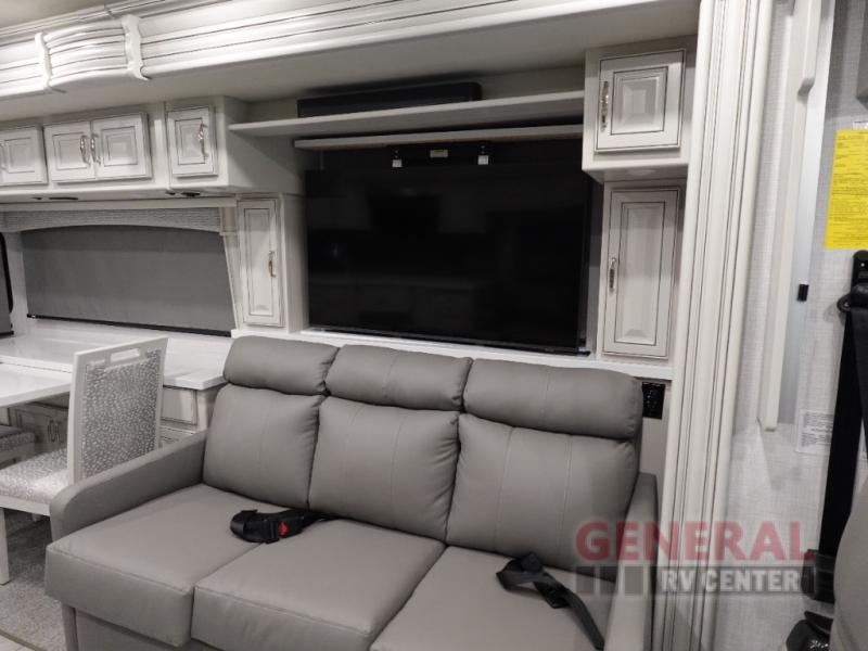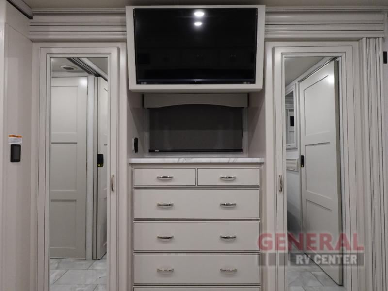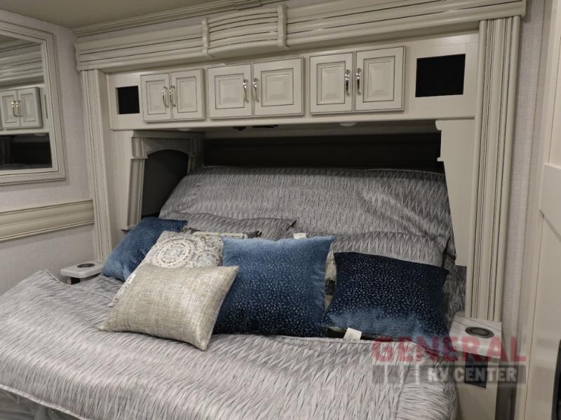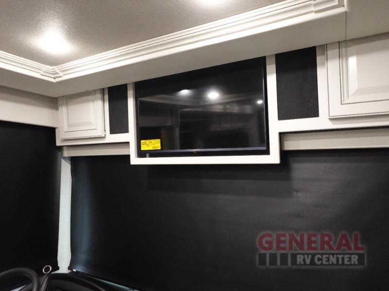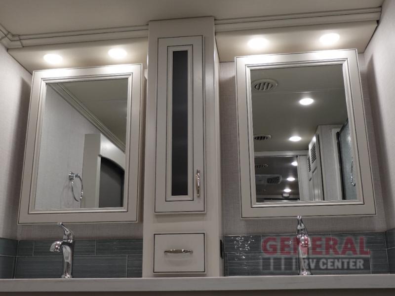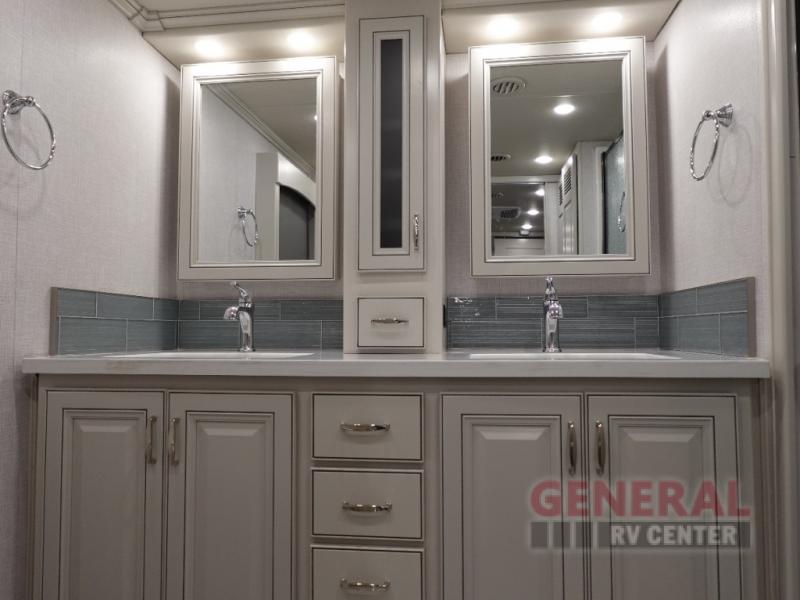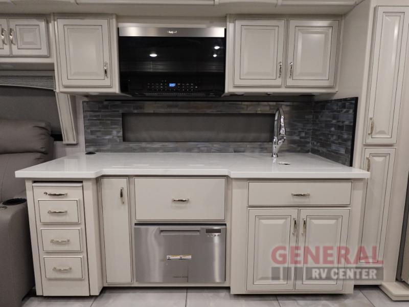 Travel for the love of it, work while traveling, or drive across country to see family and friends! You can do it all in this coach with luxury and residential features throughout and with many conveniences and comforts to keep you on the road. You will love the spacious full bathroom off of the master bedroom that offers two sinks, a fiberglass shower with a seat, glass door and designer shower head assembly. You will be able to keep everything clean using the stackable washer/dryer, and there is a linen closet for fresh towels. The king bed slide provides more floor space, and the two wardrobes, dresser and LED TV are more highlights in the bedroom. The mid-coach half bath is convenient especially when you have guests, and the sofa sleeper with pull-out full bed and the loveseat offer more sleeping space. You might like to add the Hide-A-Bed power drop-down overhead bunk option so you can invite more overnight guests. And the kitchen is something to boast about with the convection microwave, the residential refrigerator and the style of the polished solid surface galley countertop with lighting.