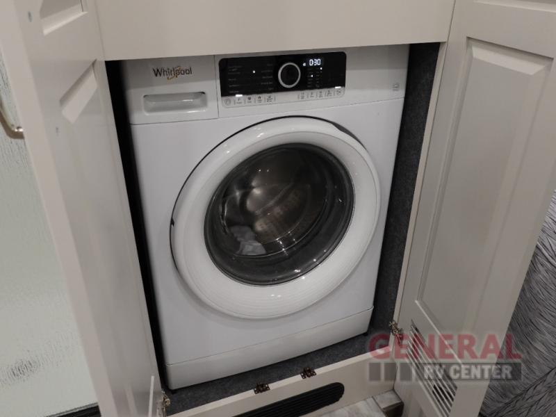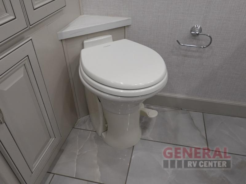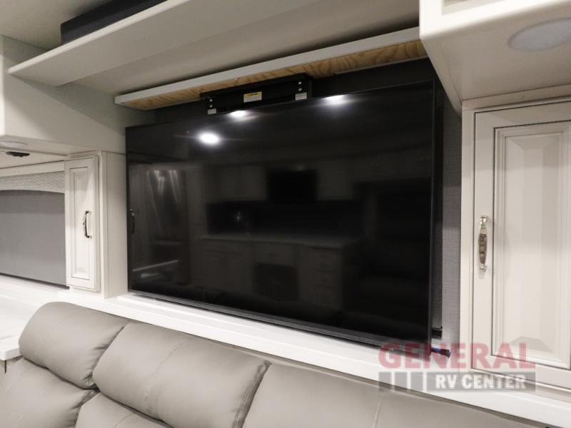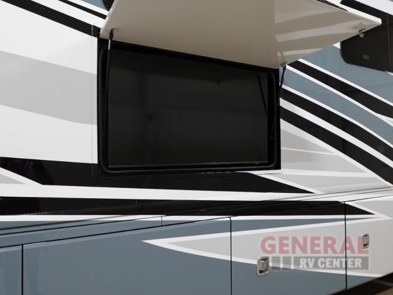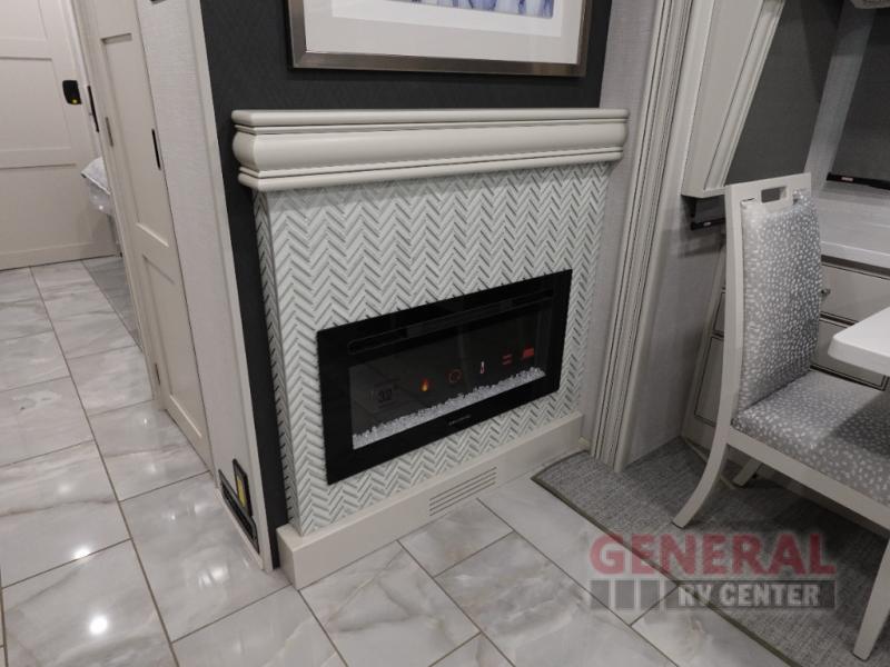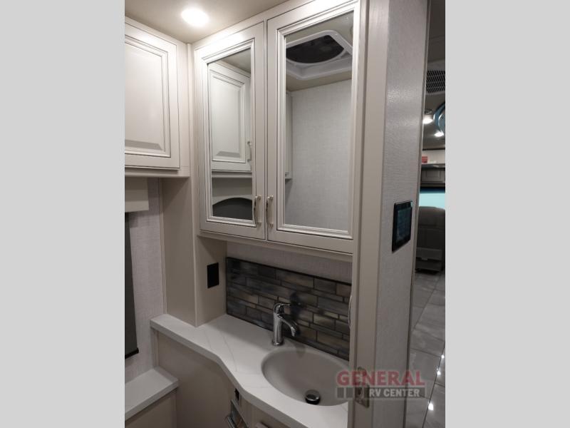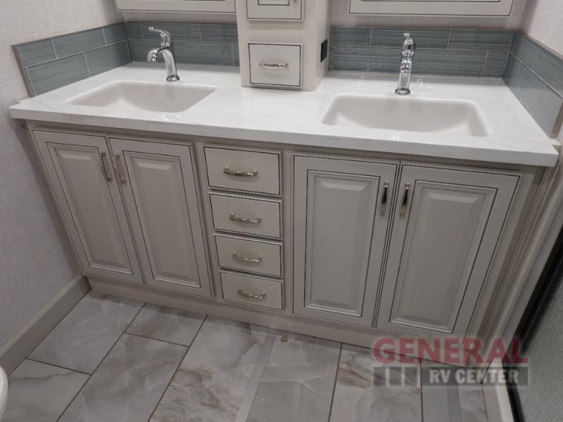 Travel for the love of it, work while traveling, or drive across country to see family and friends! You can do it all in this coach with luxury and residential features throughout and with many conveniences and comforts to keep you on the road. You will love the spacious full bathroom off of the master bedroom that offers two sinks, a fiberglass shower with a seat, glass door and designer shower head assembly. You will be able to keep everything clean using the stackable washer/dryer, and there is a linen closet for fresh towels. The king bed slide provides more floor space, and the two wardrobes, dresser and LED TV are more highlights in the bedroom. The mid-coach half bath is convenient especially when you have guests, and the sofa sleeper with pull-out full bed and the loveseat offer more sleeping space. You might like to add the Hide-A-Bed power drop-down overhead bunk option so you can invite more overnight guests. And the kitchen is something to boast about with the convection microwave, the residential refrigerator and the style of the polished solid surface galley countertop with lighting.
