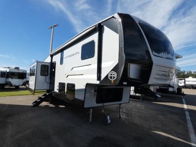 With any Impression fifth wheel by Forest River, the focus of the design is comfort and value, built with quality craftsmanship and attention to customer's desires in each Impression! The exterior includes upgraded E-rated tires, custom exterior graphics package, and insulated slam latch baggage doors. There is also an enclosed docking station, an outside shower, and a 100W roof panel for off-grid capabilities. The fully heated and enclosed AccessiBelly has removable underbelly panels along with enclosed tank valves. There is an industry leading 15K A/C plus 35K BTU furnace to keep you comfortable. The interior has lumbercore cabinetry, residential linoleum, residential backsplash in the kitchen, and oversized opening windows in the living area for more natural lighting and good air flow.