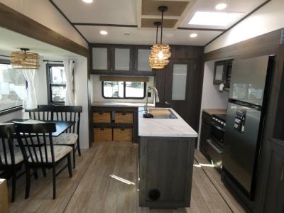 Wow! This fifth wheel will surely make an impression with its middle bunkhouse that can be utilized as an extra bedroom, second living room or even an office thanks to the desk and sofa that becomes a Versa queen bed at night. You will also find a flip-down upper bunk, a slide out for more floor space, and a wardrobe for clothing. The full bathroom is between this room and the front bedroom that offers lots of storage including a slide out wardrobe, a space prepped for a washer/dryer option, nightstands to place your cellphone and such, plus a queen bed with Versa Tilt technology. The kitchen at the back includes plenty of storage for your dishes, pans, drinkware, and dry goods. The cook will love the kitchen island and the full amenities. And the free-standing table with chairs plus the theater seating offer even more seating.