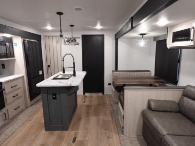You will be the talk of the campground with this travel trailer! The front private bedroom has a queen bed slide across from a dresser and a front closet plus a second closet with washer and dryer prep. Freshen up each morning in the full bathroom with the 34" x 34" radius shower then head to the kitchen to fry up some eggs with the stainless-steel oven and range. You can enjoy your meals at the booth dinette, and the kitchen island will make your clean up easier with the sink that has a high-rise faucet and sprayer. The rear private bunkhouse has a 32" x 69" bunk above a jiffy sofa slide, a 36" x 69" bunk above a 36" x 71" bunk and a linen closet. Choose one of the outside kitchen options for even more convenience!