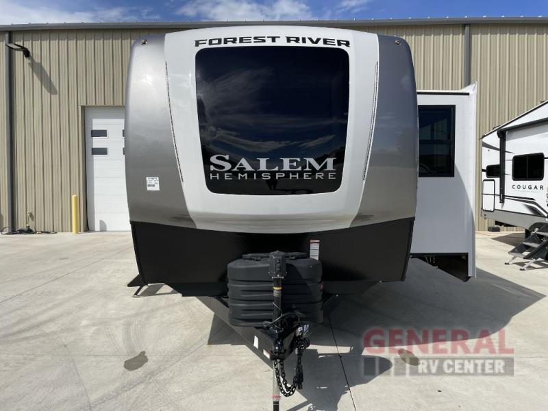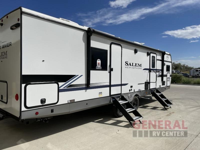 The Salem Hemisphere travel trailers by Forest River are packed with features, while still being value-minded! Each model is constructed with laminated "Aluma Frame" sidewalls and floor with block foam insulation plus an enclosed underbelly with 12V tank heaters on all holding tanks. There are LED awning, marker and taillights outside, along with an extra-large pass-thru storage with slam latch baggage doors, plus solar prep and Lippert On-The-Go ladder prep. The 60K on-demand tankless water heater will provide endless hot showers, and the JBL sound system includes a head unit plus interior and exterior speakers to keep the party going. There are also many interior comforts found throughout that will make you feel right at home!