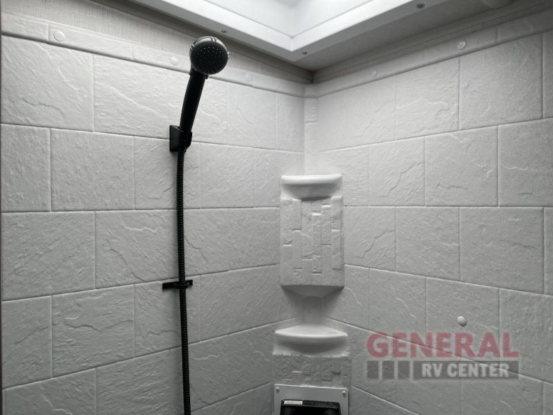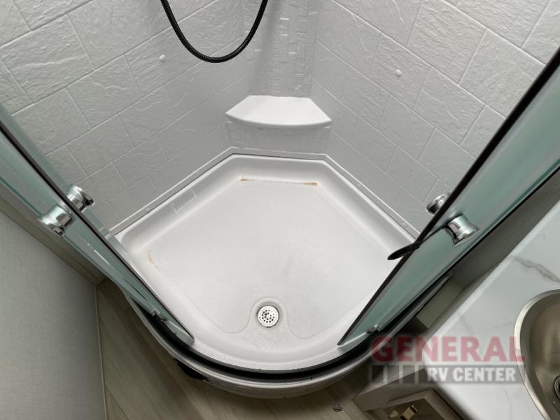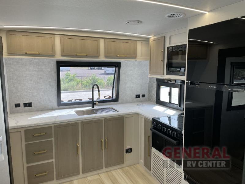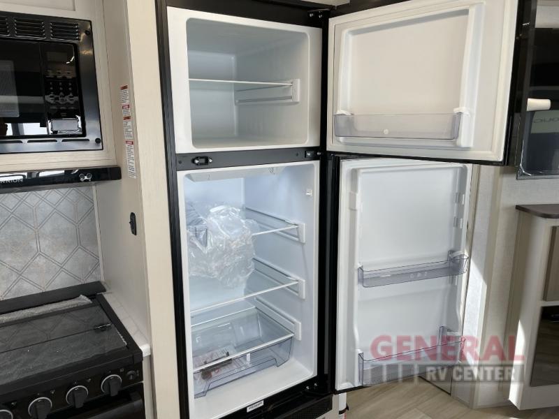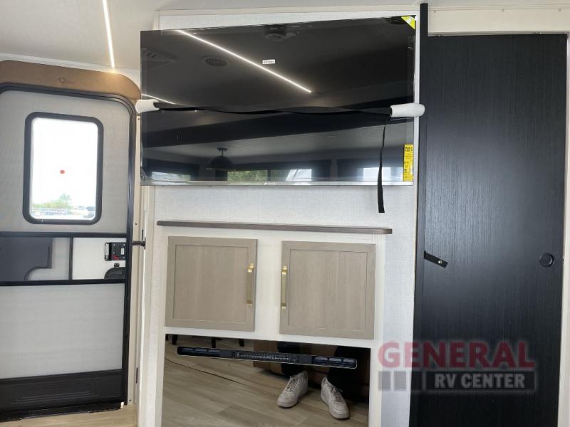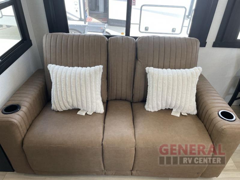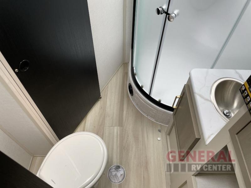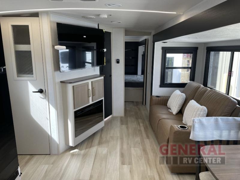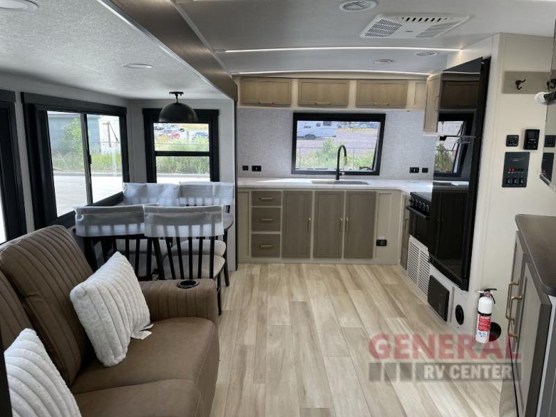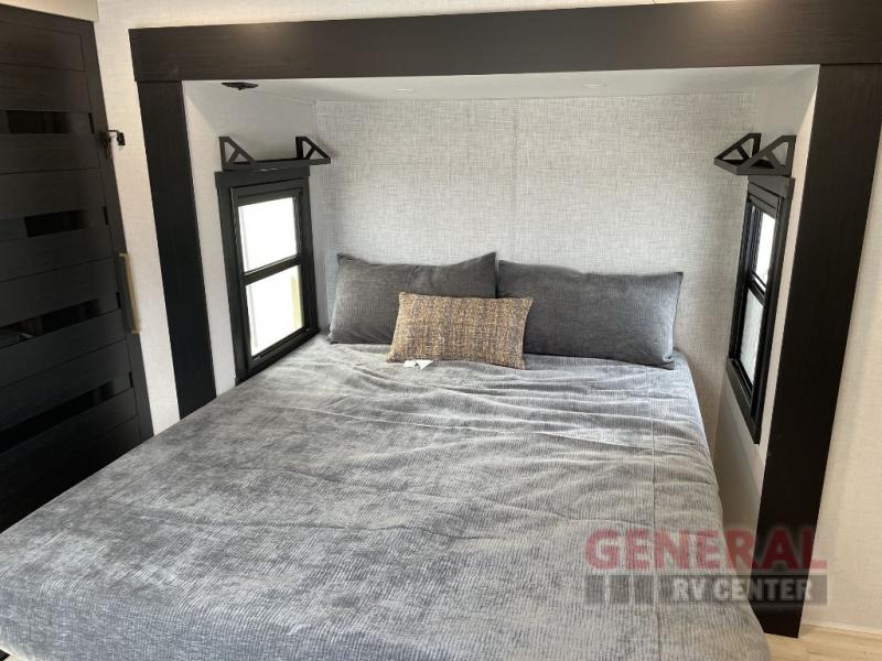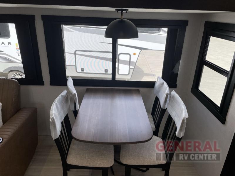 Once you step inside this dual entry travel trailer, you won't want to camp any other way! The rear private bedroom will have you feeling right at home with the custom king bed across from a dresser with a TV hookup, a large bedroom wardrobe, and there is even a closet with washer/dryer prep. The dual entry bath makes it easy for everyone to access, and it has a radius shower with a skylight above for added natural lighting as you get ready each morning. Both the theater seating and the booth dinette have a panoramic window for you to look out at your beautiful scenery. The chef of the group will love cooking in the front kitchen with all of the extra countertop space!