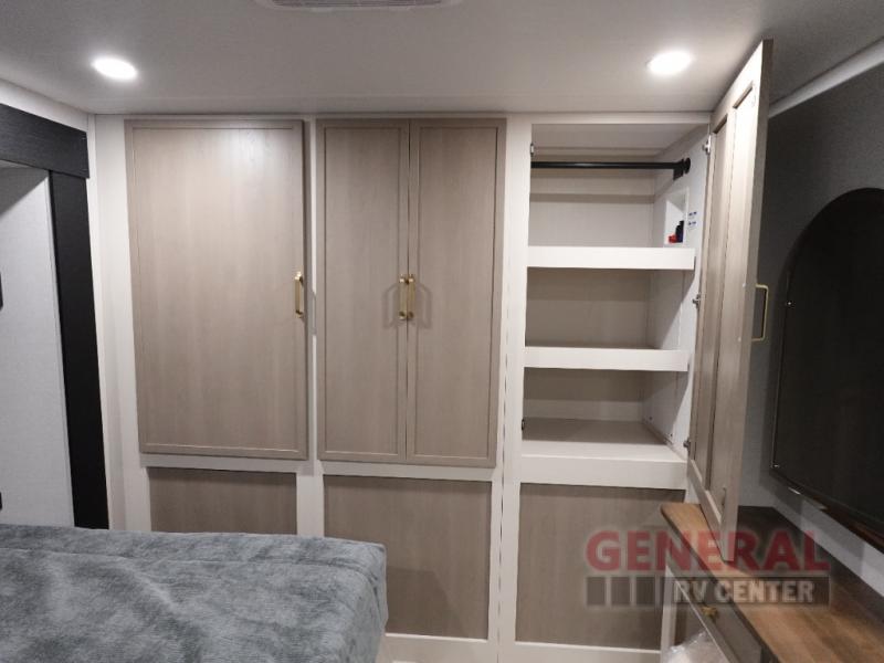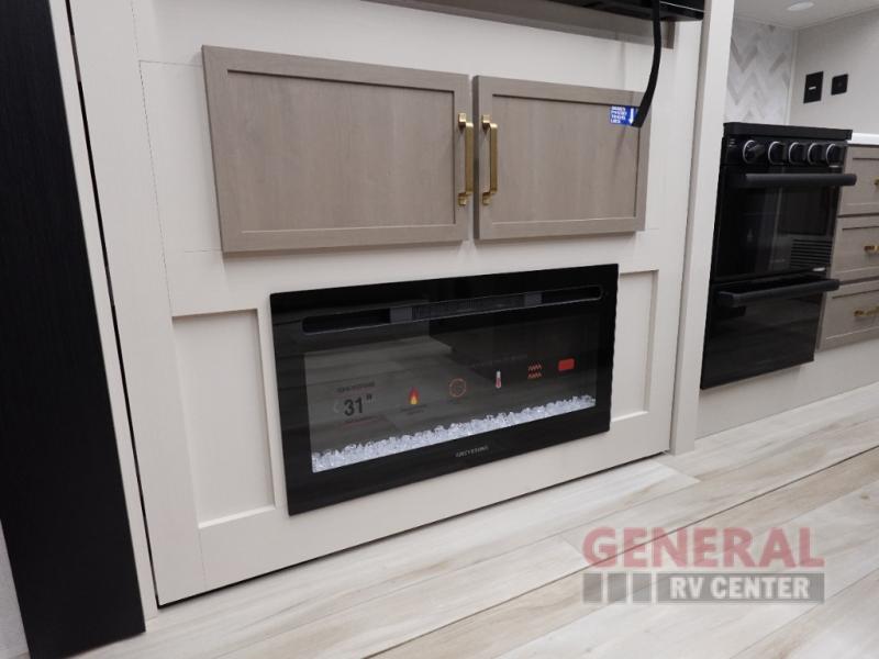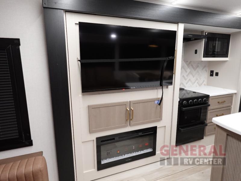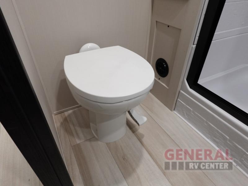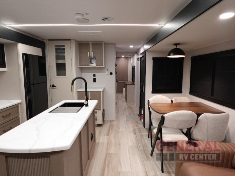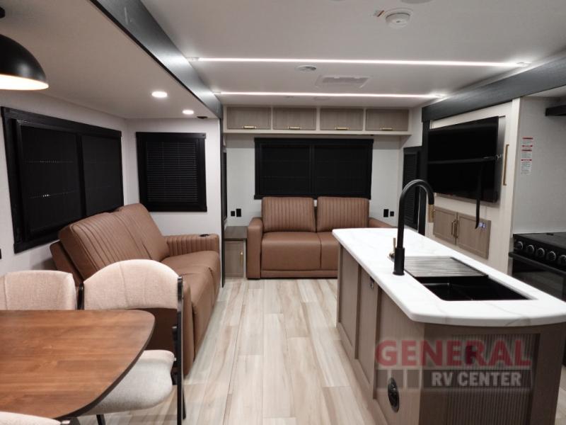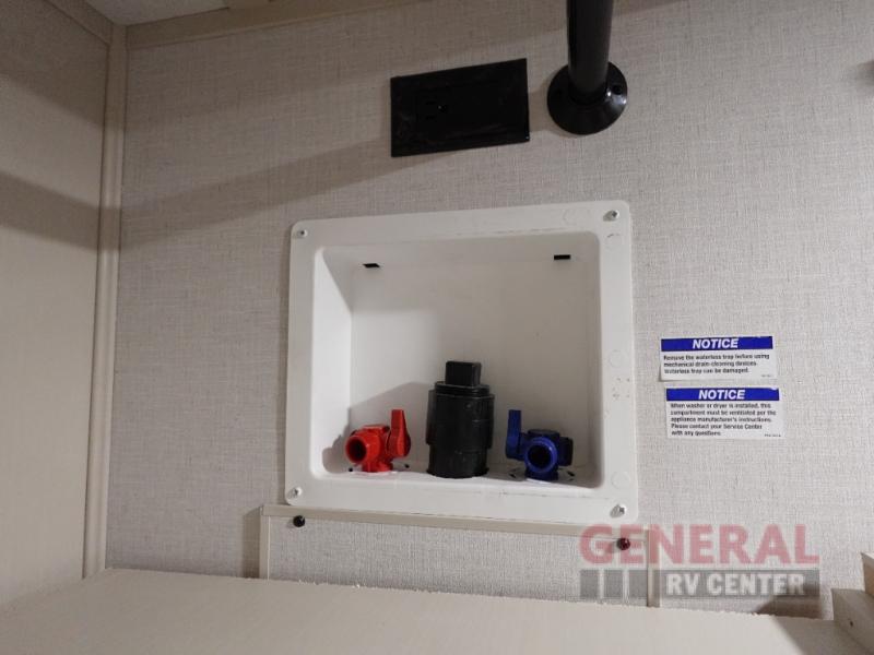 This travel trailer is decked out in features you will love like the front walk-in wardrobe with washer/dryer prep inside the front private bedroom! The full bathroom has everything you will need to get squeaky clean each morning including a residential walk-in shower with a skylight to let in some natural lighting. There is a hutch for you to store your dishes and a kitchen island to make meal prepping even easier. Once you have created a delicious meal, you can head to the booth dinette and enjoy eating it there comfortably while enjoying your view out of the panoramic window!