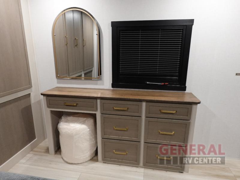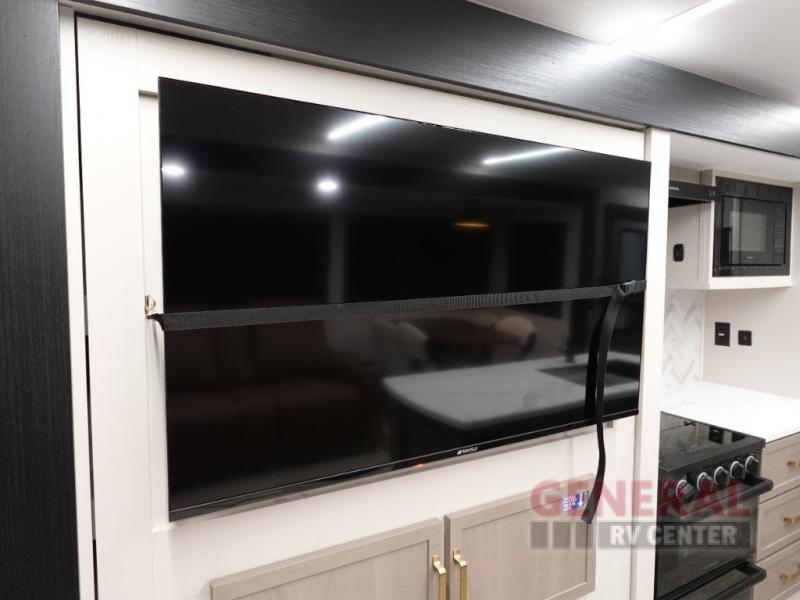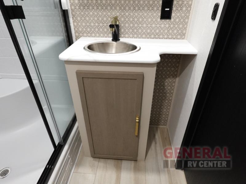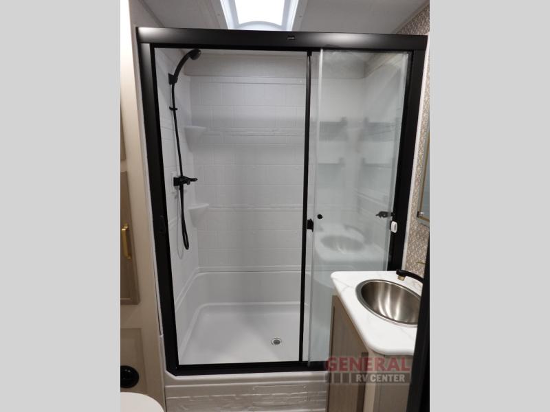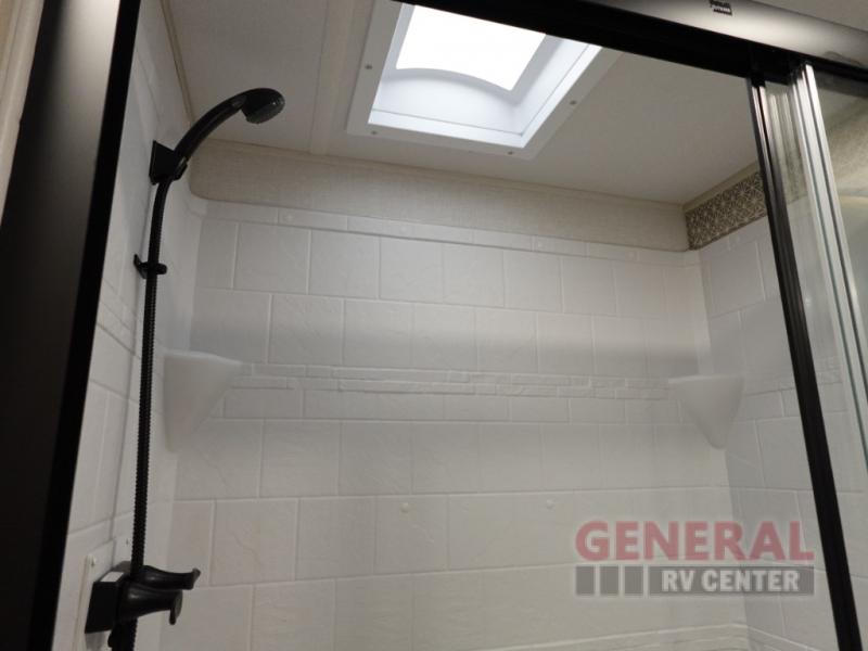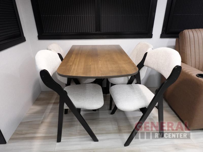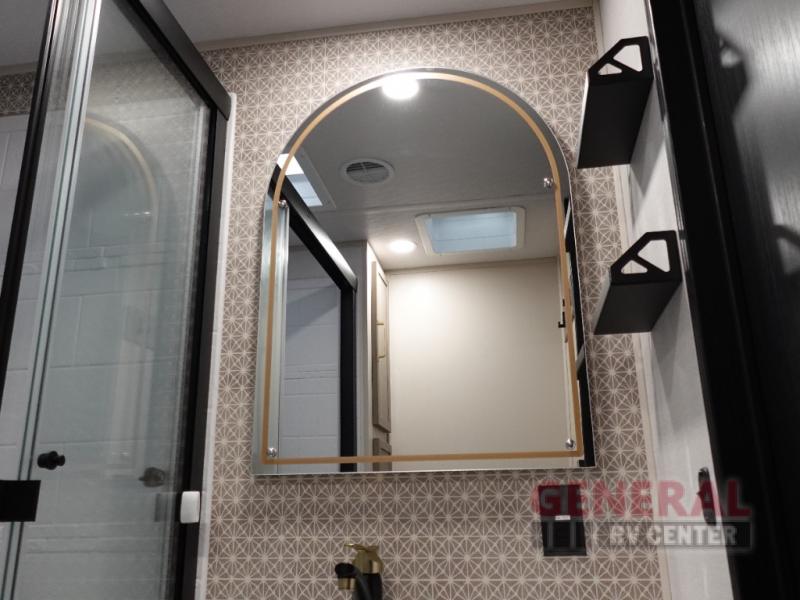 This travel trailer is decked out in features you will love like the front walk-in wardrobe with washer/dryer prep inside the front private bedroom! The full bathroom has everything you will need to get squeaky clean each morning including a residential walk-in shower with a skylight to let in some natural lighting. There is a hutch for you to store your dishes and a kitchen island to make meal prepping even easier. Once you have created a delicious meal, you can head to the booth dinette and enjoy eating it there comfortably while enjoying your view out of the panoramic window!