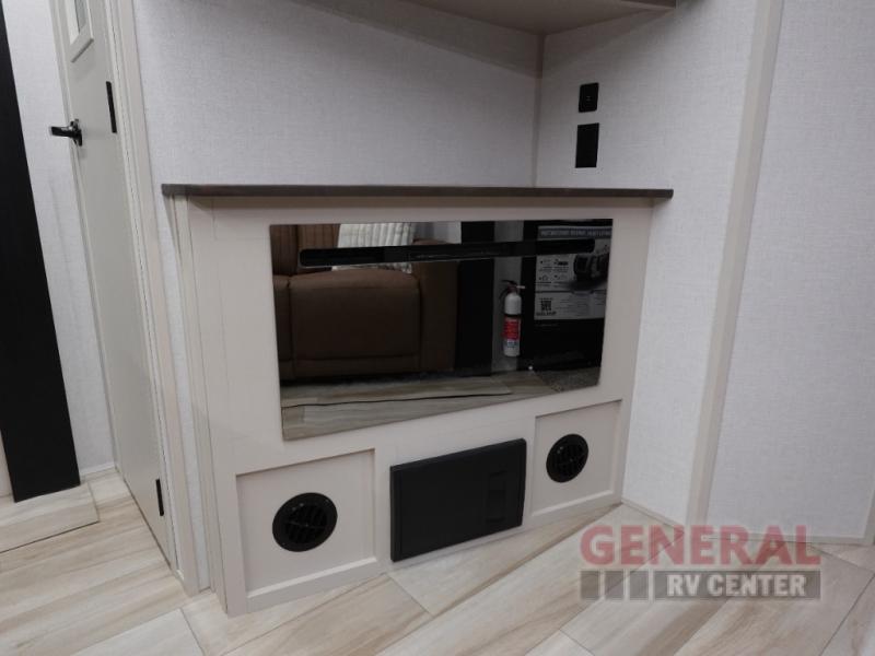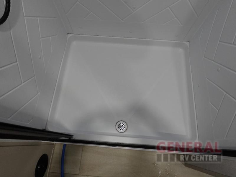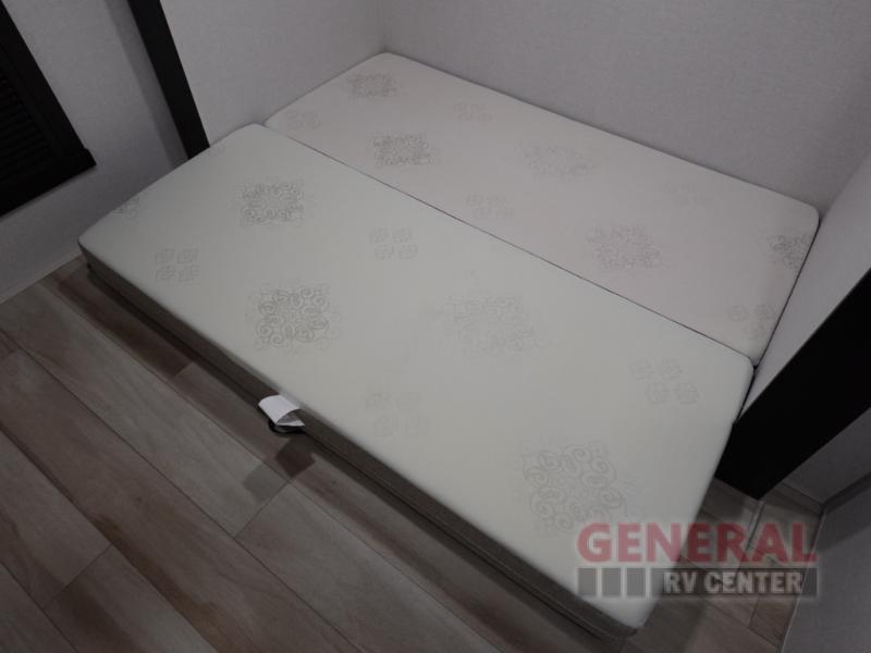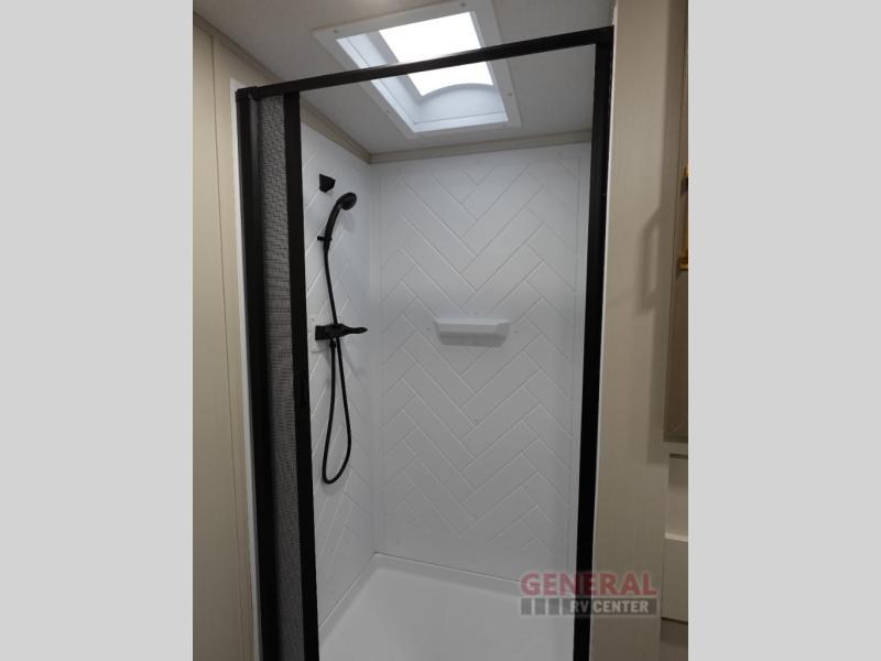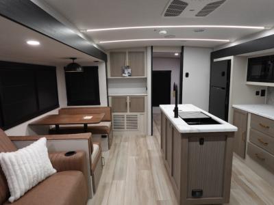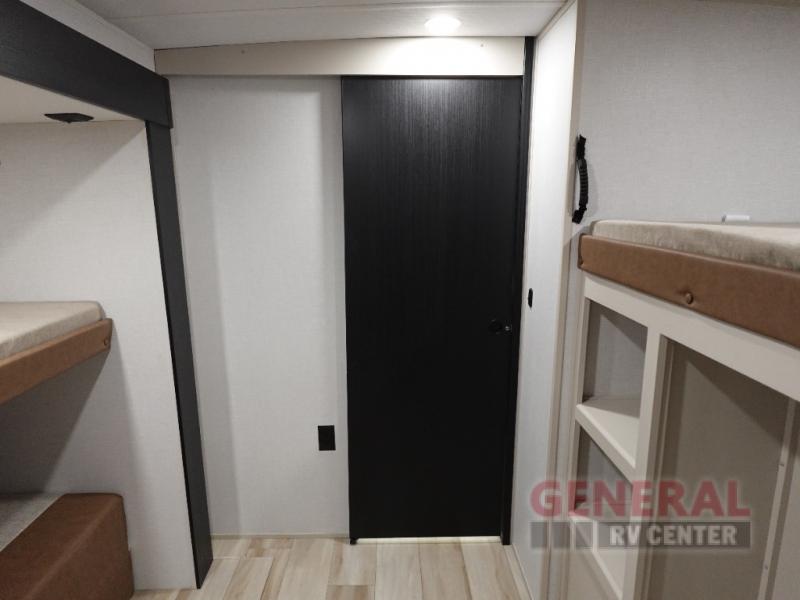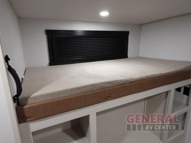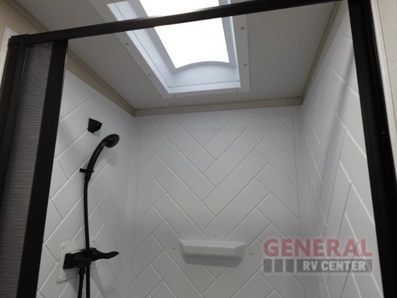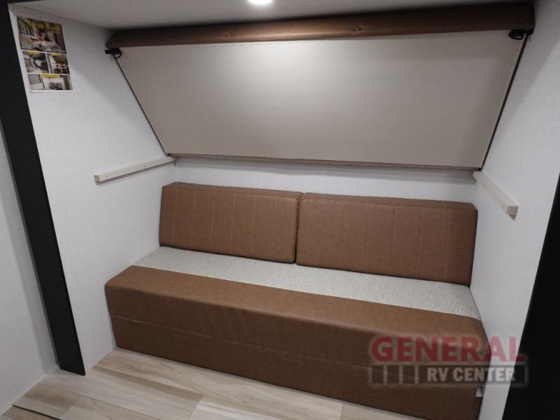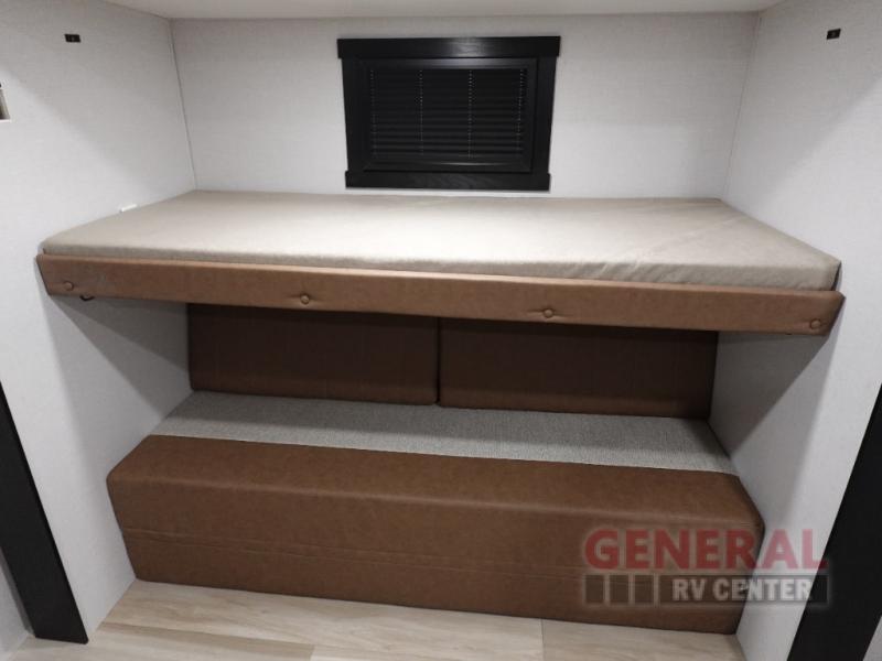 Your kids or friends are going to love camping in this travel trailer! It features a rear private bunkhouse with a bunk above a Versa queen convertible bed/sofa plus an additional bunk above an entertainment center with storage below. Just outside the bunkhouse is the kitchen with a 10 cu. ft. 12V black refrigerator, a microwave, a kitchen island, and a chef-sized walk-in pantry big enough to store everyone's favorite snacks. The booth dinette and the theatre seating are right next to panoramic windows so you can enjoy looking out at your beautiful scenery. You will also love taking a hot, steamy shower in the 30" x 36" shower with skylights and get a good night's rest on the queen bed in the front private bedroom!
