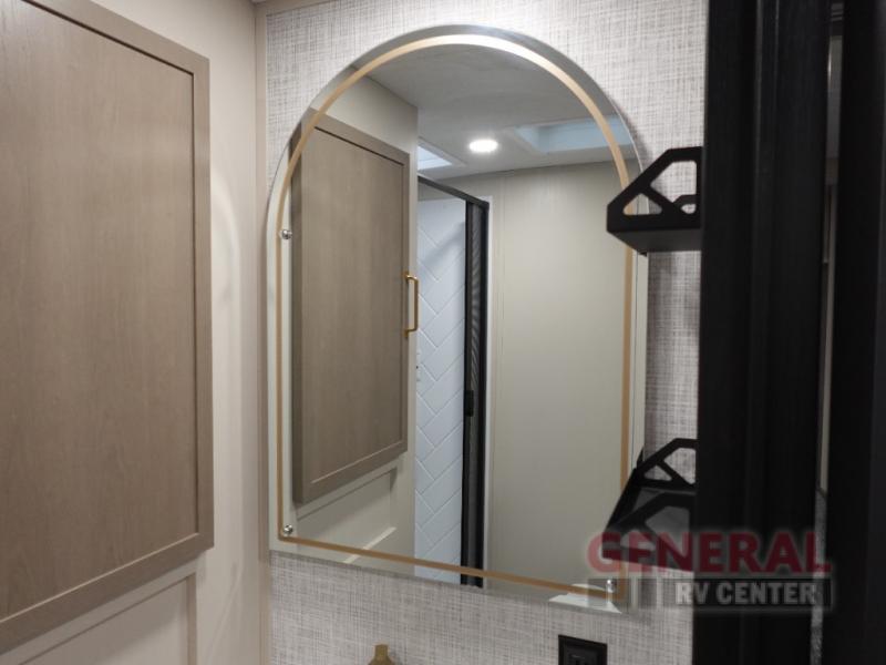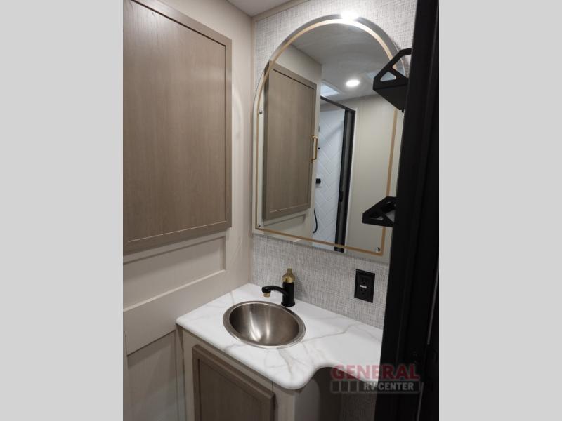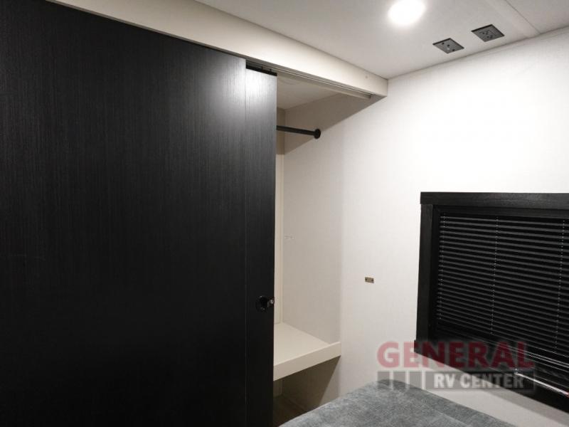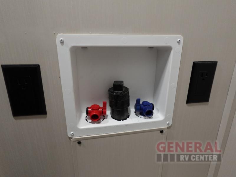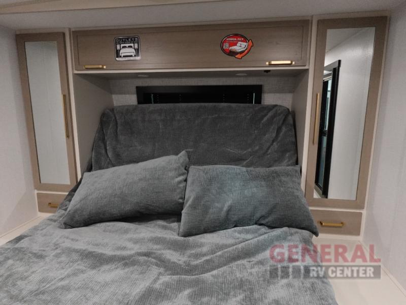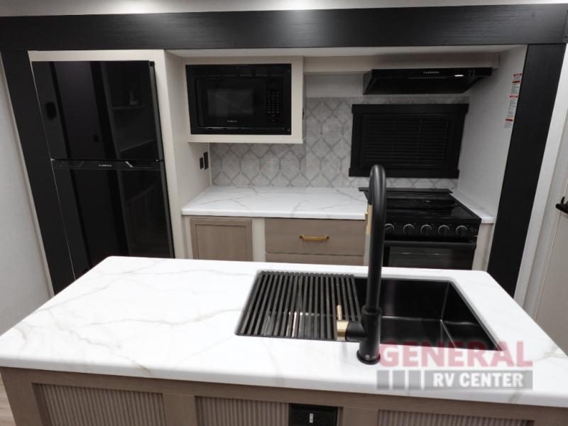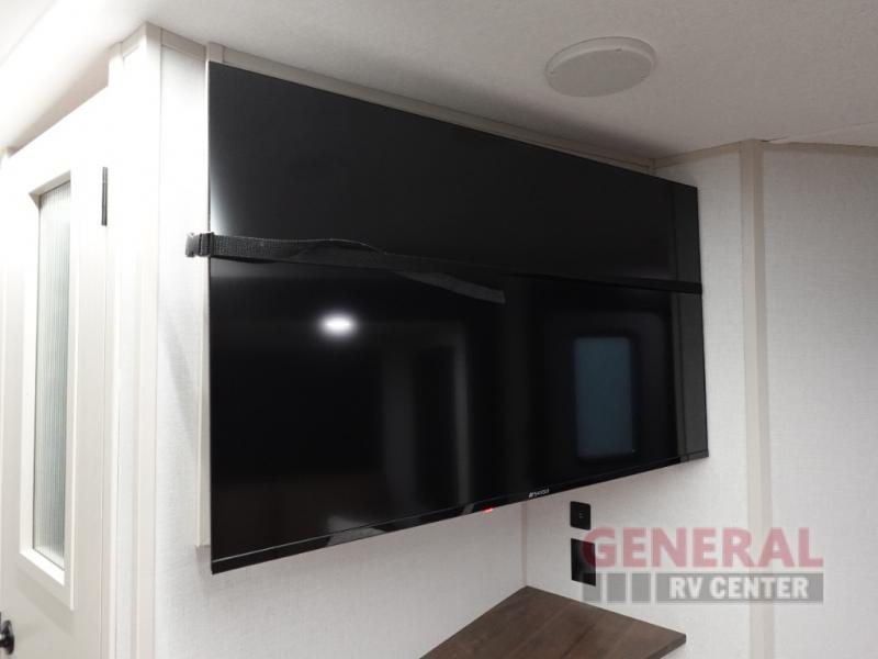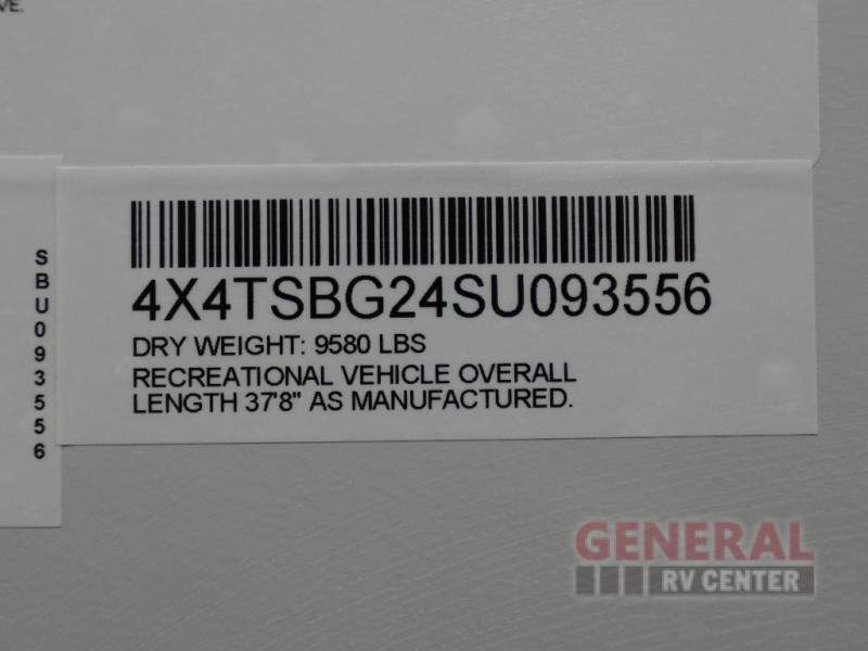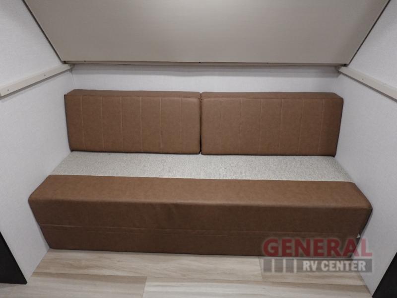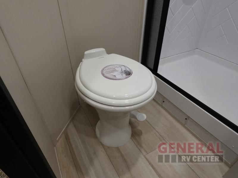 Your kids or friends are going to love camping in this travel trailer! It features a rear private bunkhouse with a bunk above a Versa queen convertible bed/sofa plus an additional bunk above an entertainment center with storage below. Just outside the bunkhouse is the kitchen with a 10 cu. ft. 12V black refrigerator, a microwave, a kitchen island, and a chef-sized walk-in pantry big enough to store everyone's favorite snacks. The booth dinette and the theatre seating are right next to panoramic windows so you can enjoy looking out at your beautiful scenery. You will also love taking a hot, steamy shower in the 30" x 36" shower with skylights and get a good night's rest on the queen bed in the front private bedroom!