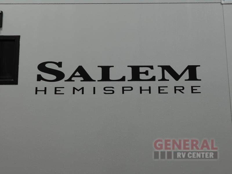 The Salem Hemisphere travel trailers by Forest River are packed with features, while still being value-minded! Each model is constructed with laminated "Aluma Frame" sidewalls and floor with block foam insulation plus an enclosed underbelly with 12V tank heaters on all holding tanks. There are LED awning, marker and taillights outside, along with an extra-large pass-thru storage with slam latch baggage doors, plus solar prep and Lippert On-The-Go ladder prep. The 60K on-demand tankless water heater will provide endless hot showers, and the JBL sound system includes a head unit plus interior and exterior speakers to keep the party going. There are also many interior comforts found throughout that will make you feel right at home!