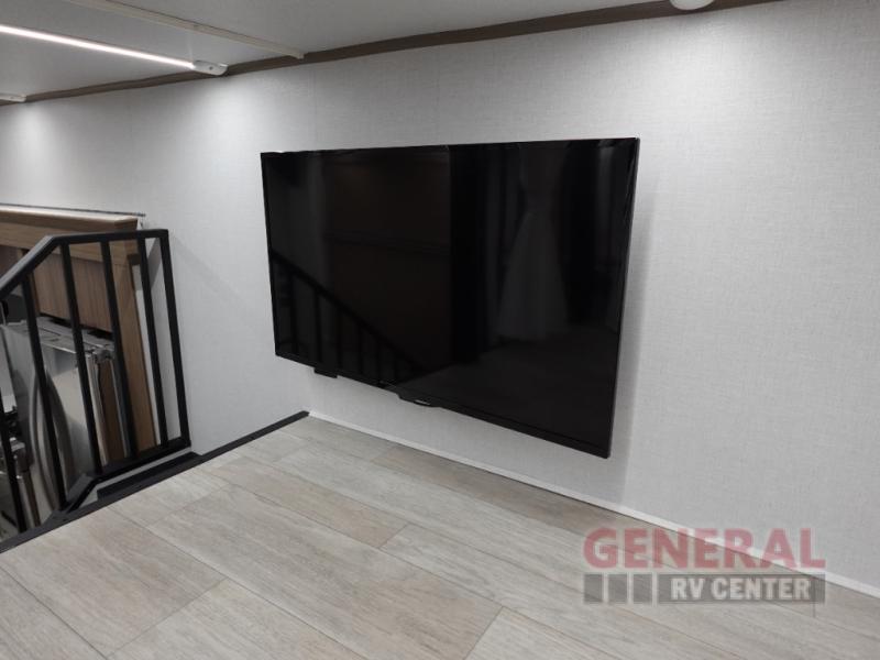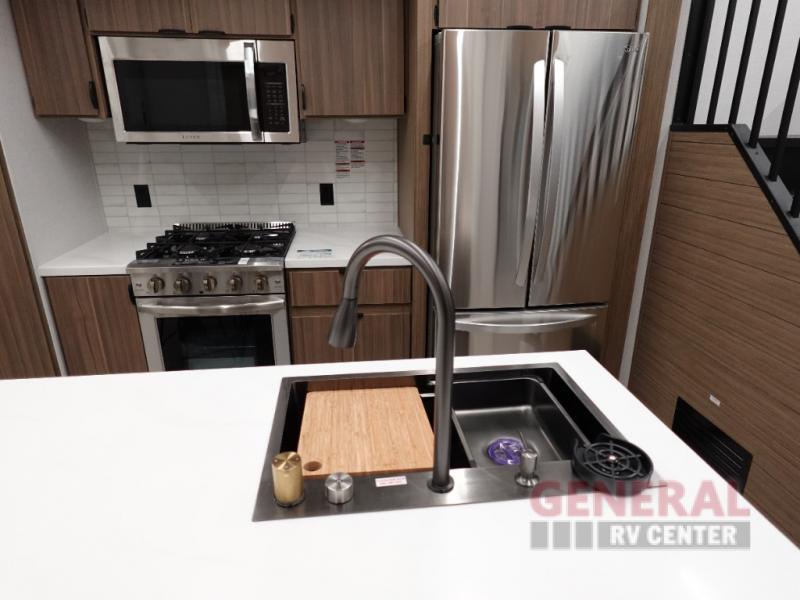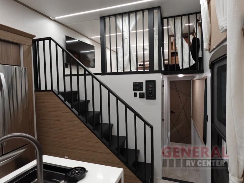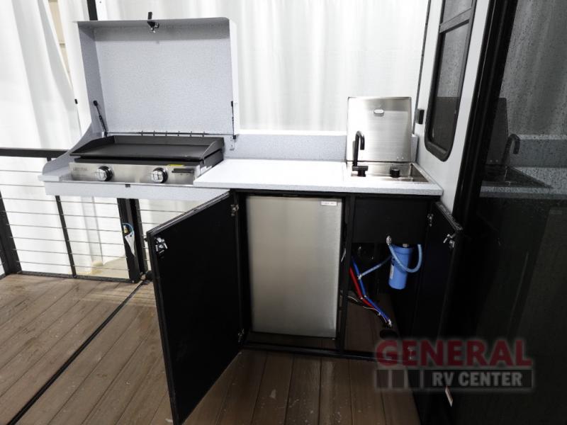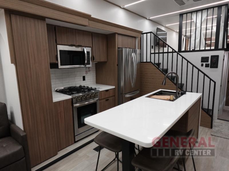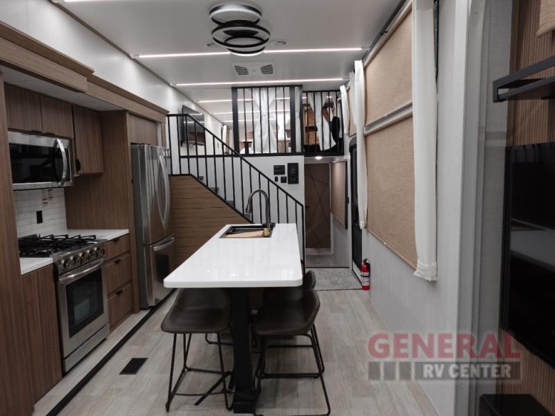 One look at this destination trailer and you'll be sold! The rear porch/veranda includes an outdoor kitchen with a cooktop and sink plus a ceiling fan so you can sit out back and visit with friends. The L-shaped sofa with an ottoman inside will provide cozy seating space, especially with the fireplace right across the room. Your crew can dine at the kitchen island with four chairs, and there is a large pantry where snacks can be kept for game night. When it's time to call it a night, the front private bedroom with a Versa-Tilt custom king bed is sure to bring comfort, and there is a dresser and wardrobe for your things. A third wardrobe includes washer and dryer prep if you choose to add those appliances. Any guests that aren't sleeping on the sofa can sleep in the loft with a queen bed, large front cabinet with shelves, and an additional cabinet for storage. You will also find a table with space below for your feet, so the kids can color, eat, and play games!