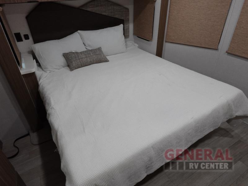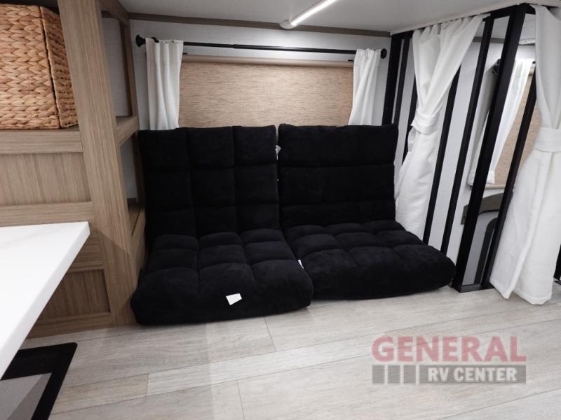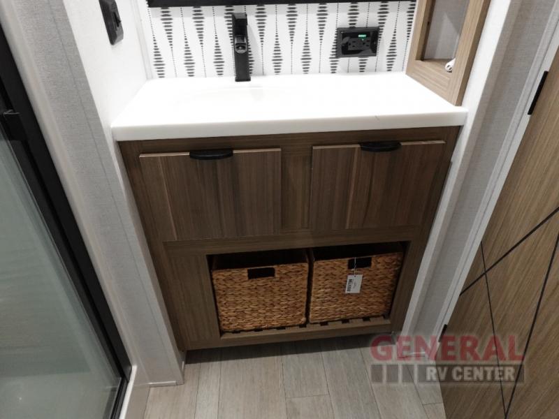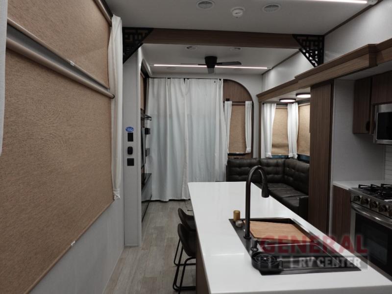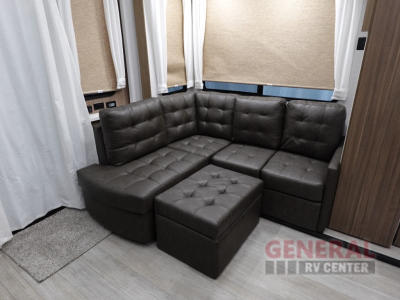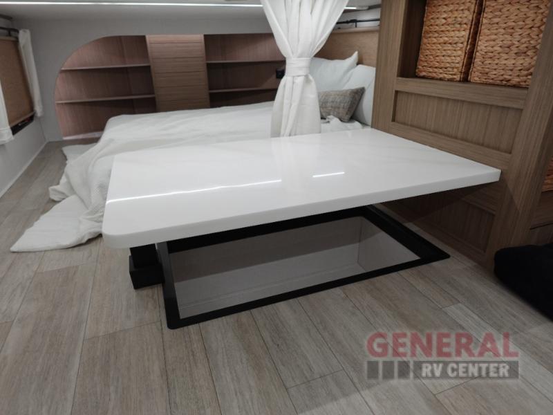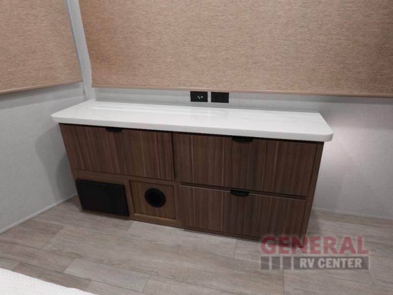 One look at this destination trailer and you'll be sold! The rear porch/veranda includes an outdoor kitchen with a cooktop and sink plus a ceiling fan so you can sit out back and visit with friends. The L-shaped sofa with an ottoman inside will provide cozy seating space, especially with the fireplace right across the room. Your crew can dine at the kitchen island with four chairs, and there is a large pantry where snacks can be kept for game night. When it's time to call it a night, the front private bedroom with a Versa-Tilt custom king bed is sure to bring comfort, and there is a dresser and wardrobe for your things. A third wardrobe includes washer and dryer prep if you choose to add those appliances. Any guests that aren't sleeping on the sofa can sleep in the loft with a queen bed, large front cabinet with shelves, and an additional cabinet for storage. You will also find a table with space below for your feet, so the kids can color, eat, and play games!