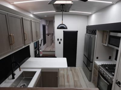 Each Wildwood Heritage Glen Elite Series fifth wheel by Forest River is constructed with vacuum bonded "Aluma Frame" sidewalls and floor, block foam insulation, and an AccessiBelly underbelly with 12V tank heaters on all holding tanks to help extend your camping season. There is an exterior docking station with hot and cold water, along with power stabilizer jacks and landing gear, and Maxxis radial tires with black accented rims. There is also an in-line water filtration system, an RV Airflow system, and an extra large pass-through storage with Slam Latch baggage doors for hassle-free packing. You will love the high-end solid surface countertops inside, along with gold-accented faucets with stainless steel sinks in all bathrooms, and summer wind colored horizontal plank linoleum flooring that is both stylish and easy to keep clean!