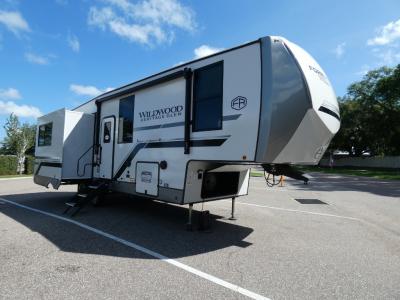 With any Wildwood Heritage Glen fifth wheel by Forest River, the quality construction, attention to detail and design along with a bright and welcoming interior allows you to relax in comfort. You'll love the high-end solid surface countertops included in the Elevated Value Package, along with a JBL sound system, full-length barreled ceilings, and an ultimate interior lighting upgrade. The included Expedition Package features an Accesibelly underbelly panel with 12V tank heaters, nitrogen-filled tires with aluminum rims, and a spacious 30" wide main entry door with a window. The Lippert On-The-Go ladder prep and back-up camera prep let you customize your fifth wheel even more, and the LED awning, front cap, marker and taillights will make it easier than ever to set up camp!