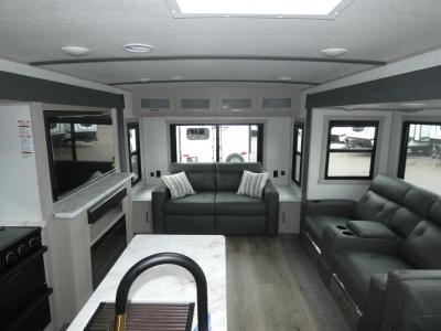 It's time to head to your destination with this Wildwood Heritage Glen travel trailer, whether it be a state park, RV resort, or your own land. Once you arrive, you can easily open up the dual opposing slides for more interior space and start planning your day. You might like to cook a meal, wash dishes using the kitchen island, and dine at the booth dinette, or you can choose the free-standing table option instead. Your guests may choose to relax in the theatre seats or the tri-fold sofa while watching TV, and the outside kitchen/bar will surely be a useful area when wanting to be outside. Don't worry about storage because the extra large pass-through compartment is available for your camping chairs, tables, fishing rods, and such.