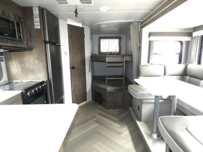 The double-size bunks pack a lot of extra sleeping space into this Wildwood X-Lite travel trailer! Some of the other comfortable features that you will find are the U-shaped dinette that has panoramic windows surrounding it, the entertainment center with an electric fireplace below, the private bedroom with a custom king bed with Versa Tilt, and the walk-in pantry that will make it easy to grab your spices and snacks. It is extremely easy to reach the bathroom from both the interior and exterior because it contains the second entry/exit door, and the oversized refrigerator in the kitchen is going to be able to hold all of the produce that your family likes to eat. You also have an 18' awning that provides a protected area to relax and enjoy nature and an exterior camp kitchen with a griddle!