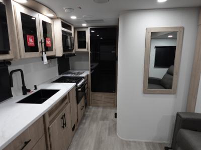 Walk-Thru Bath, Two Entry/Exit Doors, 28 ft 5 in in length, weighs 5831 lbs lbs, sleeps up to 3, 1 slides, many colors ...more