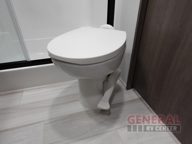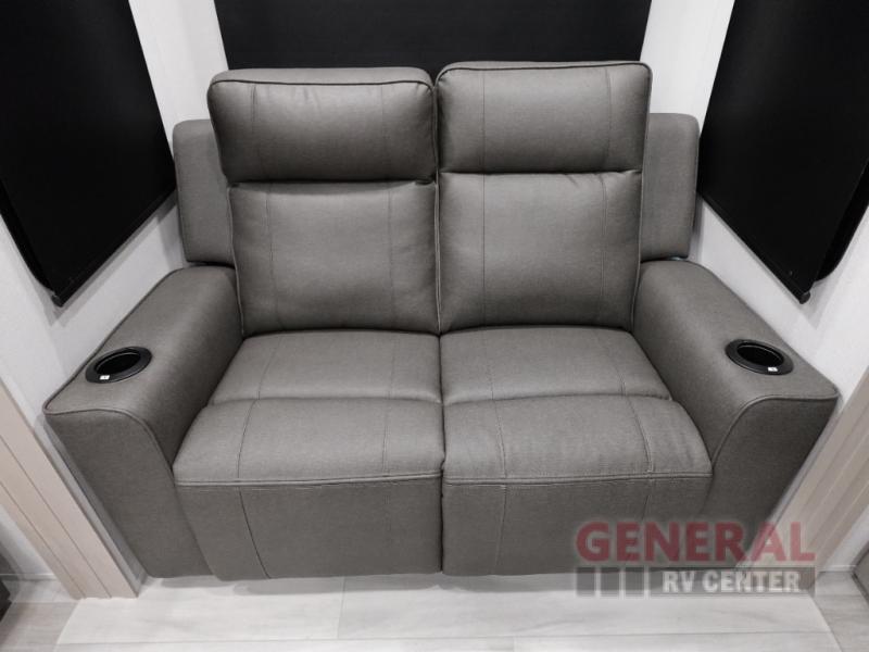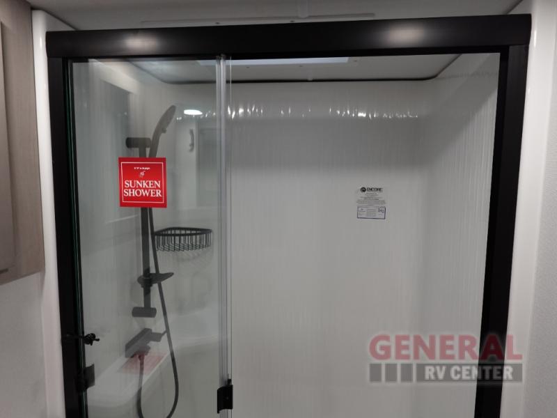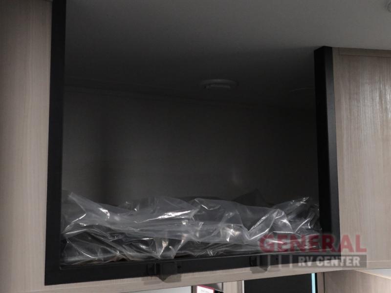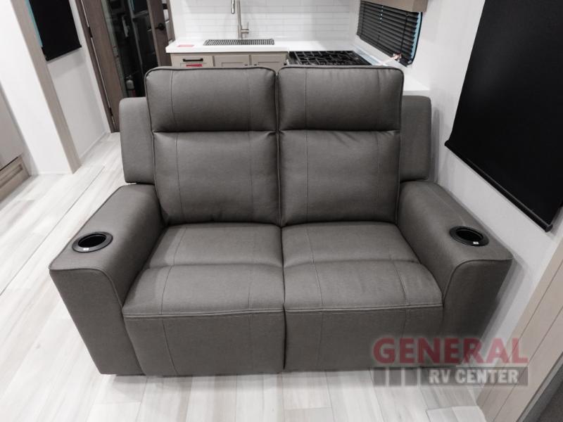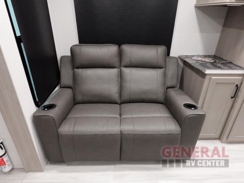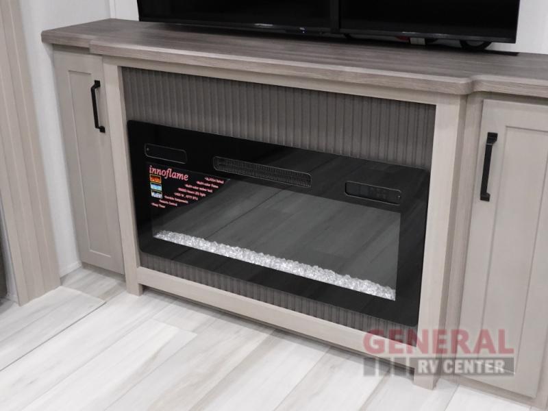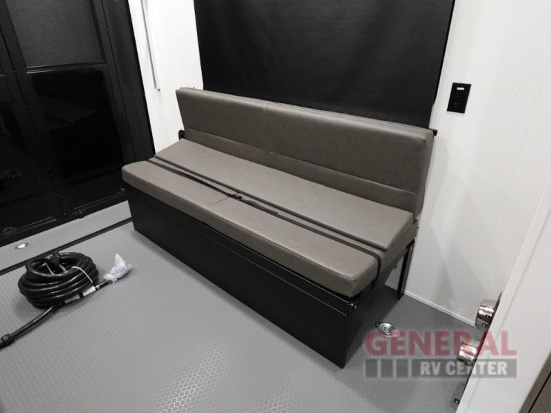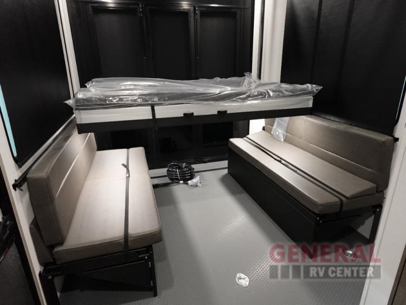 A 14' separate garage in this toy hauler offers plenty of space for your off-road toys! You will appreciate the convenience of having a full bathroom with a walk-in shower and you can even add an optional half bath to the garage area. You will also appreciate the two entry doors, and flip-up pet dish. The rear ramp door can even be converted into a patio, plus there are exterior speakers to keep the party going. Everyone will love hanging out in the separate living area with a fireplace at the entertainment center, two theater seating slides, and a third theater seating. The fully equipped kitchen has everything you need to prepare delicious home cooked meals. The front private bedroom offers an escape to rest and relax on a queen bed for the next ride!