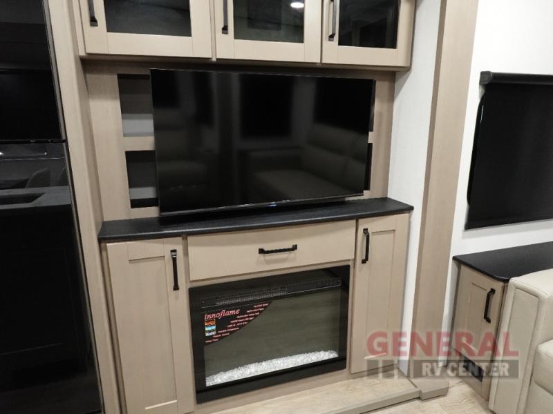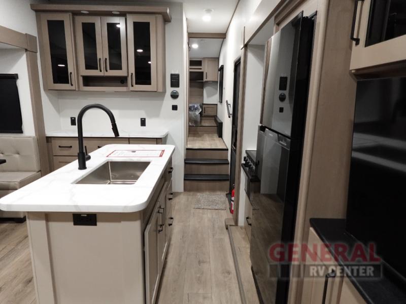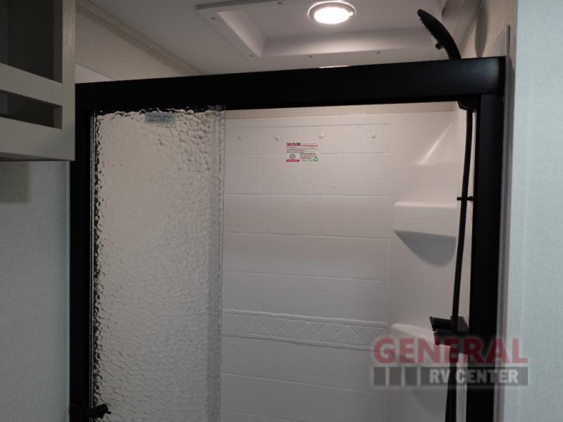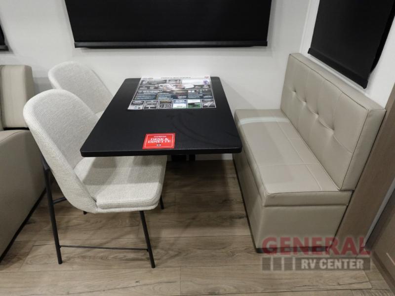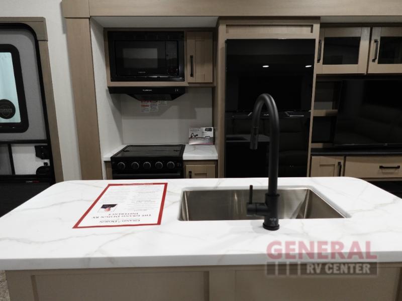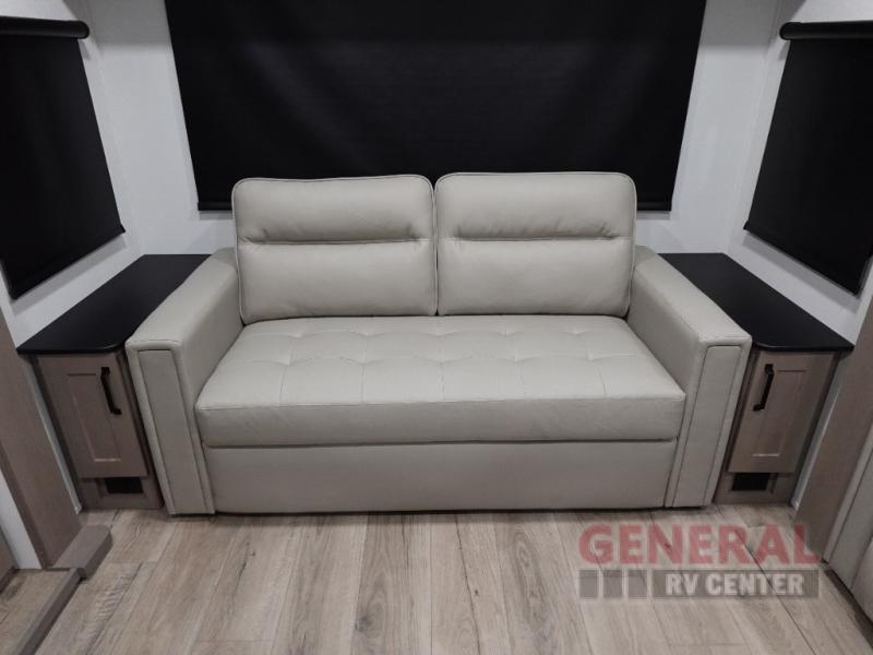 You'll love the amount of space you have in this fifth wheel thanks to the dual opposing slides in the rear living area/kitchen. Your friends and family can relax on the tri-fold sofa or theater seating across from the high-definition 40" LED TV. There is also a booth dinette or you can choose the optional swivel dinette if you prefer that seating. The chef of your group will appreciate having a kitchen island that will provide more counter space, plus there is a hutch with overhead cabinets for nice dishes. A full bath onboard lets you clean up each day and the front private bedroom includes a queen bed just like at home. You'll also love spending time outdoors under the electric awning, and there is an unobstructed pass-thru storage for fishing poles, hiking gear, and camp chairs!