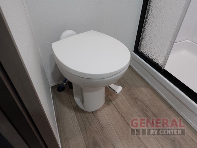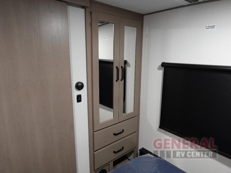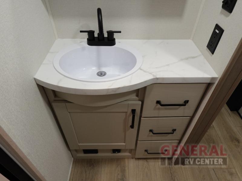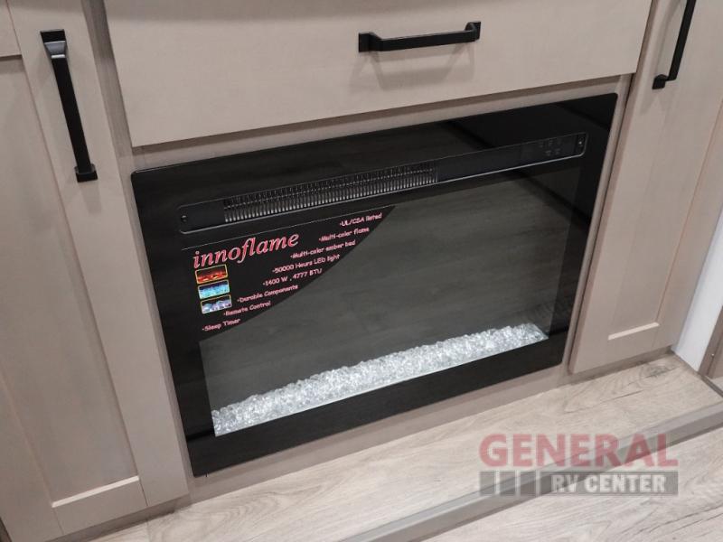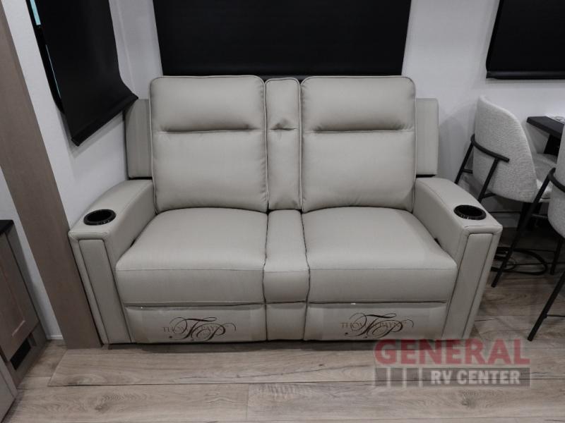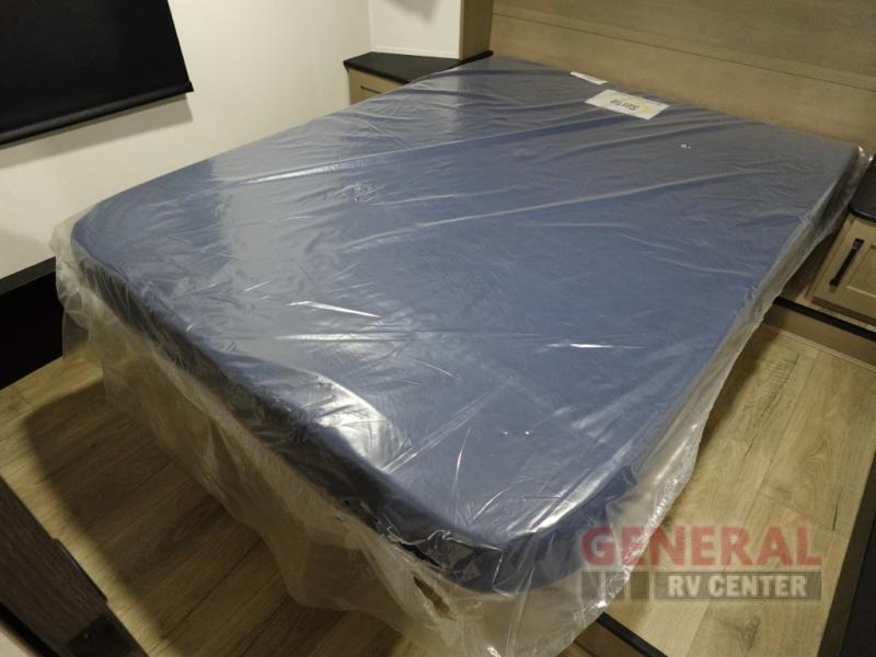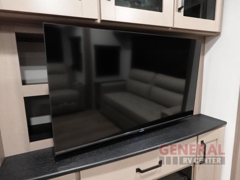 You'll love the amount of space you have in this fifth wheel thanks to the dual opposing slides in the rear living area/kitchen. Your friends and family can relax on the tri-fold sofa or theater seating across from the high-definition 40" LED TV. There is also a booth dinette or you can choose the optional swivel dinette if you prefer that seating. The chef of your group will appreciate having a kitchen island that will provide more counter space, plus there is a hutch with overhead cabinets for nice dishes. A full bath onboard lets you clean up each day and the front private bedroom includes a queen bed just like at home. You'll also love spending time outdoors under the electric awning, and there is an unobstructed pass-thru storage for fishing poles, hiking gear, and camp chairs!