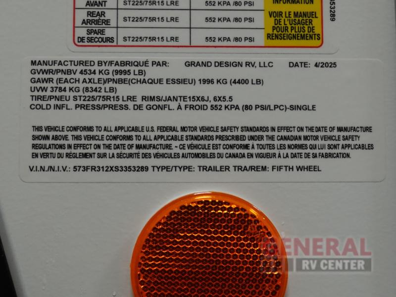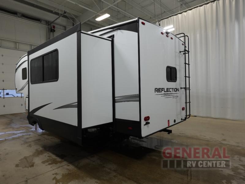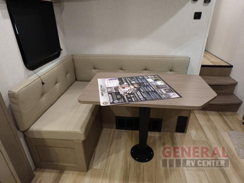 With any Reflection 150 Series fifth wheel by Grand Design, there is more available payload capacity and a broader range of half-ton trucks capable of towing this fifth wheel, and no slider hitch is needed thanks to the 90-degree turning radius which makes them short bed friendly and easier to tow. The mandatory Ultimate Power package provides a "One-Touch" automatic leveling system and a detachable power cord with LED light for easy setup, plus motion sensor pass-through lighting and entry lighting, and the Tire Linc TPMS will help you stay safe on the road. The interior offers residential luxury from the cabinetry and premium Congoleum flooring, to the booth dinette and residential-style window treatment. Make your refined decision today!