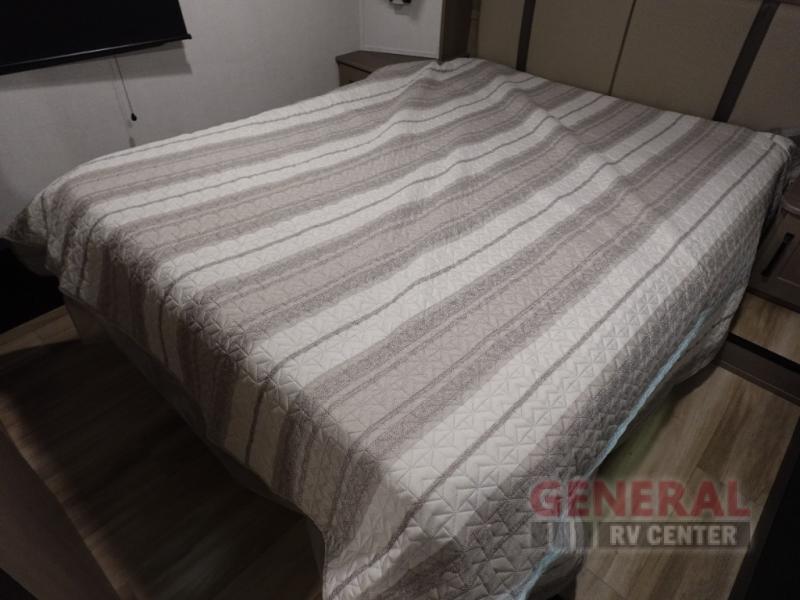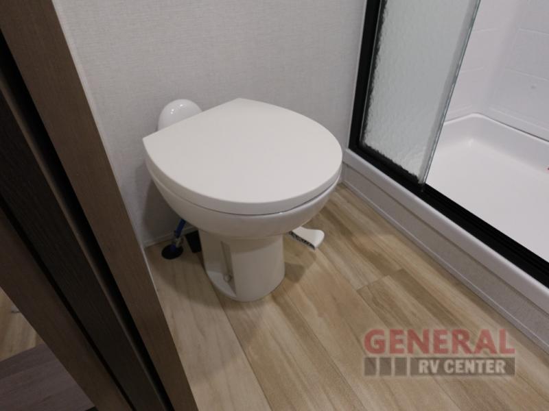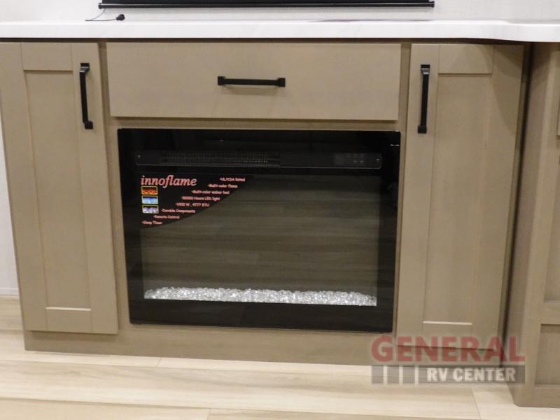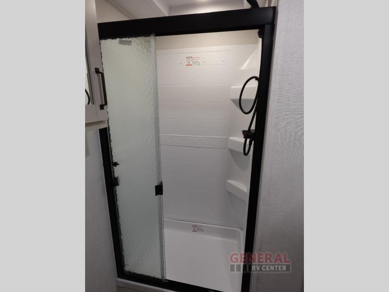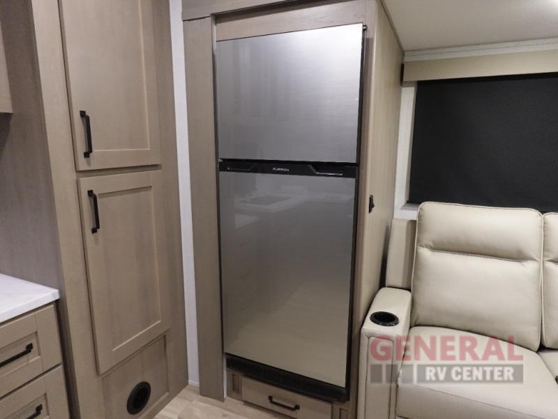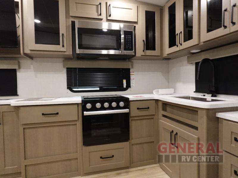 You will love this fifth wheel featuring a single slide for added interior living space and all the comforts and conveniences it provides you while you travel. The slide features a 78" theater seat plus there is a breakfast nook for more seating. Both can easily view the entertainment center with 40" TV. A rear kitchen indoors provides everything you need to create meals like home while on the road, and if you want to spend as much time outside as possible, then the outdoor griddle will certainly accommodate you for meals. Up front, a cozy private bedroom with queen bed, wardrobe, and overhead cabinets. Right next door, you will find a large walk-in shower, as well as a toilet, and a vanity with sink and linen cabinet for your towels and toiletries. You will also love the full unobstructed pass-through compartment for all of your gear, plus so much more!