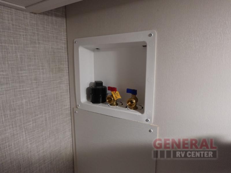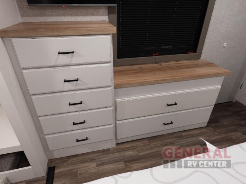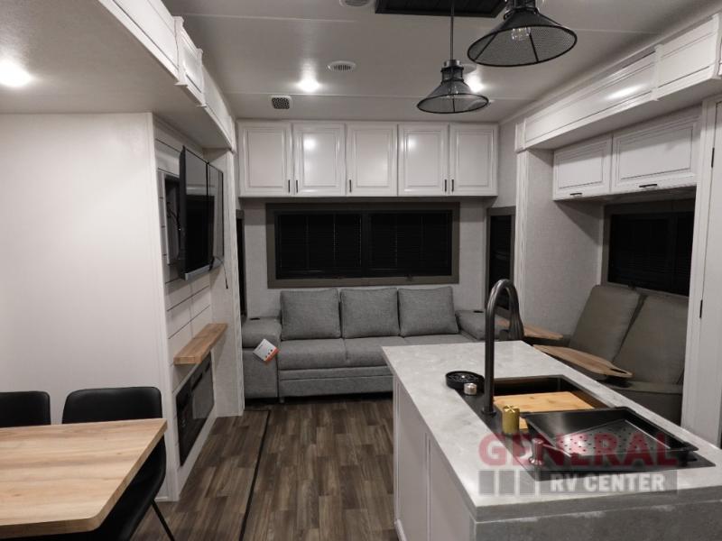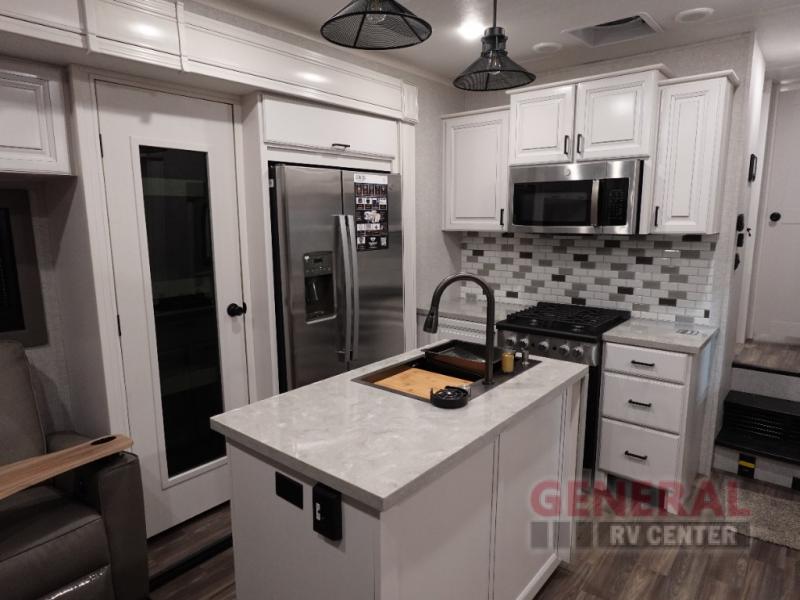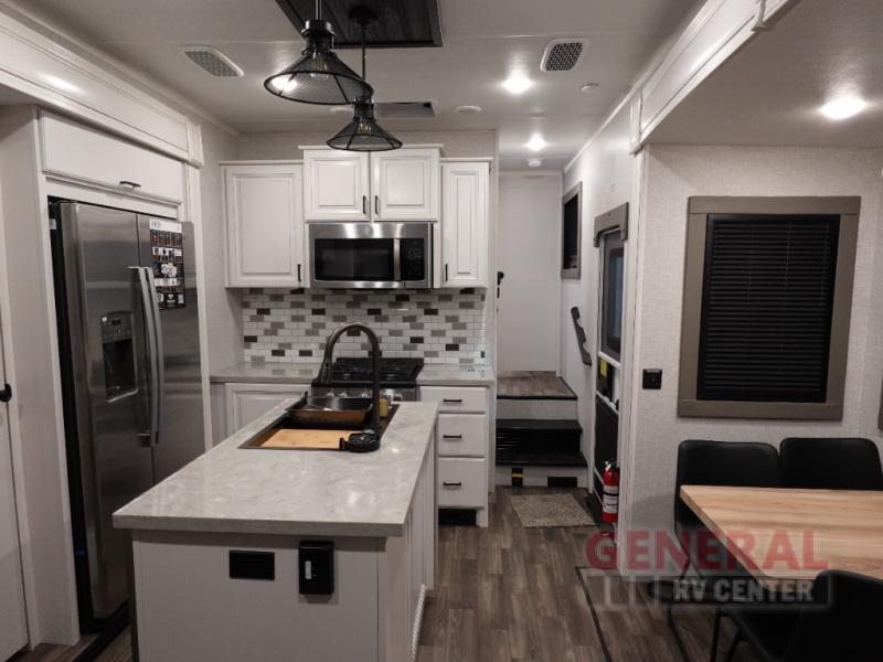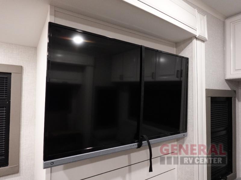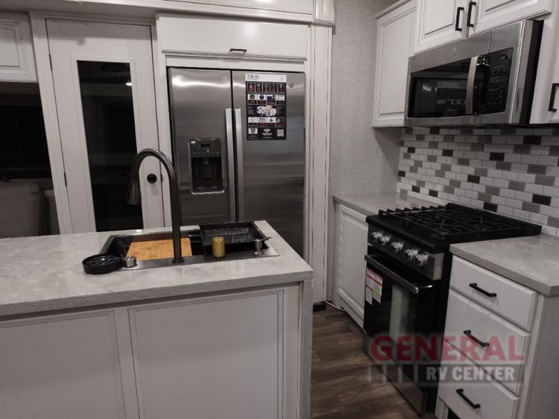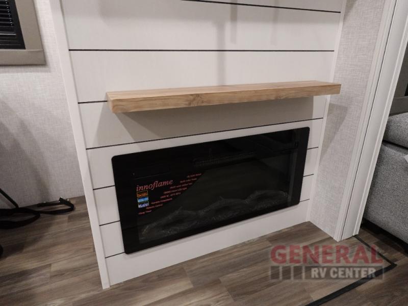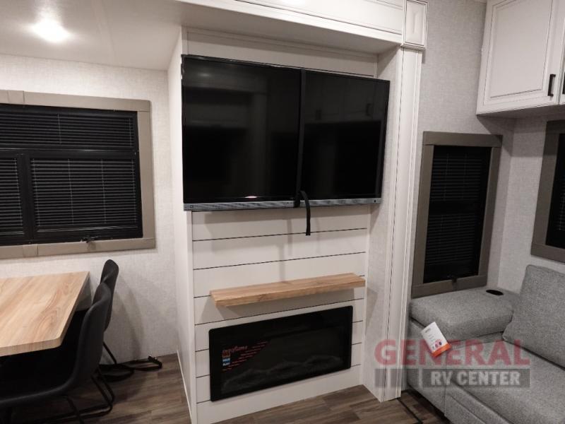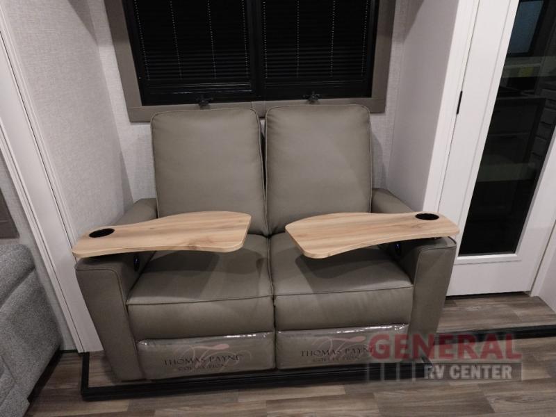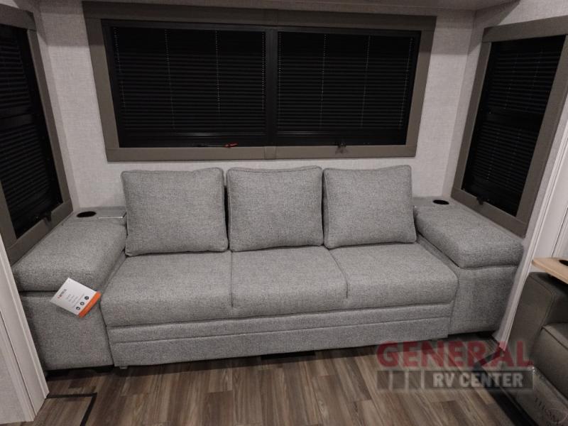 You will love the great space and layout in this amazing fifth wheel! The rear living area features theater seats as well as a tri-fold sofa with adjustable headrests. It's the perfect place to watch a movie on the 40" Smart TV located in the entertainment center with fireplace! The kitchen includes a full suite of GE residential appliances, including a 4-burner range, 21 cu. ft. refrigerator, and over-the range microwave. Also, standard are a dishwasher and central vacuum system so cleaning up is easy! At night retire to the bedroom with its king bed with power base. A second TV lets you watch your favorite shows as you fall asleep. Storage abounds including a full wardrobe and dresser with pull-out top. A dual-entry full bath is easily accessible and includes even more storage with a linen closet!