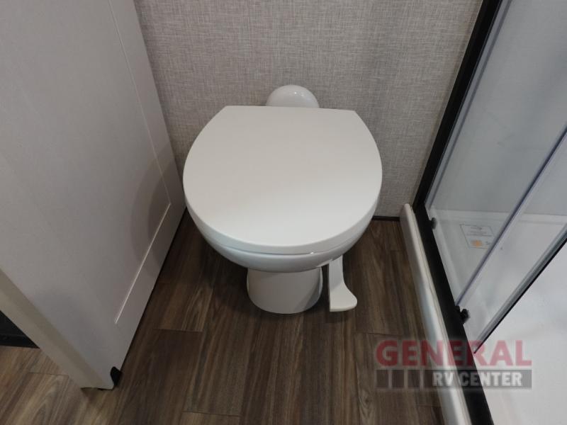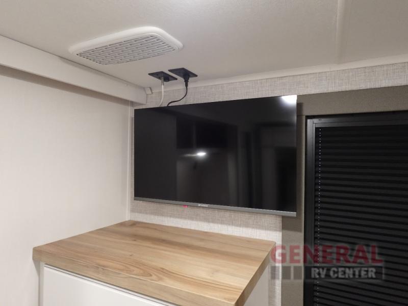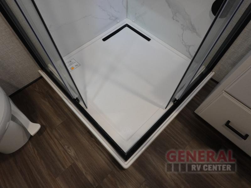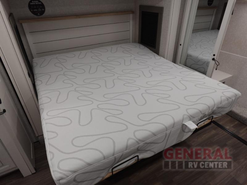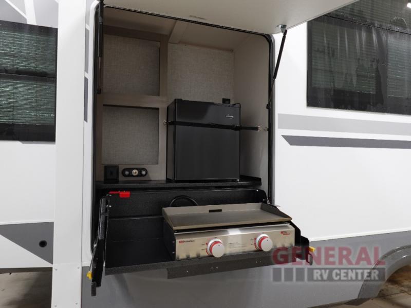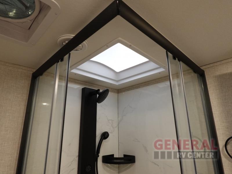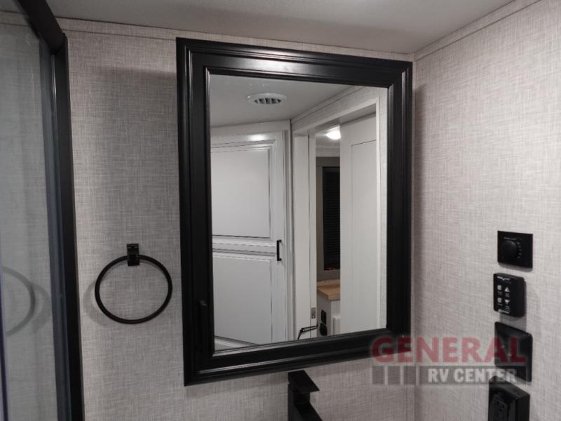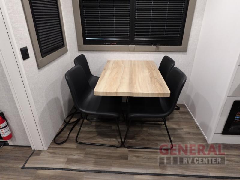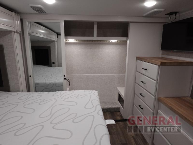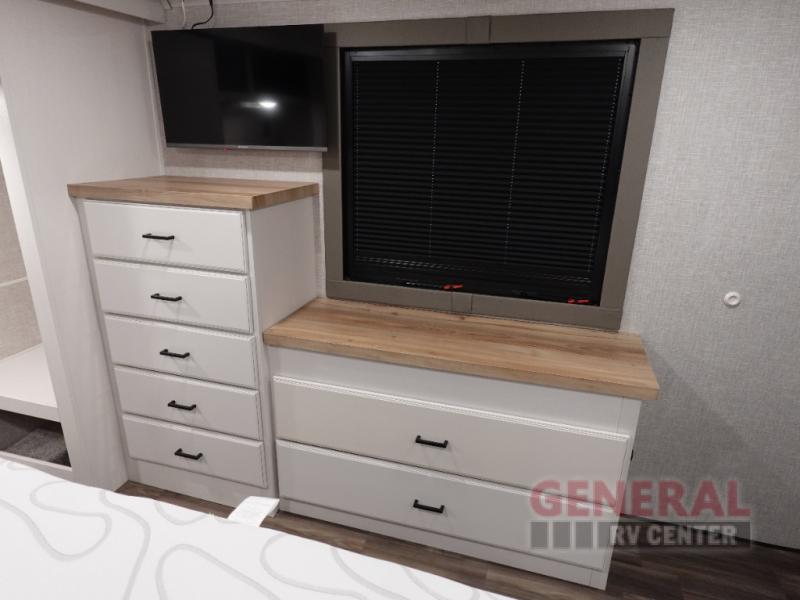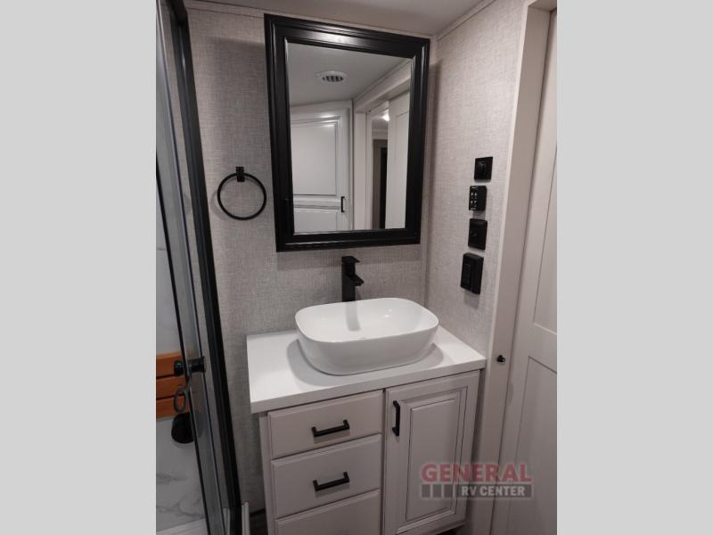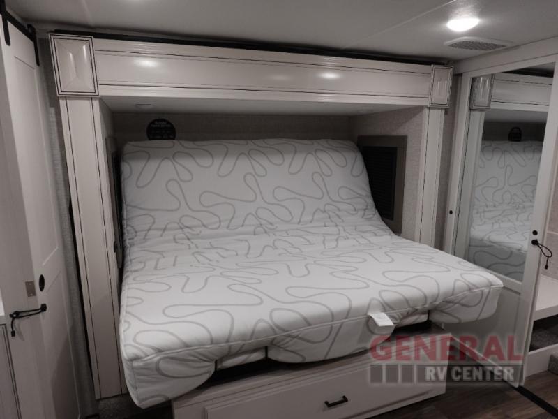 You will love the great space and layout in this amazing fifth wheel! The rear living area features theater seats as well as a tri-fold sofa with adjustable headrests. It's the perfect place to watch a movie on the 40" Smart TV located in the entertainment center with fireplace! The kitchen includes a full suite of GE residential appliances, including a 4-burner range, 21 cu. ft. refrigerator, and over-the range microwave. Also, standard are a dishwasher and central vacuum system so cleaning up is easy! At night retire to the bedroom with its king bed with power base. A second TV lets you watch your favorite shows as you fall asleep. Storage abounds including a full wardrobe and dresser with pull-out top. A dual-entry full bath is easily accessible and includes even more storage with a linen closet!