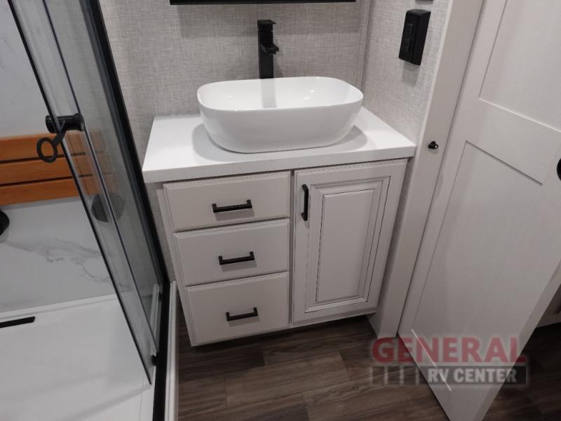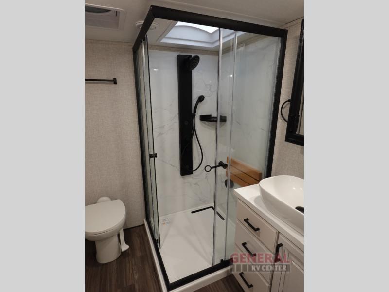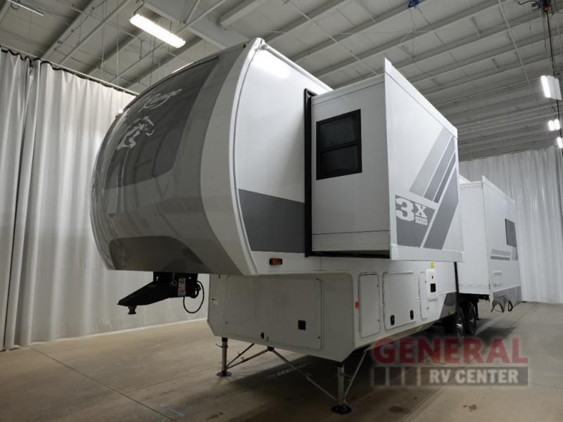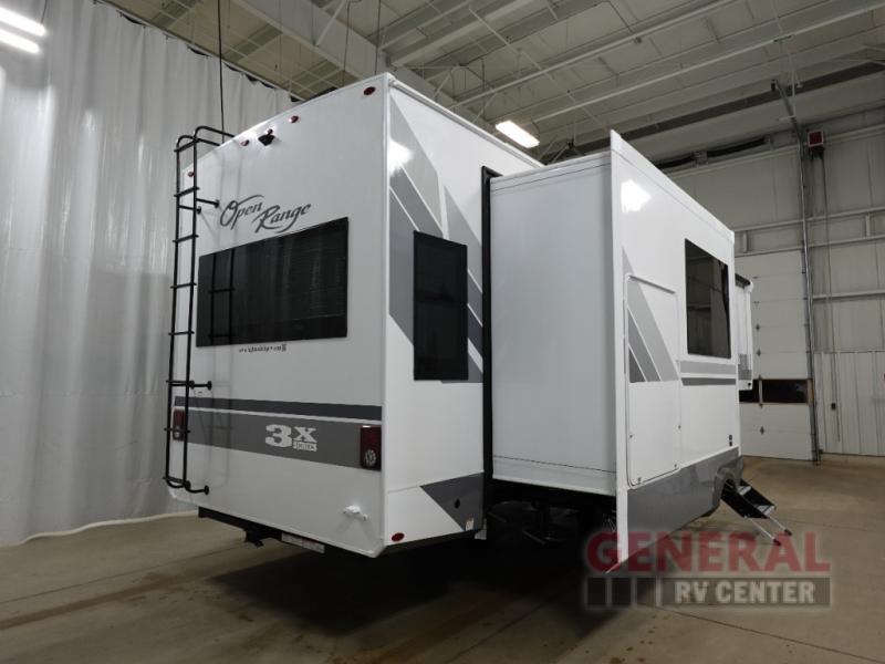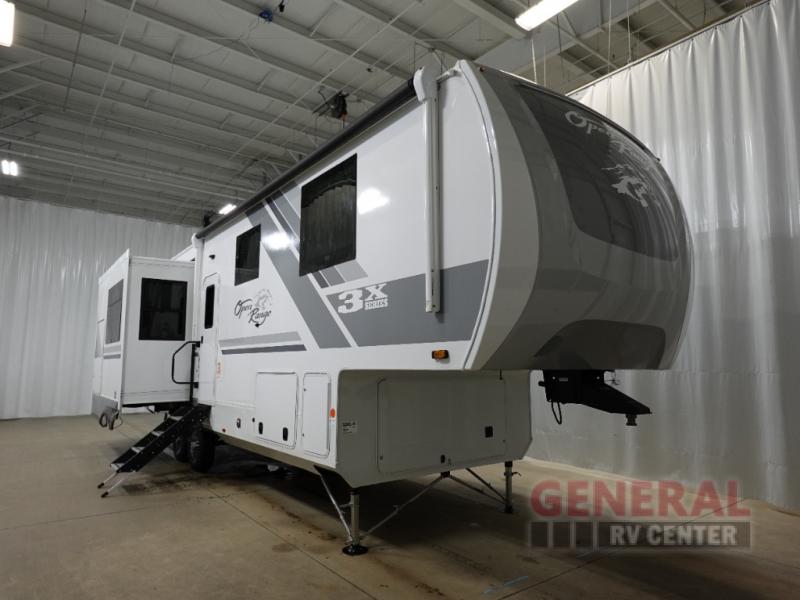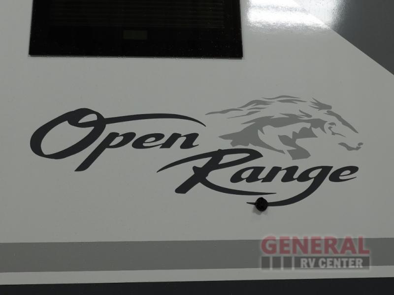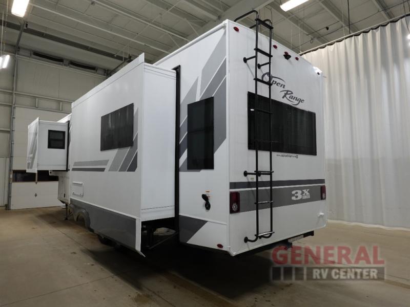 With any Open Range 3X fifth wheel by Highland Ridge, you will enjoy residential luxuries and an exceptional build. The TuffShell construction includes vacuum bonded laminated fiberglass and welded aluminum frames for added strength, and the PVC roofing membrane is ultra durable. You can plan to camp year around or go full-time since there is a mandatory Four Season Package that includes a heated and enclosed underbelly, a 40K BTU high-performance furnace, double insulated baggage doors, and more. The residential features continue on with the mandatory Executive Package with the TravelLINK Smart RV system, Keyed-Alike entry and baggage doors, painted fiberglass front cap with LED lighting, and three 15,000 BTU A/C units with quiet residential return air. Inside, you'll enjoy GE Profile kitchen appliances, sleek square windows with integrated blinds, ceramic subway tile backsplash, a glass shower door, and the list of amenities goes on!