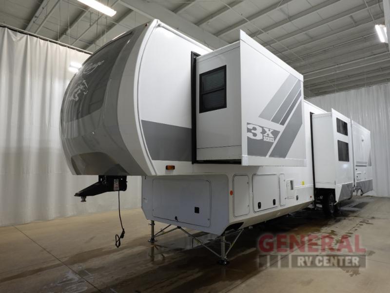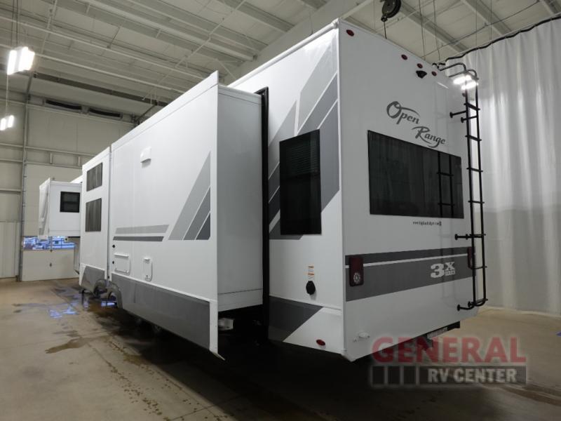 With any Open Range 3X fifth wheel by Highland Ridge, you will enjoy residential luxuries and an exceptional build. The TuffShell construction includes vacuum bonded laminated fiberglass and welded aluminum frames for added strength, and the PVC roofing membrane is ultra durable. You can plan to camp year around or go full-time since there is a mandatory Four Season Package that includes a heated and enclosed underbelly, a 40K BTU high-performance furnace, double insulated baggage doors, and more. The residential features continue on with the mandatory Executive Package with the TravelLINK Smart RV system, Keyed-Alike entry and baggage doors, painted fiberglass front cap with LED lighting, and three 15,000 BTU A/C units with quiet residential return air. Inside, you'll enjoy GE Profile kitchen appliances, sleek square windows with integrated blinds, ceramic subway tile backsplash, a glass shower door, and the list of amenities goes on!