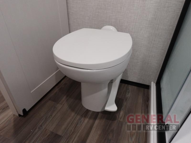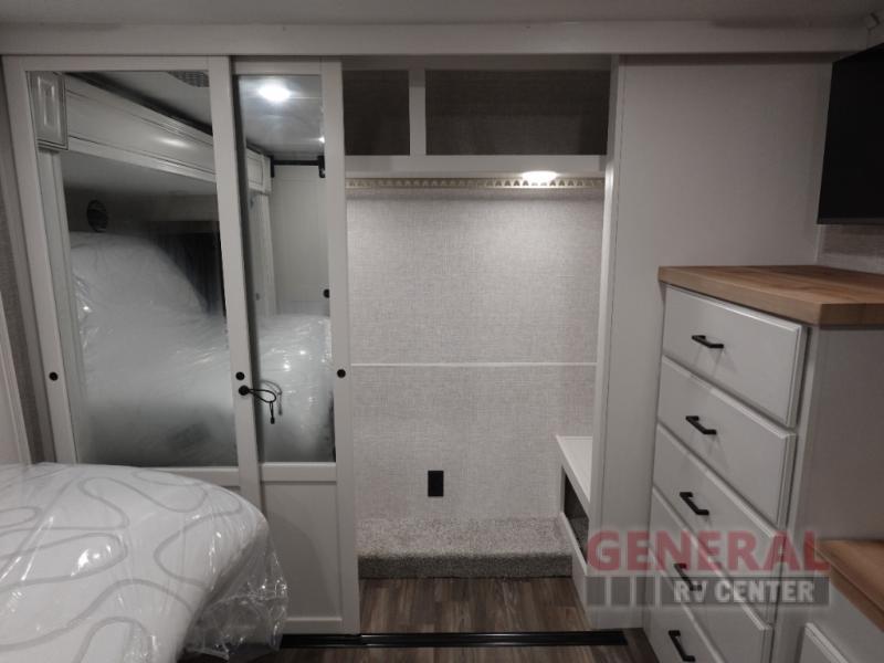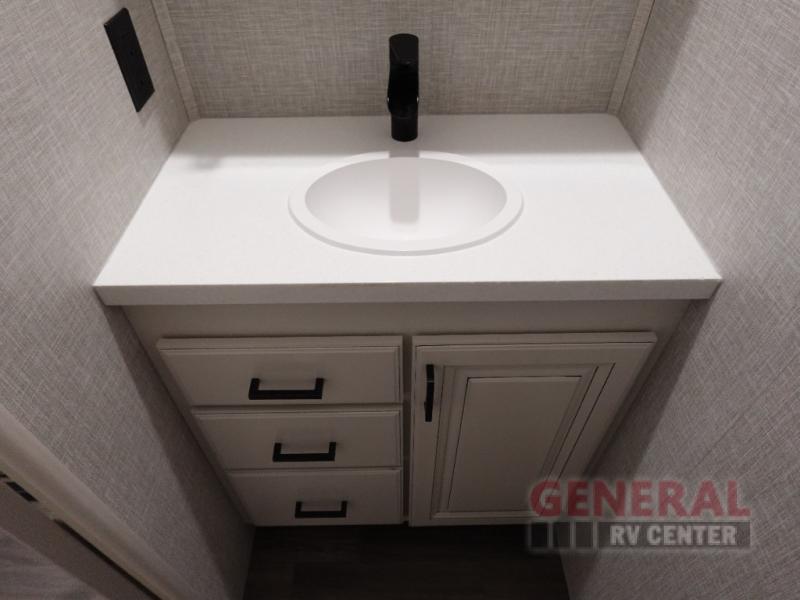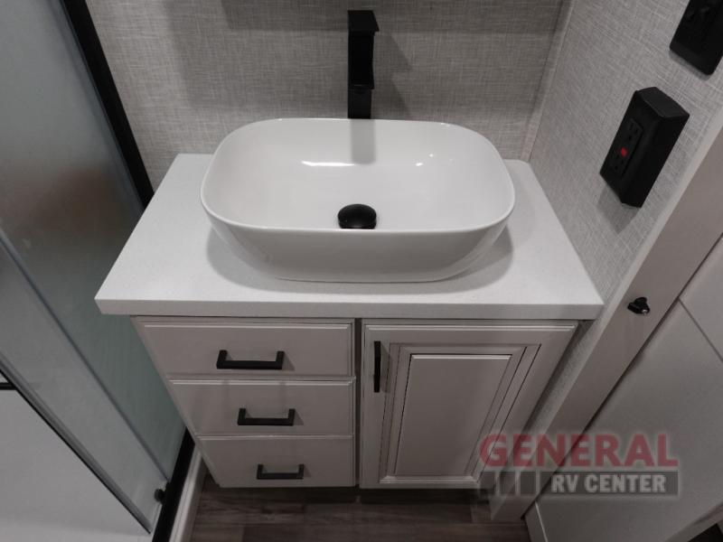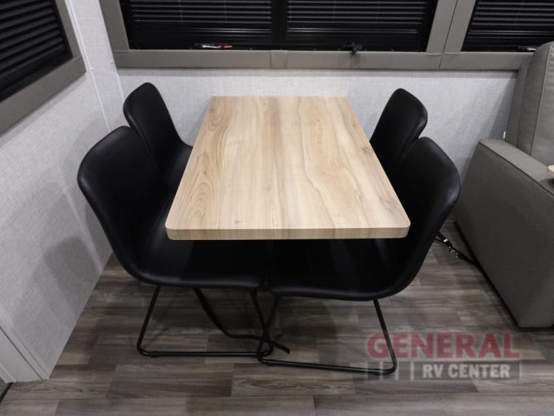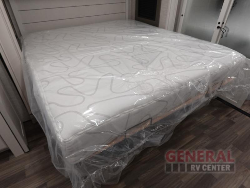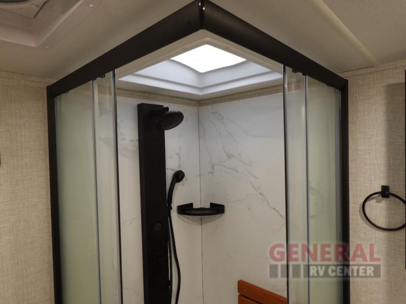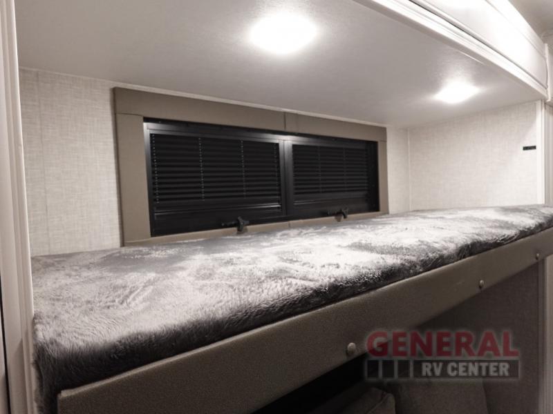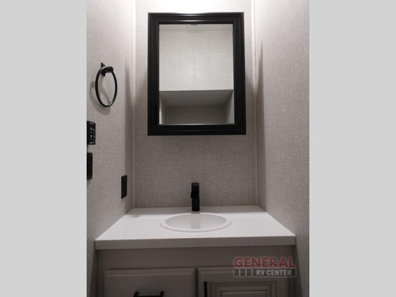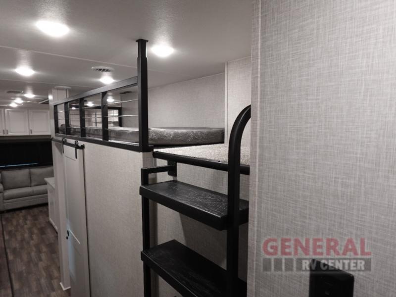 You won't even feel like you are camping in this fifth wheel! The rear living area features theater seats, as well as a tri-fold sofa with adjustable headrests. It's the perfect place to watch a movie with the Smart entertainment HDTV that has Bluetooth, soundbar, and built-in stereo, plus there is a cozy fireplace! The kitchen includes a full suite of GE residential appliances including a 4-burner range, a 21 cu. ft. refrigerator, and an over-the range microwave. Also, standard are a dishwasher and central vacuum system so cleaning up is easy! At night retire to the bedroom with its king bed with power base slide. A second TV lets you watch your favorite shows as you fall asleep. Storage abounds including a full wardrobe and dresser with pull-out top. A dual-entry full bath is easily accessible and includes even more storage with a linen closet. The second bedroom has slide that houses a flip-up bunk above a bi-fold sofa and a desk/dresser with overhead storage, and above it all is a loft for extra sleeping or storage space!