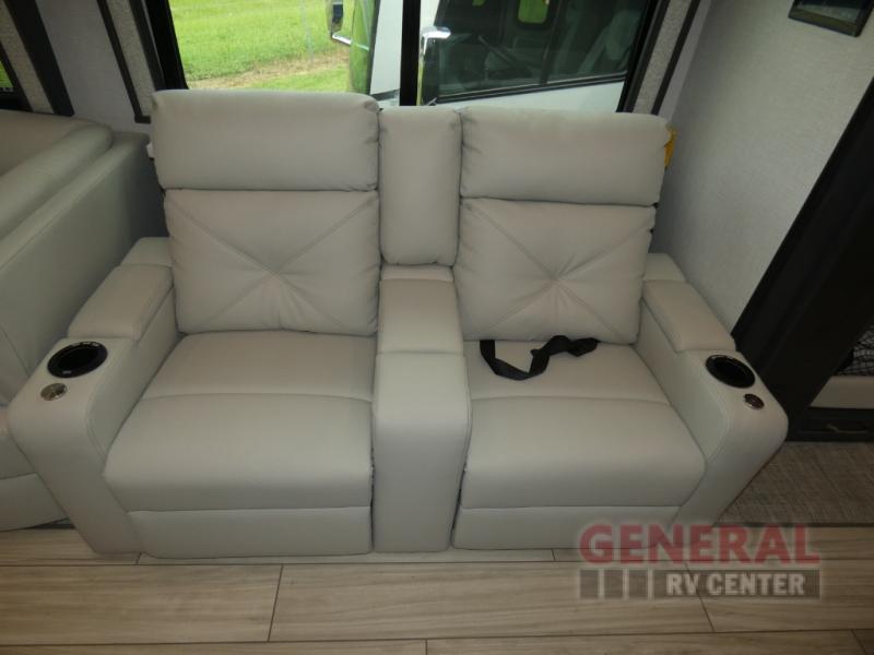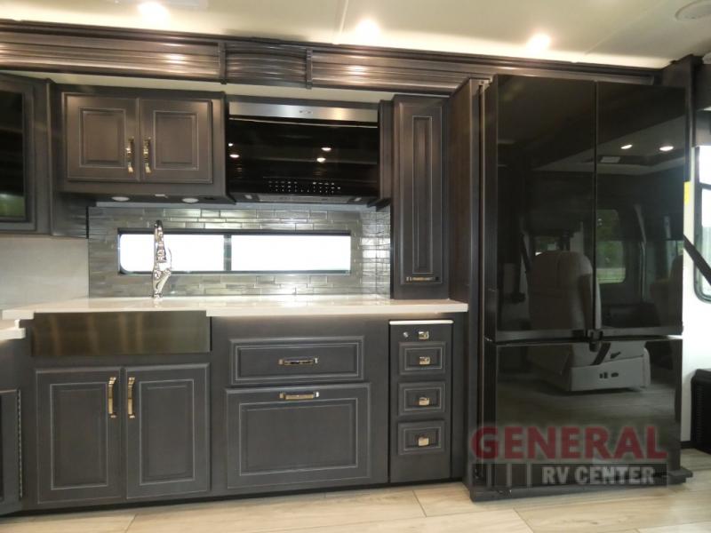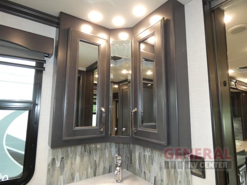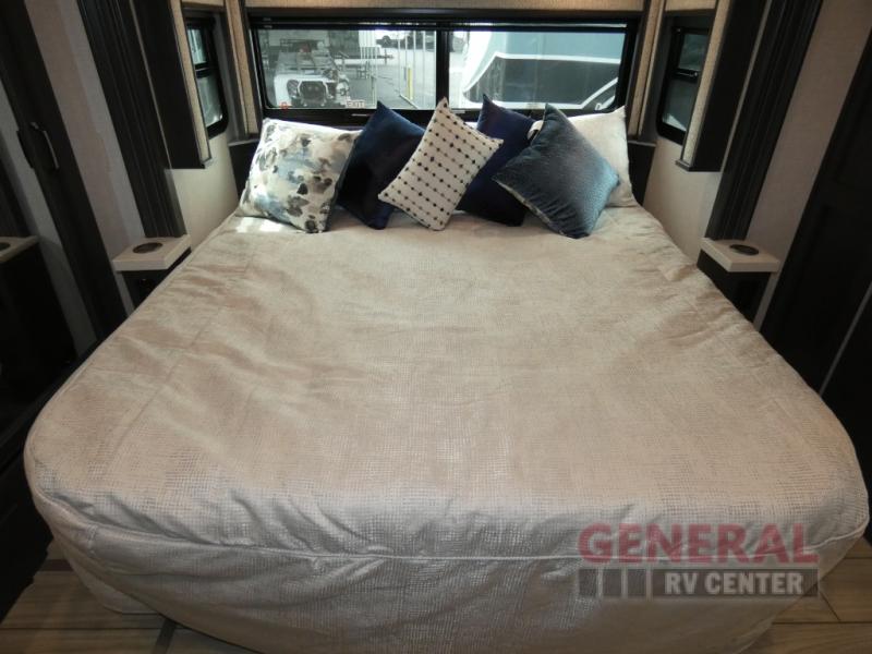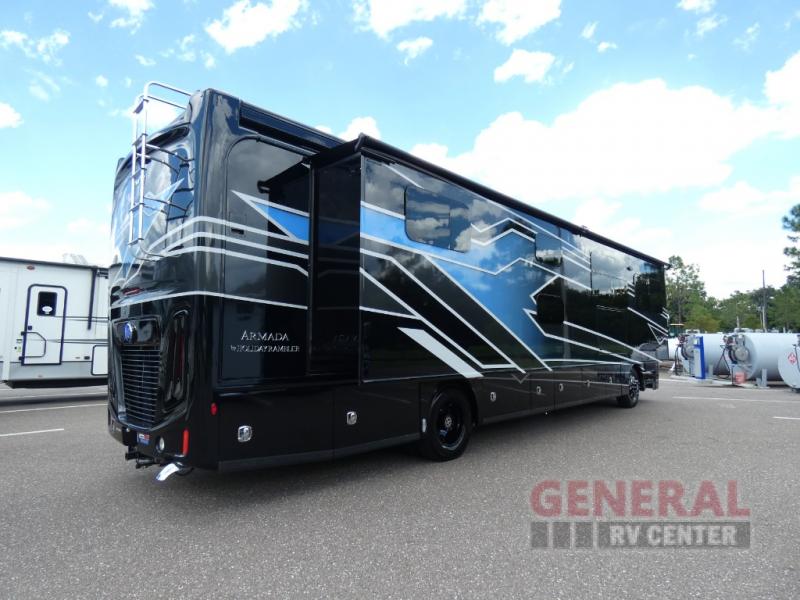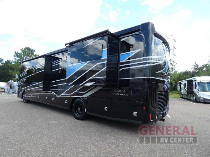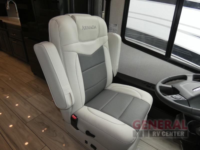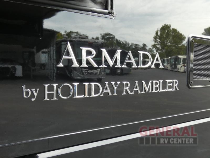 If you think glamping is the way to go, you're going to have to see what the Holiday Rambler Armada Class A diesel motorhome has in store for you! The Armada has been constructed Vacu-Bond floors, walls and ceiling with a Powerlock System for added durability, and there are new exterior paint options to choose from that are sure to turn heads. The exclusive Titan Bridge chassis system adds strength, increased storage, and enhanced performance so you can tackle the journey ahead of you. Head inside to enjoy many at-home comforts, such as heated tile flooring up front with optional heated tile flooring in the back, plus residential styled furniture by Apex Custom Furniture!