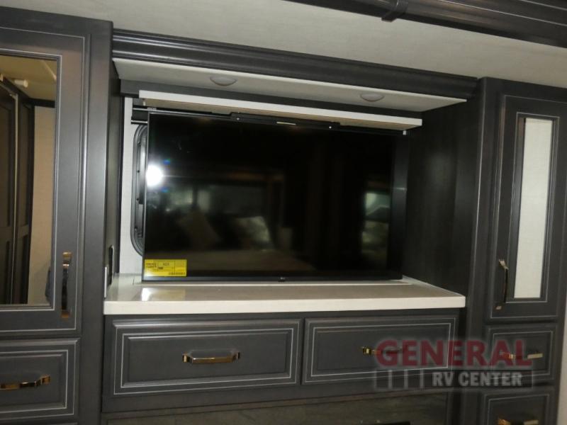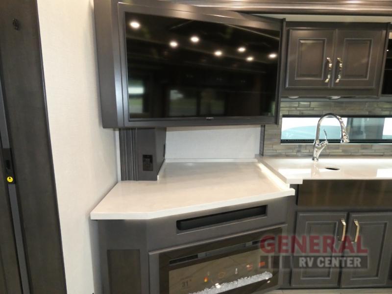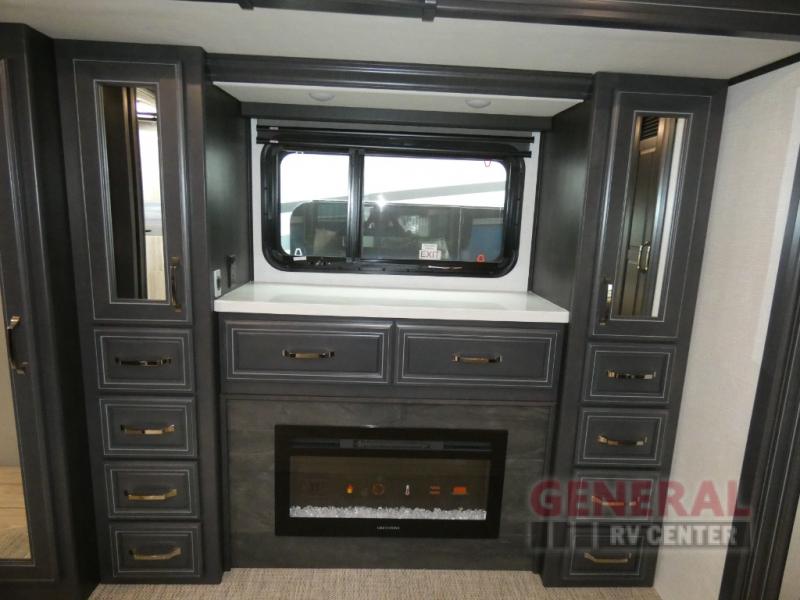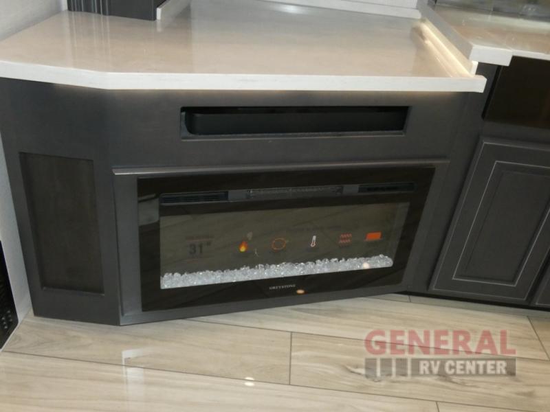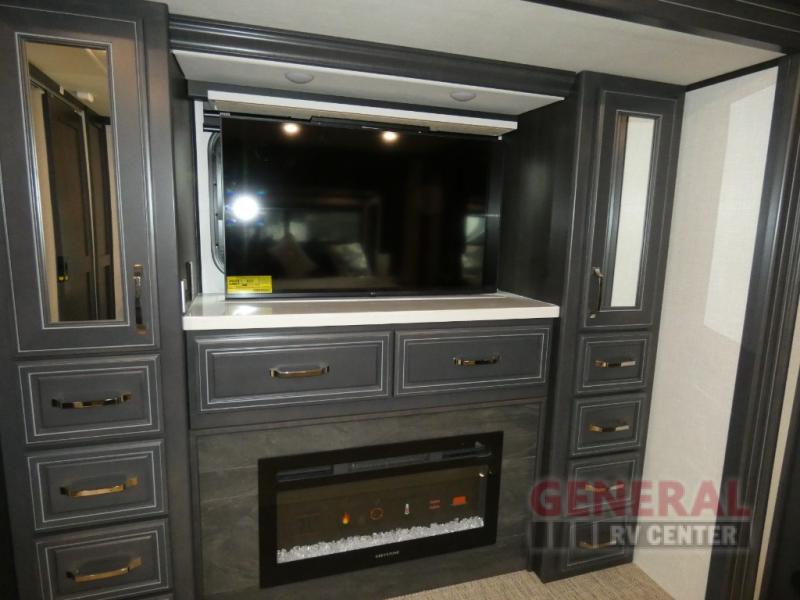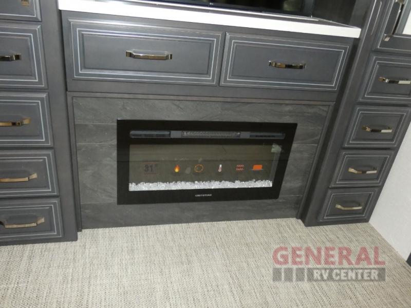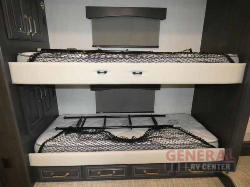 One look inside this spacious and luxury coach and you'll be hooked! Along with the full-wall slide, there are two additional slides for maximum space. Your crew can get comfortable on the sofa sleeper with a full-size mattress, or dine around the U-shaped dinette. The full kitchen includes everything you need to prepare meals each day, including a two burner induction cooktop, a stainless steel over-the-range convection microwave, and a residential refrigerator for food storage. And the dishwasher will make clean up a snap! You will love the spacious full bath that includes three entries and is right across from the bunk beds for the little ones. There are also two folding doors that can close off the bunks to make this a bunkhouse suite! The rear master bedroom will feel just like home with its king bed slide out, full length wardrobe, and a fireplace with storage. There are also two additional wardrobes plus a pop-up LED TV for movies in bed.