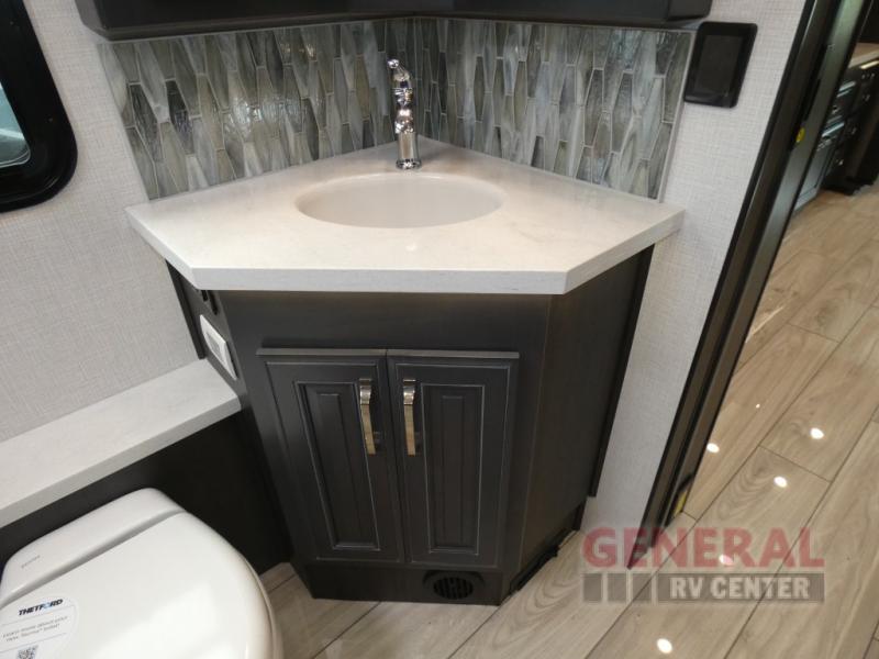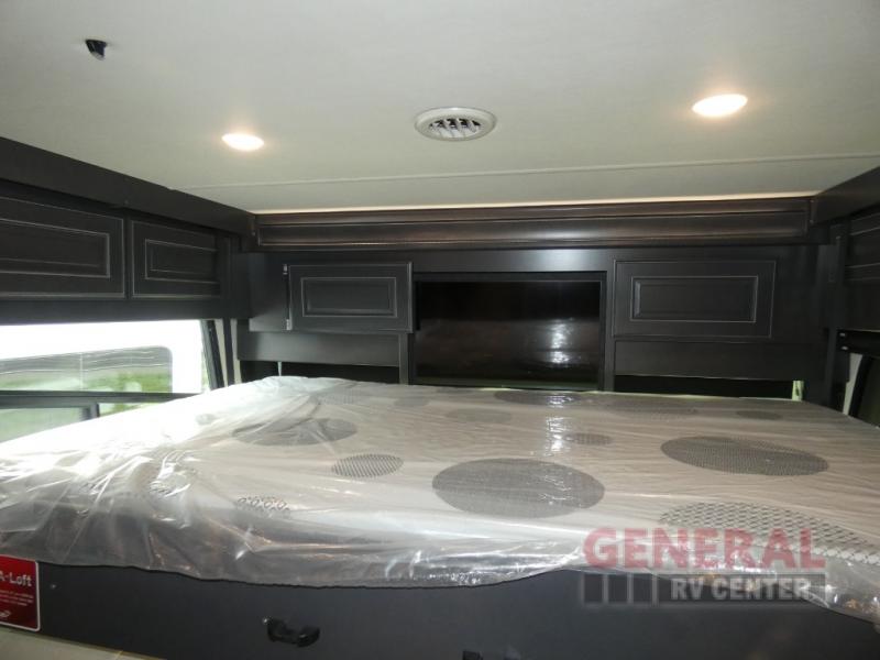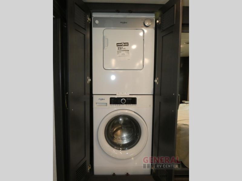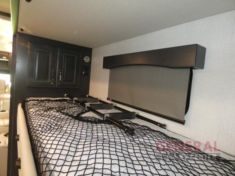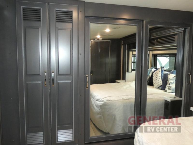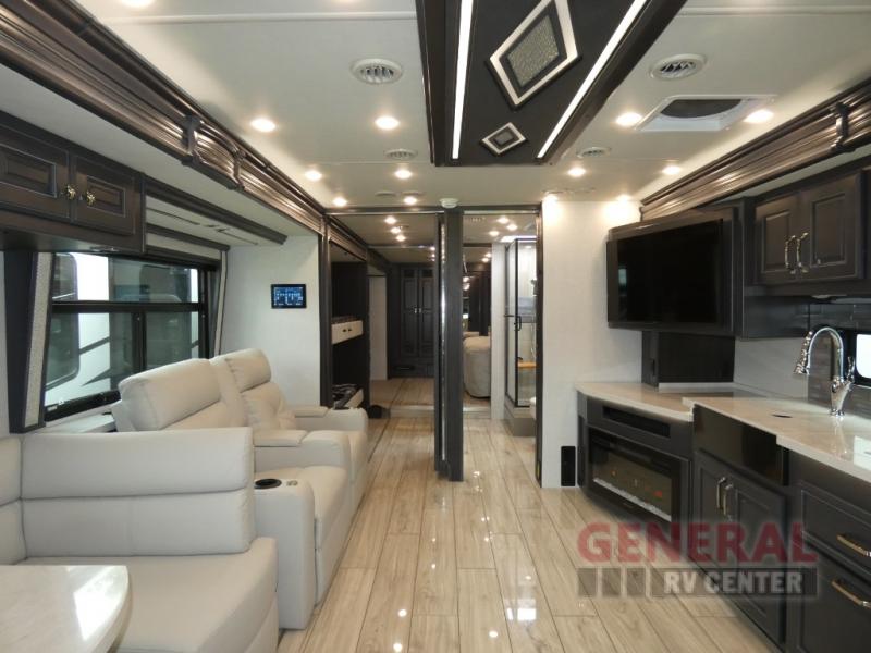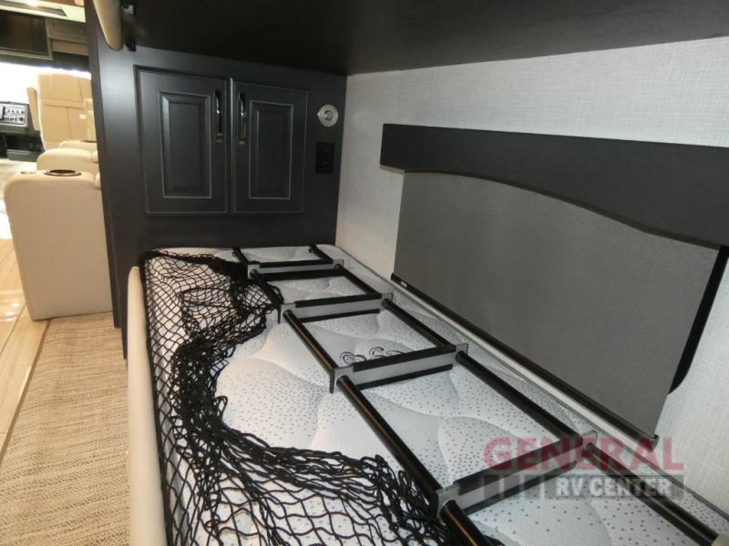 One look inside this spacious and luxury coach and you'll be hooked! Along with the full-wall slide, there are two additional slides for maximum space. Your crew can get comfortable on the sofa sleeper with a full-size mattress, or dine around the U-shaped dinette. The full kitchen includes everything you need to prepare meals each day, including a two burner induction cooktop, a stainless steel over-the-range convection microwave, and a residential refrigerator for food storage. And the dishwasher will make clean up a snap! You will love the spacious full bath that includes three entries and is right across from the bunk beds for the little ones. There are also two folding doors that can close off the bunks to make this a bunkhouse suite! The rear master bedroom will feel just like home with its king bed slide out, full length wardrobe, and a fireplace with storage. There are also two additional wardrobes plus a pop-up LED TV for movies in bed.