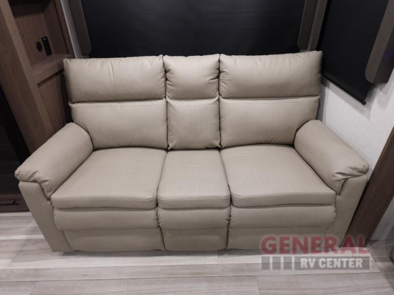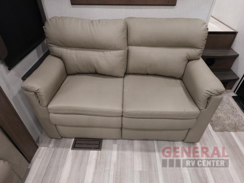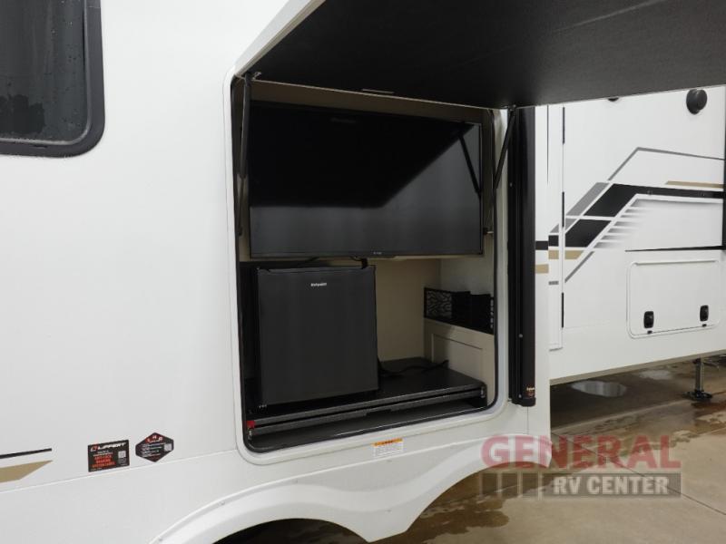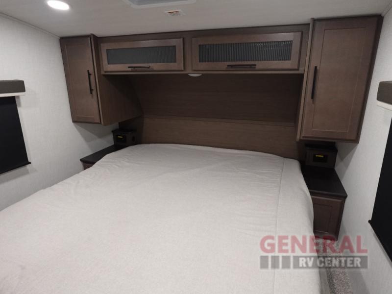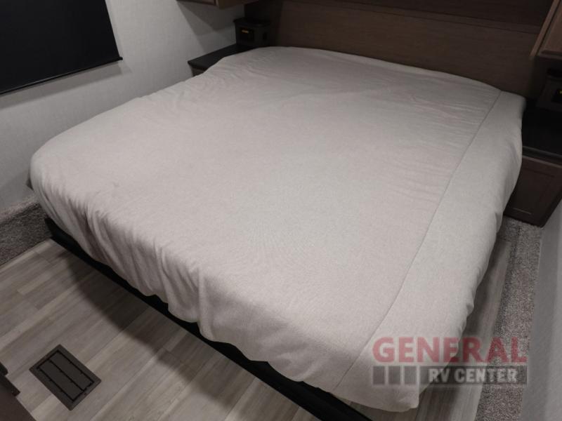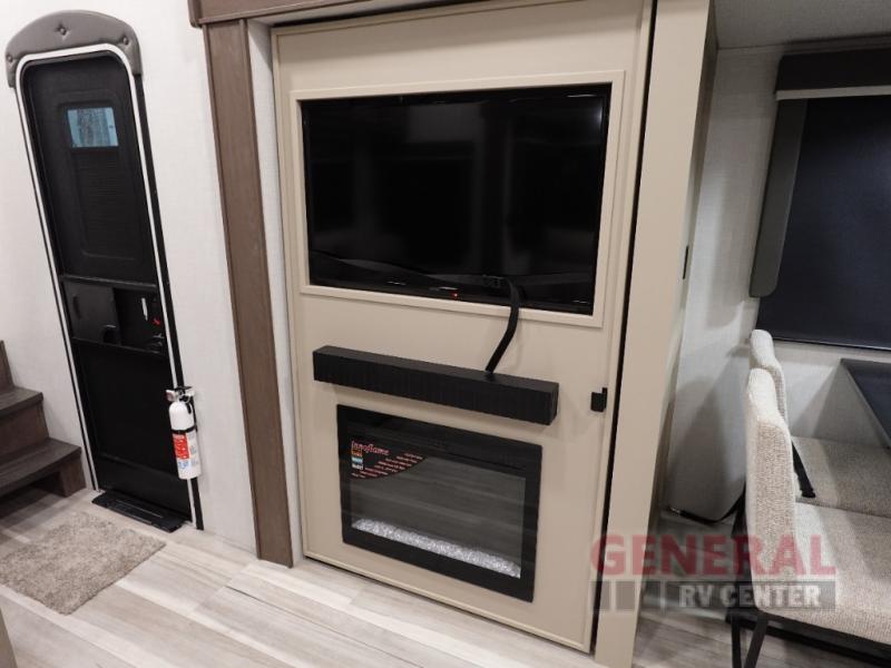 Time spent at the campground in this fifth wheel will be time well spent! Once you arrive, you can unload the unobstructed pass-thru storage, put out the two power awnings, and grab a cold drink from the outdoor mini refrigerator. Head inside to relax on the tri-fold sleeper sofa or theater seating across from the LED HDTV. The rear kitchen includes everything you need to make meals each day, including a pull-out countertop for more space plus a pantry and 12V refrigerator for food storage. The full bath with a 30" x 36" shower will let you freshen up before bed, and speaking of bedtime, the king bed in the front private bedroom is sure to bring a great night's rest. There are also dual wardrobes and nightstands here for your things, plus a third wardrobe with washer and dryer prep if you want to add these appliances.