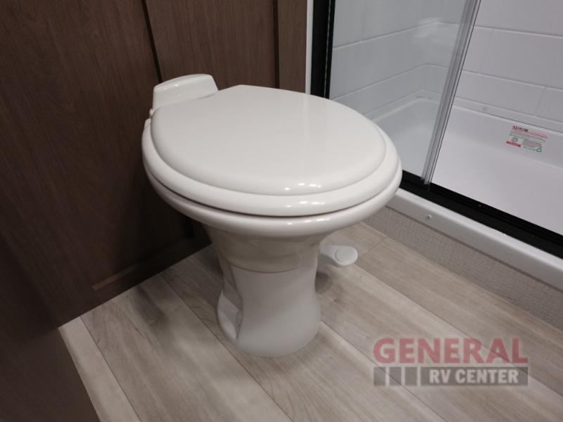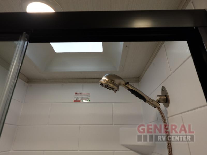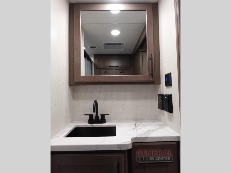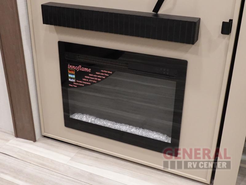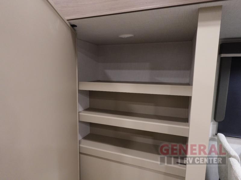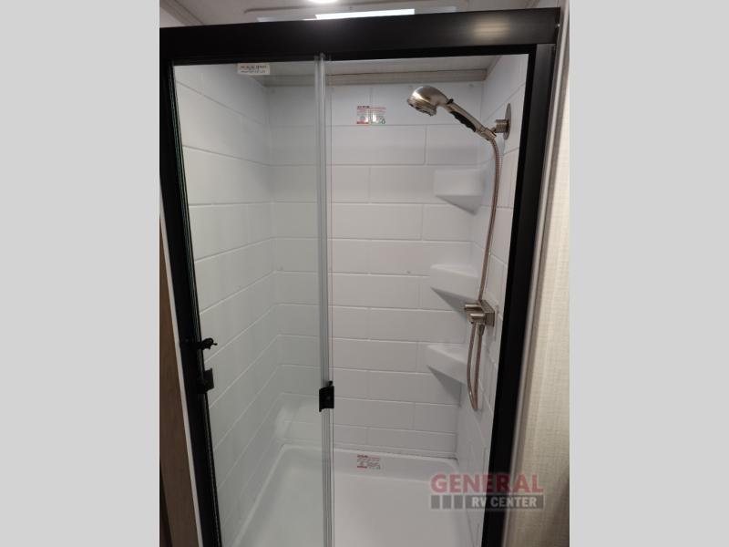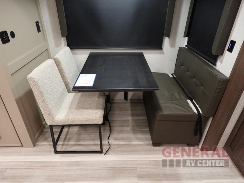 Time spent at the campground in this fifth wheel will be time well spent! Once you arrive, you can unload the unobstructed pass-thru storage, put out the two power awnings, and grab a cold drink from the outdoor mini refrigerator. Head inside to relax on the tri-fold sleeper sofa or theater seating across from the LED HDTV. The rear kitchen includes everything you need to make meals each day, including a pull-out countertop for more space plus a pantry and 12V refrigerator for food storage. The full bath with a 30" x 36" shower will let you freshen up before bed, and speaking of bedtime, the king bed in the front private bedroom is sure to bring a great night's rest. There are also dual wardrobes and nightstands here for your things, plus a third wardrobe with washer and dryer prep if you want to add these appliances.