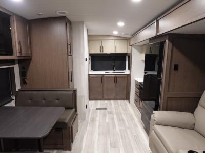With a king-size bed, this Cougar Half-Ton travel trailer shows that you can still be comfortable even while you're away from home! The bed has drawers and nightstands on either side to keep your belongings tidy. There is a convenient shoe cubby right as you enter the unit to keep this space picked up as well. Right next to the booth dinette is the pantry, and next to the pantry is the full bathroom which is certainly one of the most valuable features to any trailer.