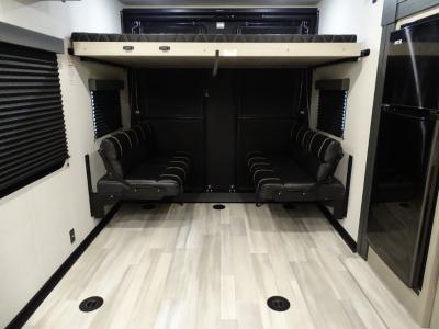 This open concept toy hauler is sure to meet all of your needs. There is a slide out for more space, a full kitchen with a Furrion three burner gas range and a microwave oven to prepare meals, plus a 10 cu. ft. 12V refrigerator to keep food fresh. You'll find comfortable seating space on the dual opposing sofas with a top queen bed, and there is TV prep if you want to add some entertainment. The RV queen bed in the front master bedroom will bring a great night's rest, and the full bath lets you clean up after trail riding. When you're ready to head home, the 15' garage area includes frame welded tie downs to keep your toys secure.